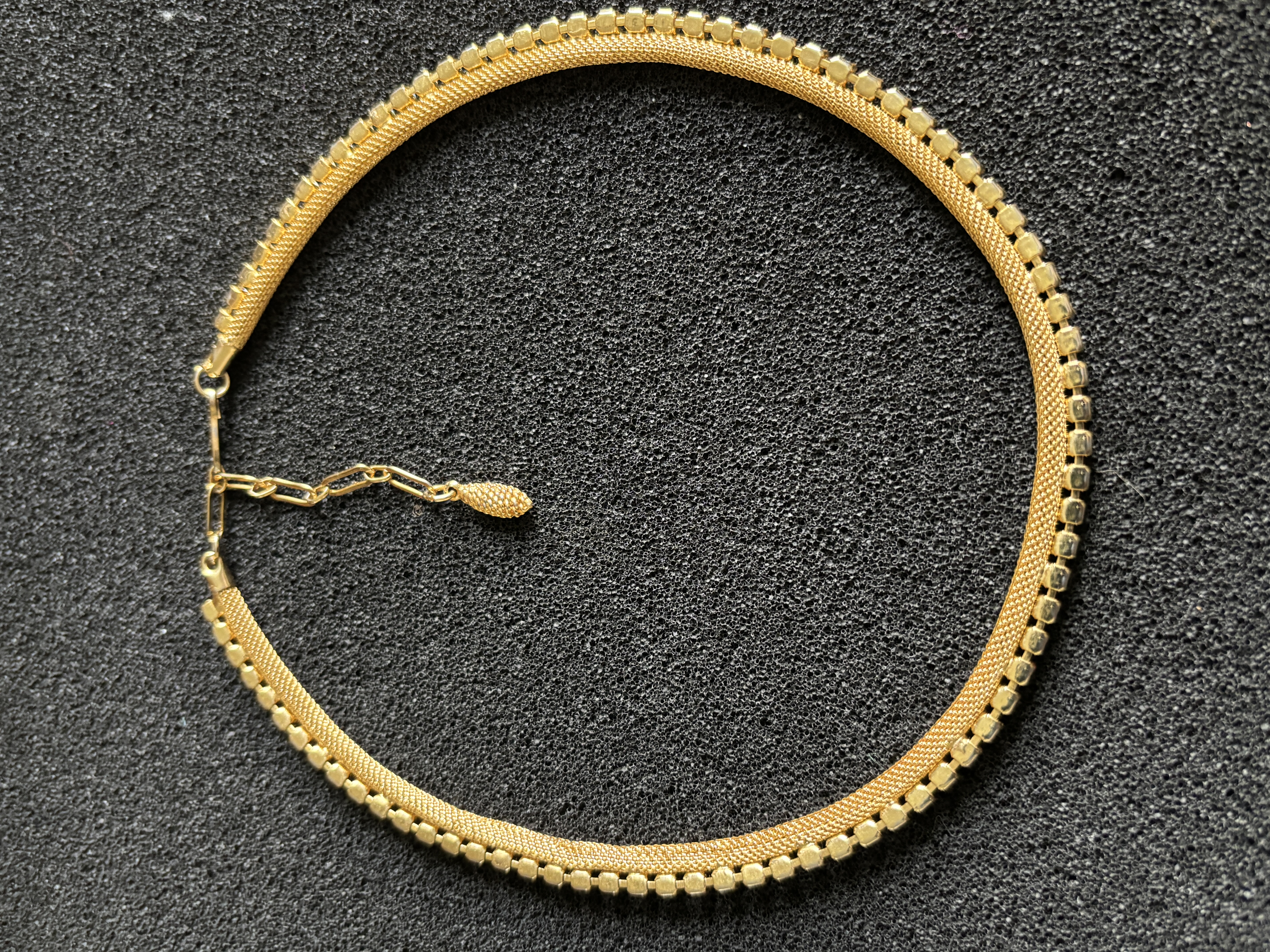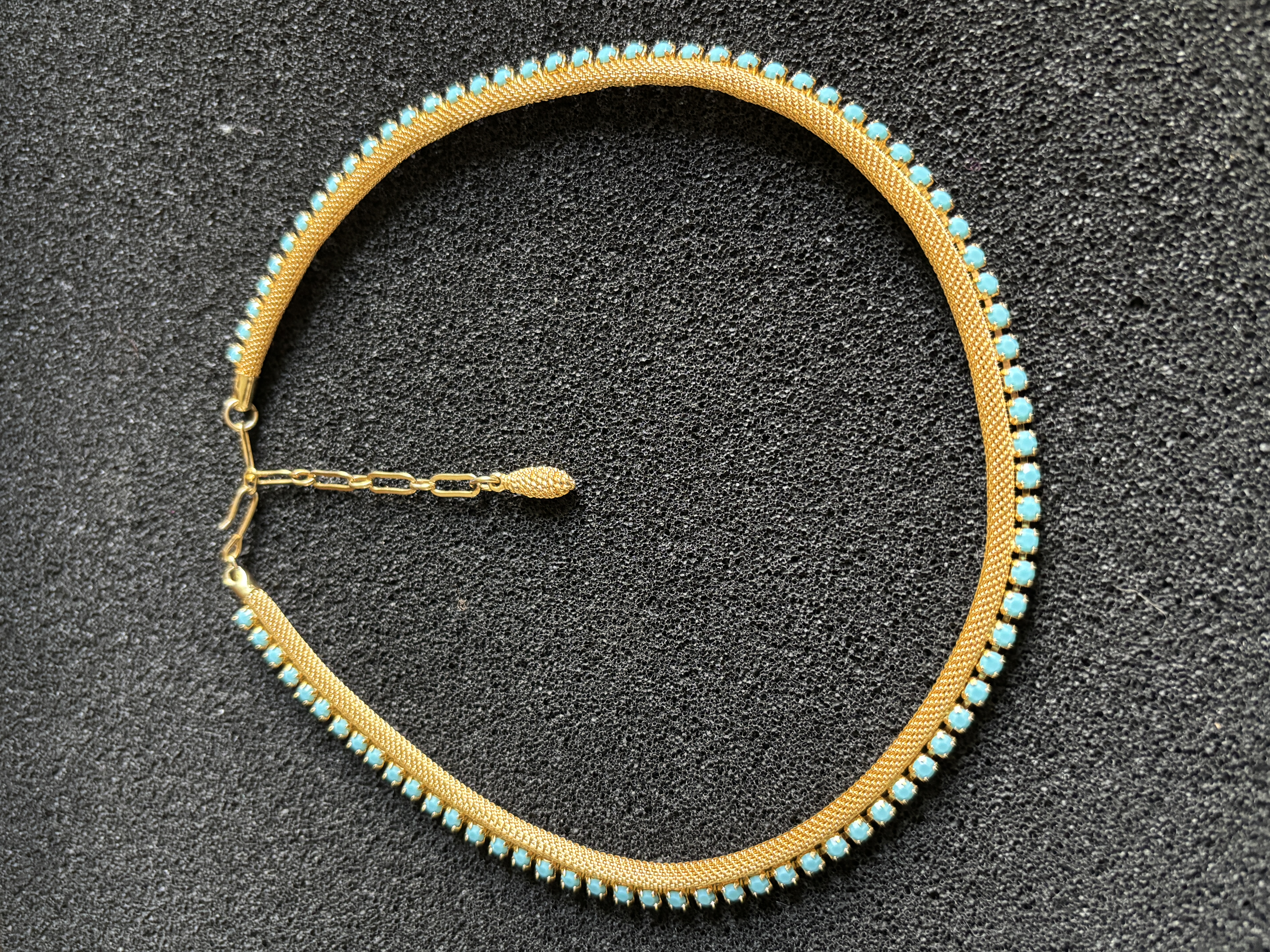 A yellow metal necklace having hook clasp and turquoise colored stones
