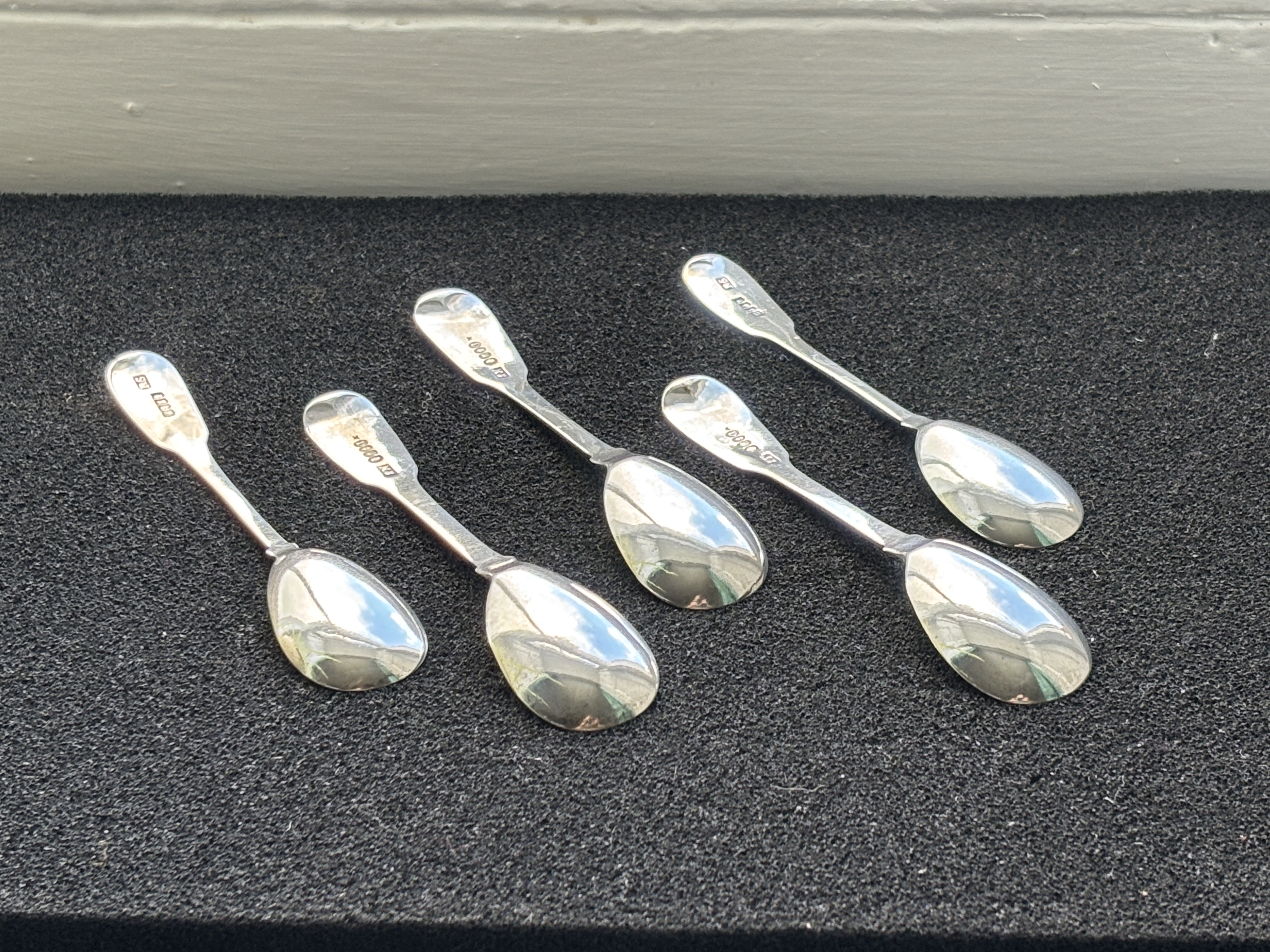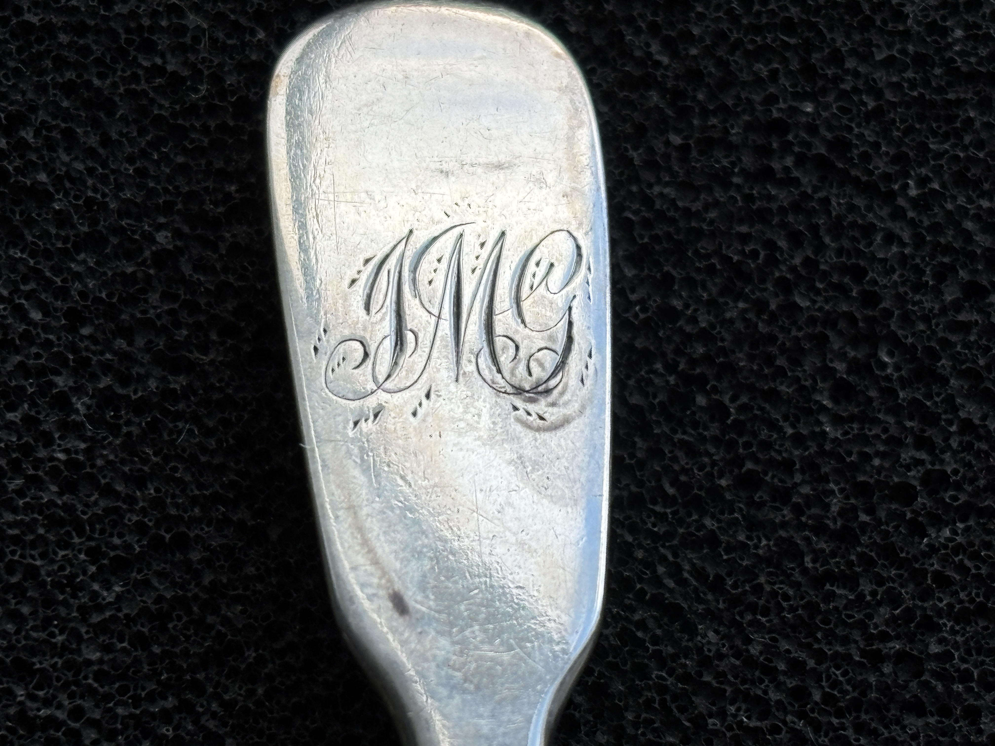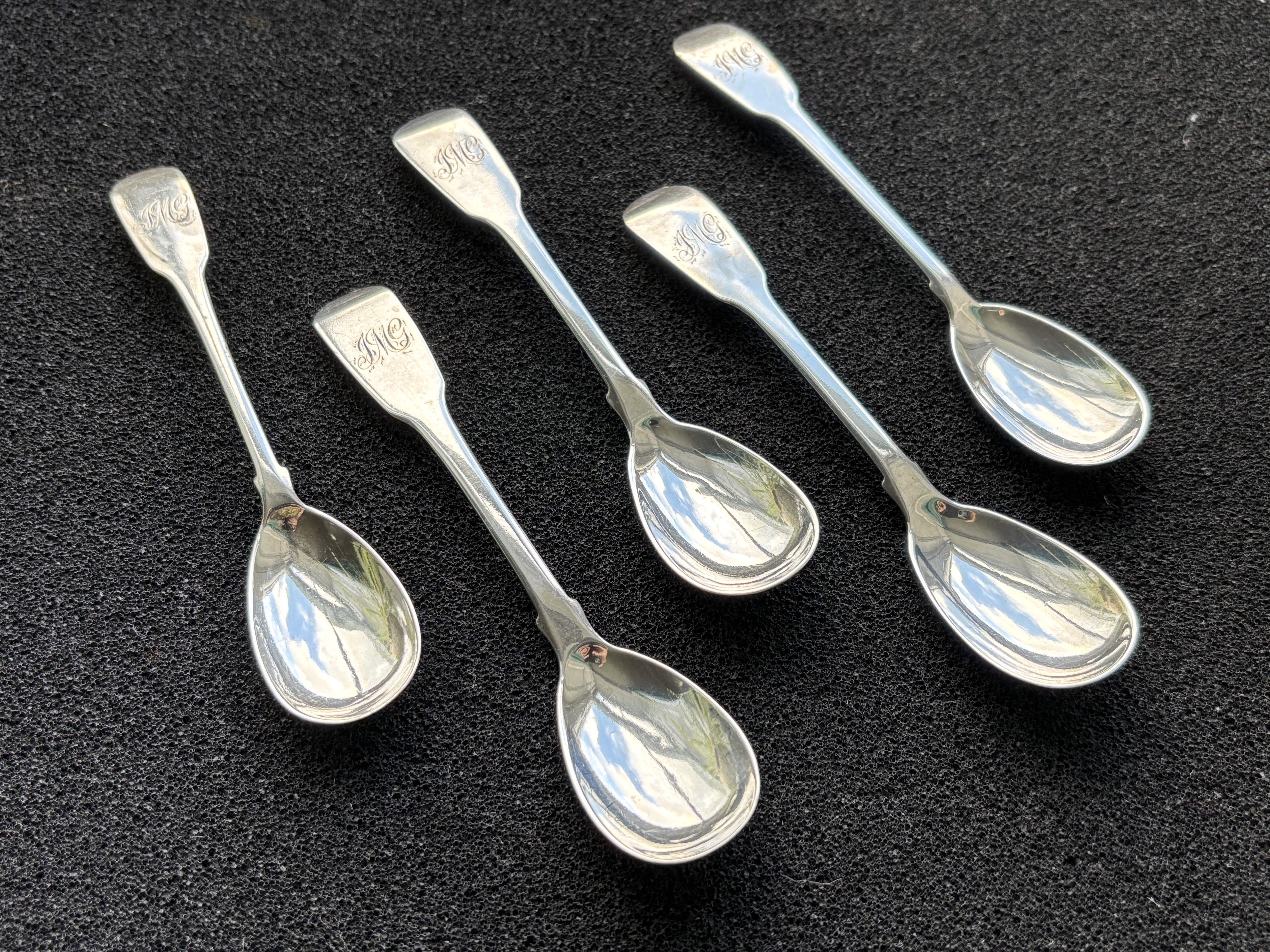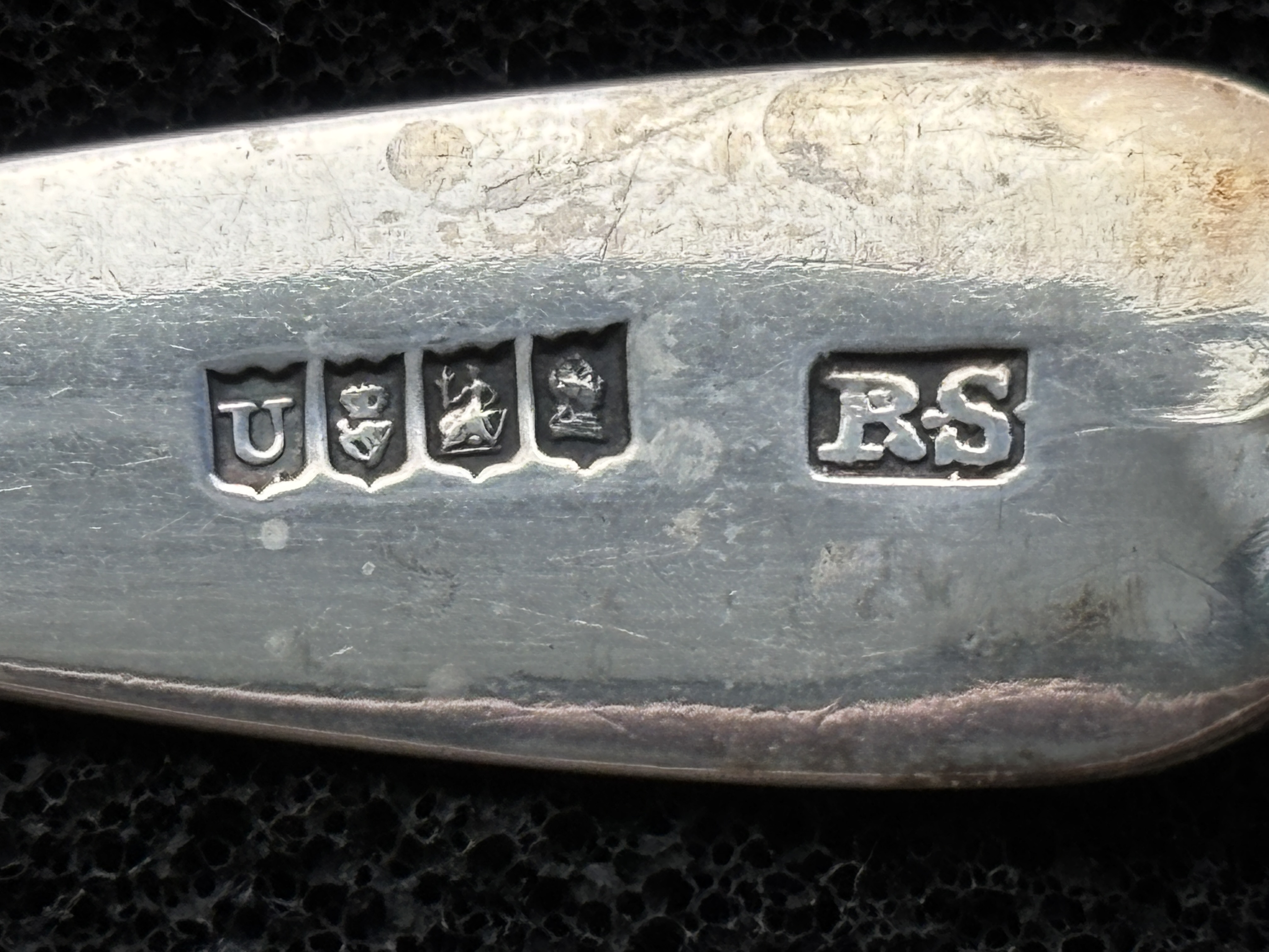 A set of five monogrammed Irish silver tea spoons, Dublin 1816, possibly Richard Sawyer, weighing 74.78 gm