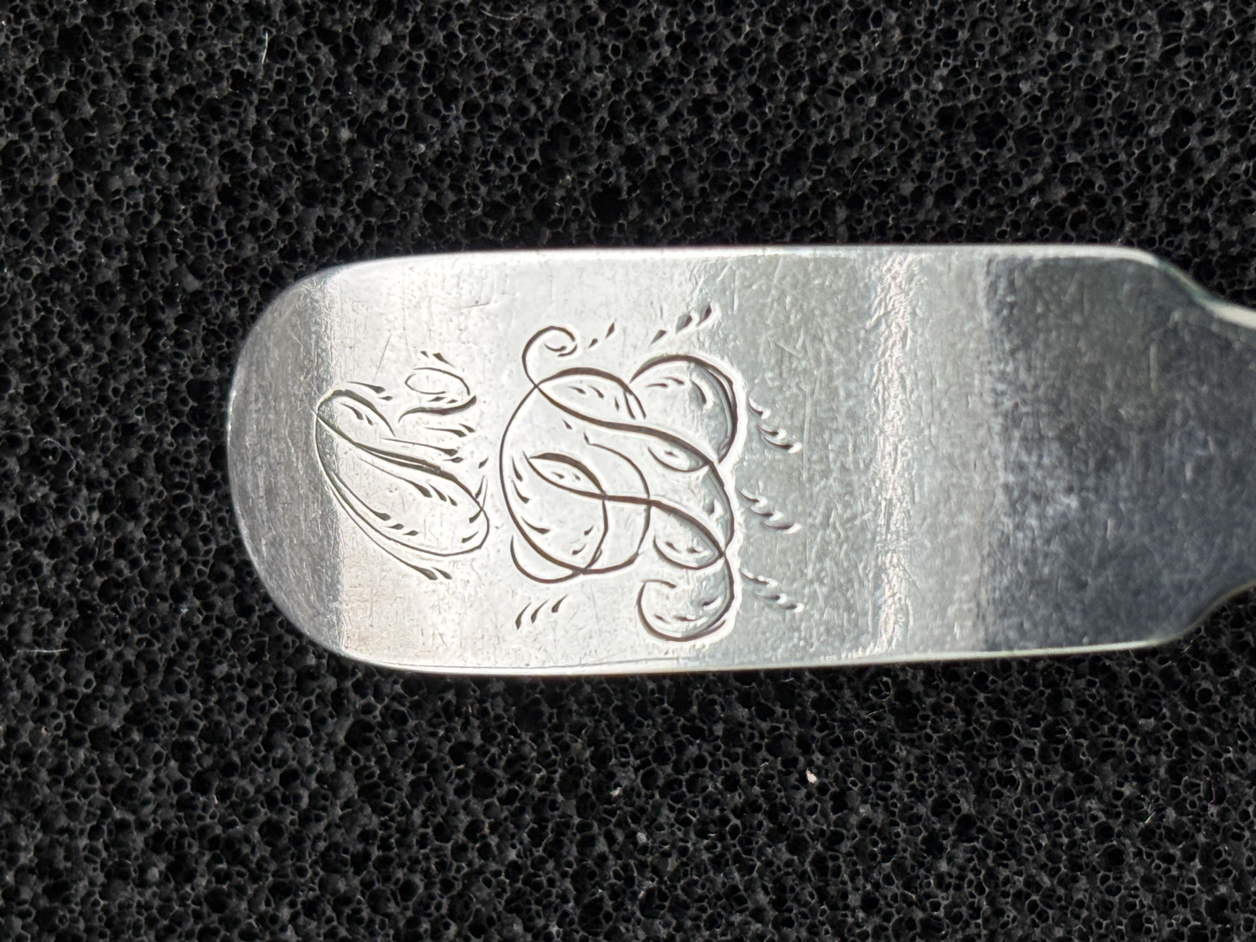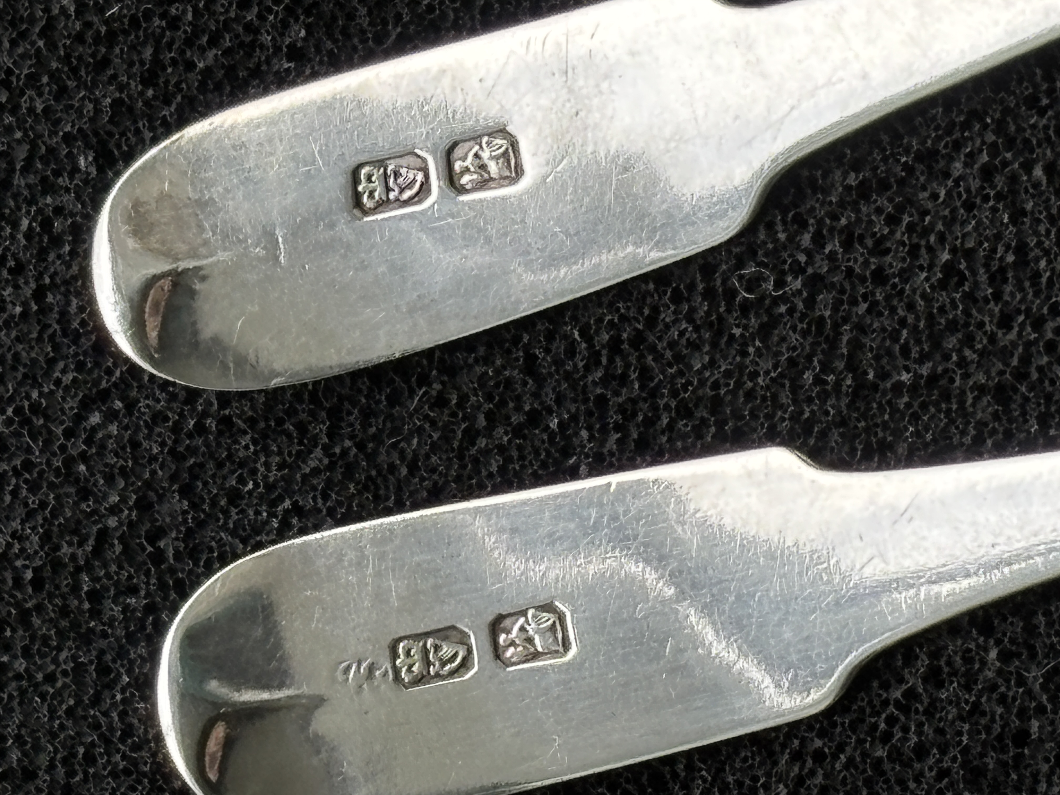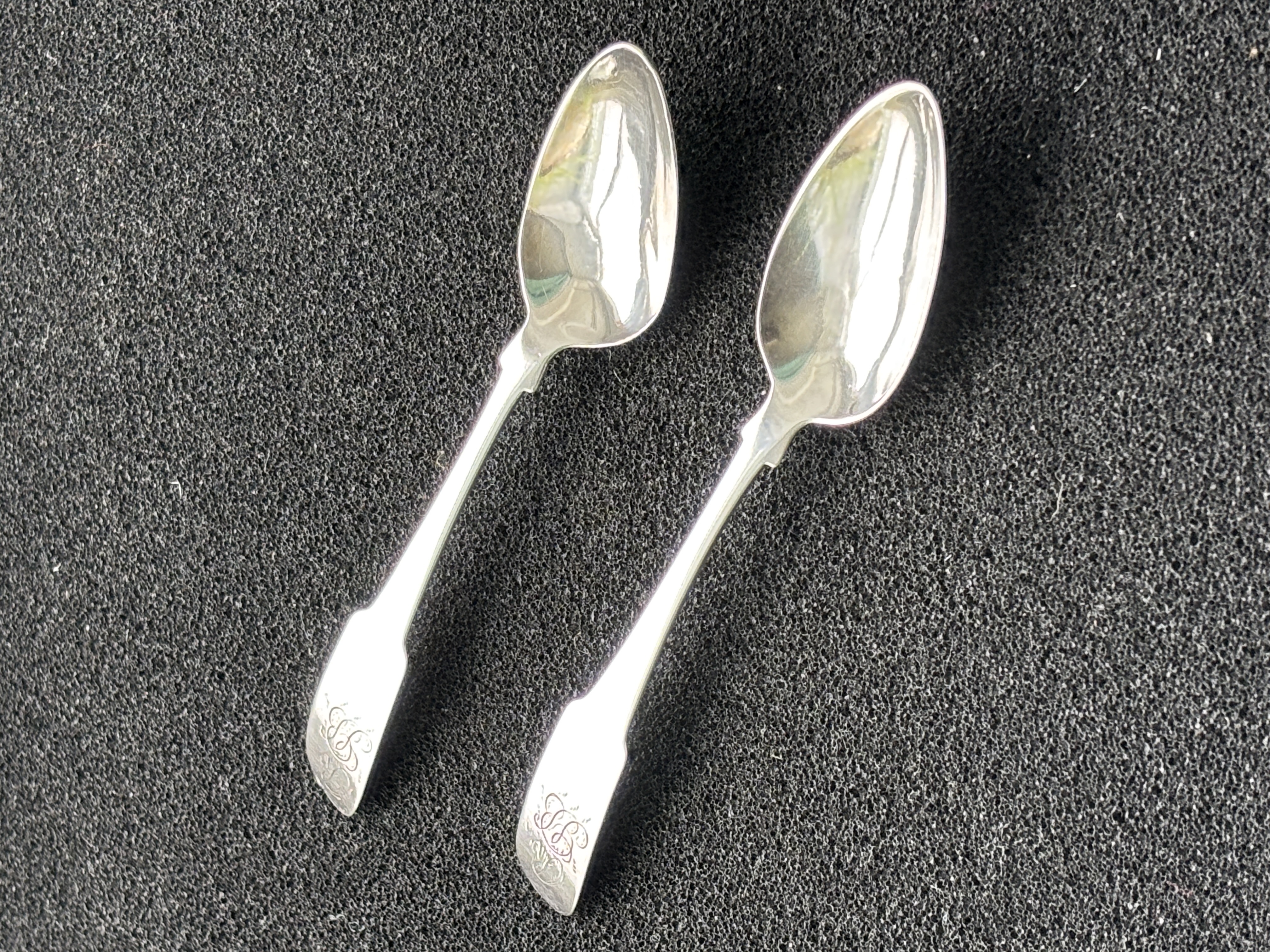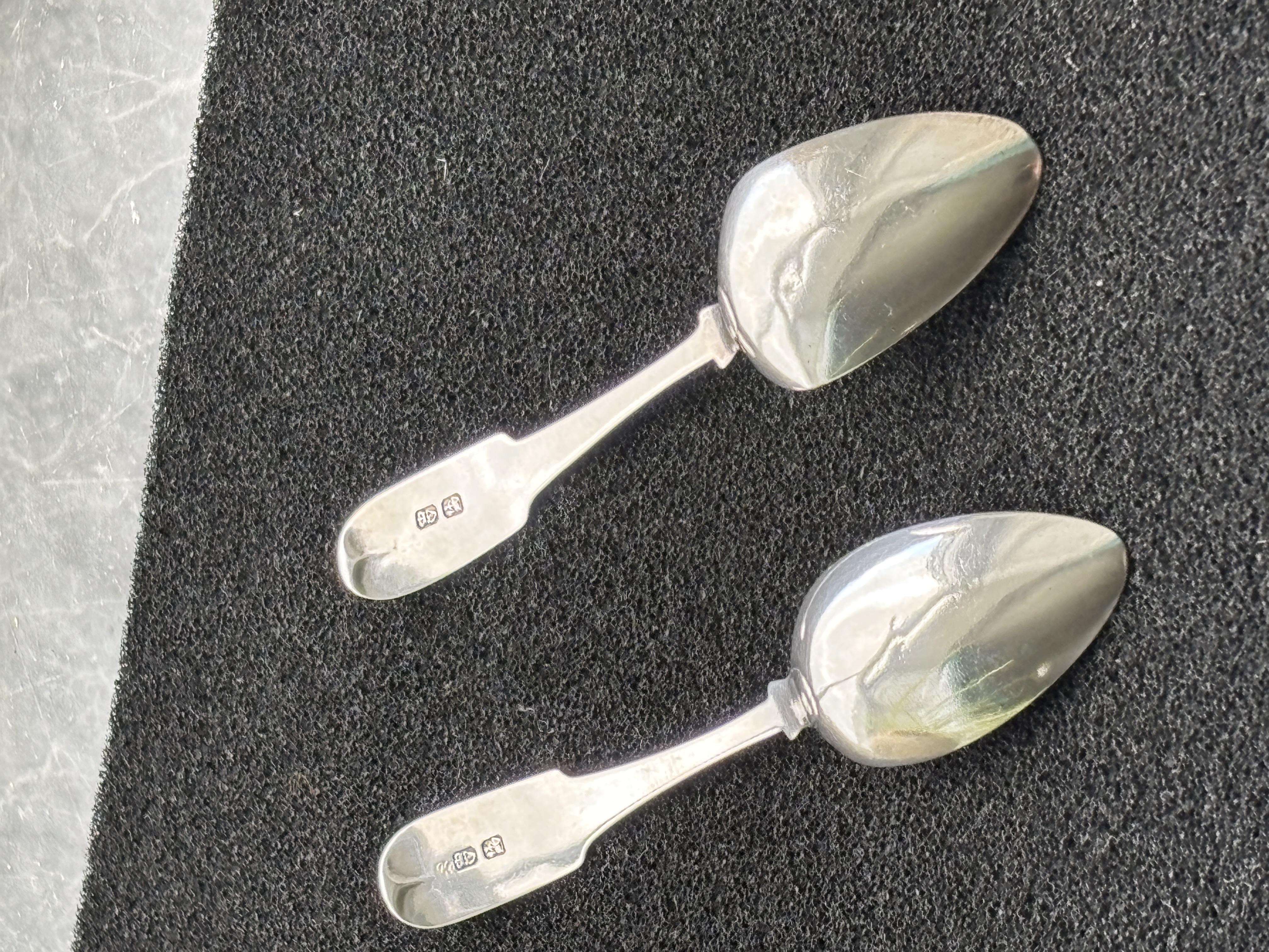 A pair of monogrammed Irish silver tea spoons, weighing 31.04 gm