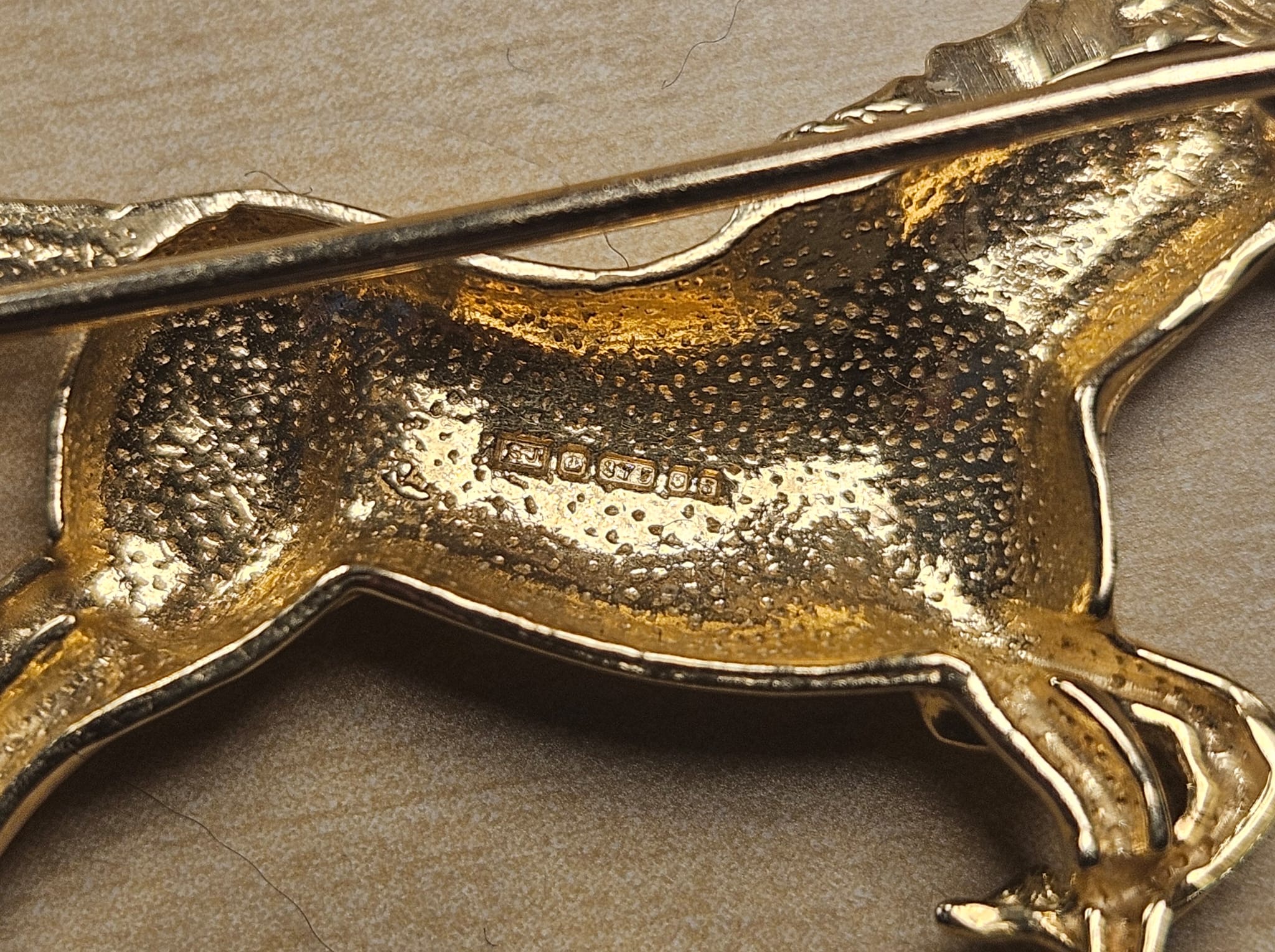 A 9ct gold brooch, modelled as a prancing...