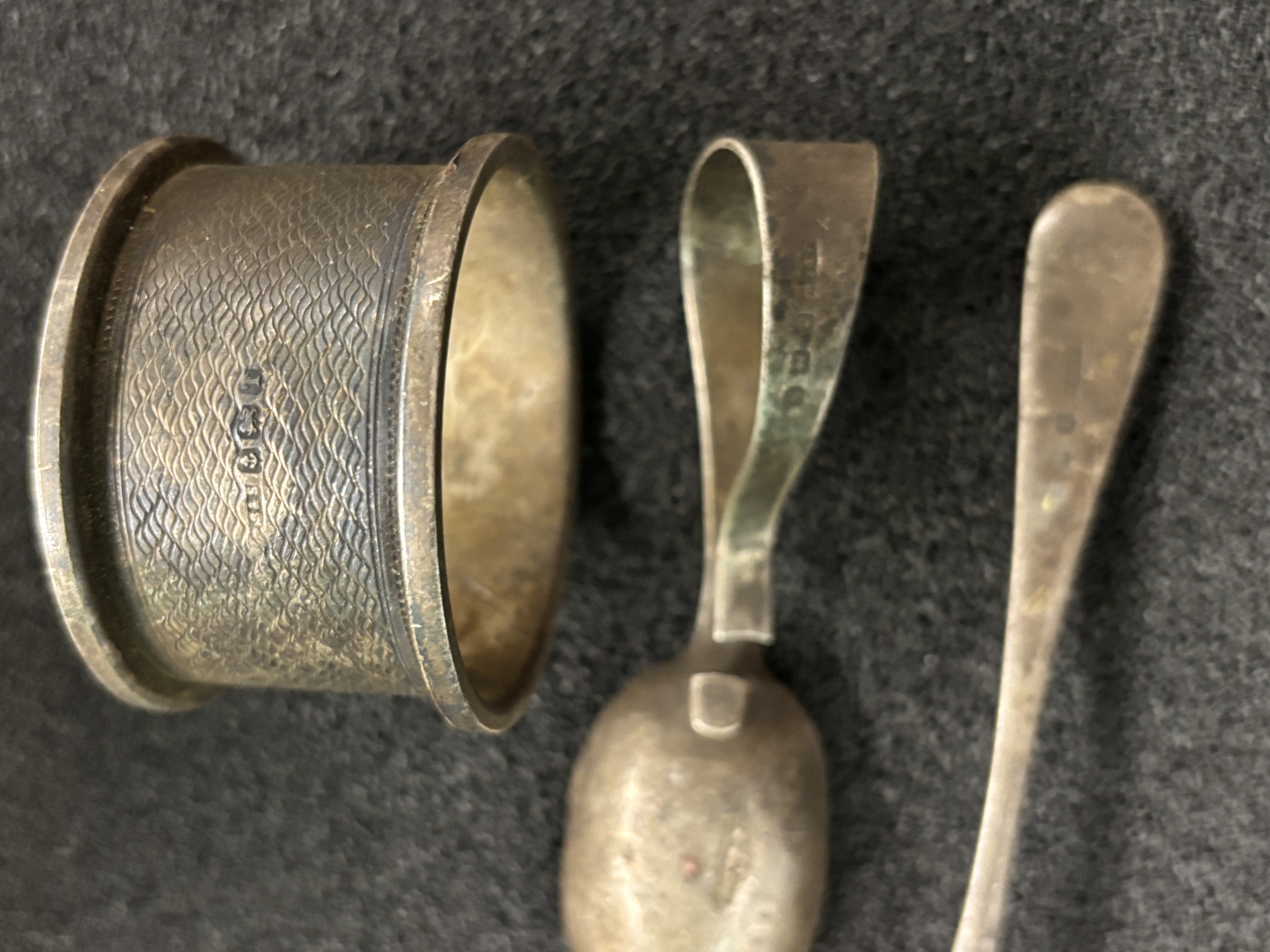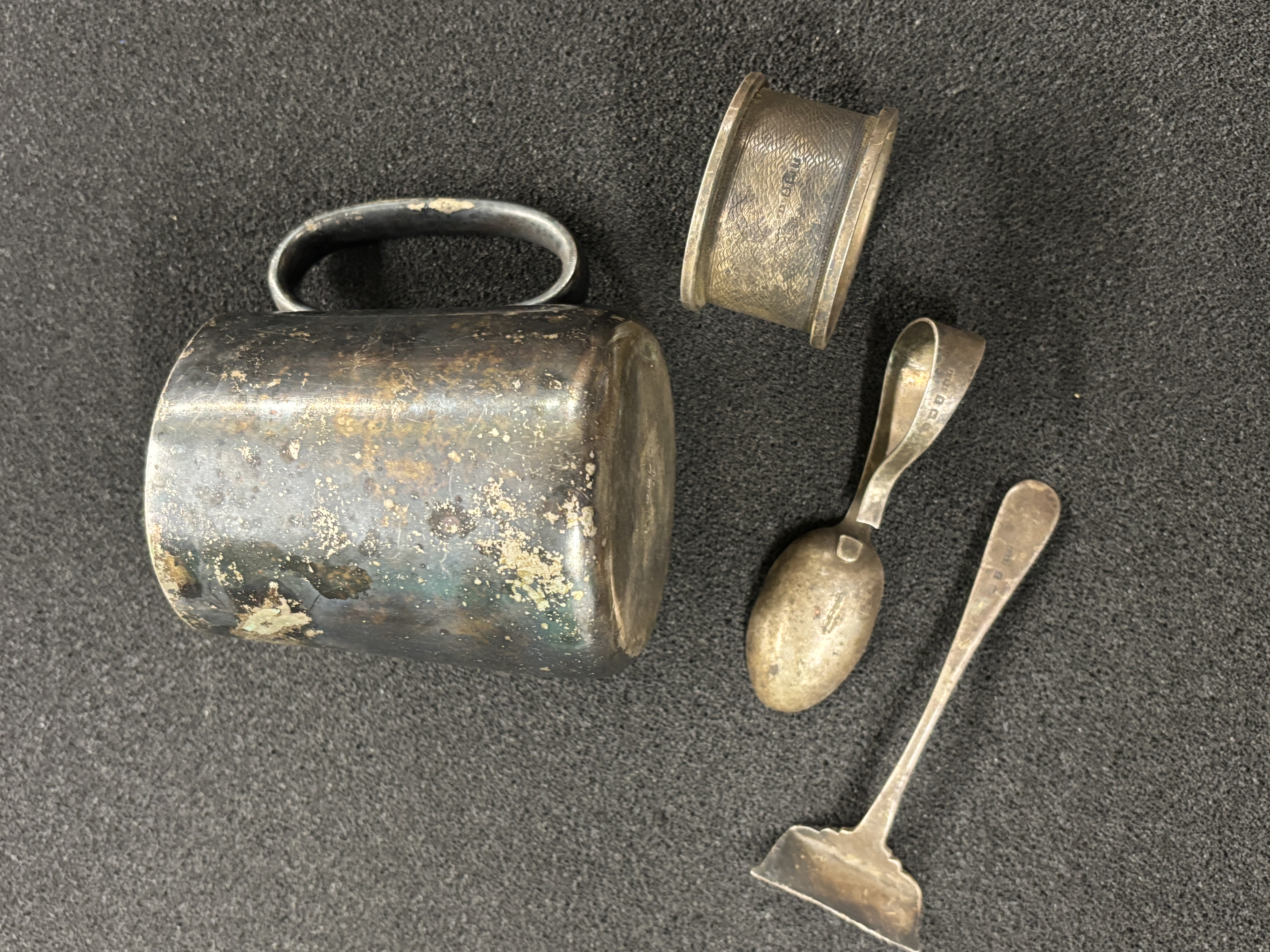 A christening set from 1943 comprising Hallmarked napkins ring, pusher and spoon (a/f) weighing 47.57 gm together with a plated christening mug.
