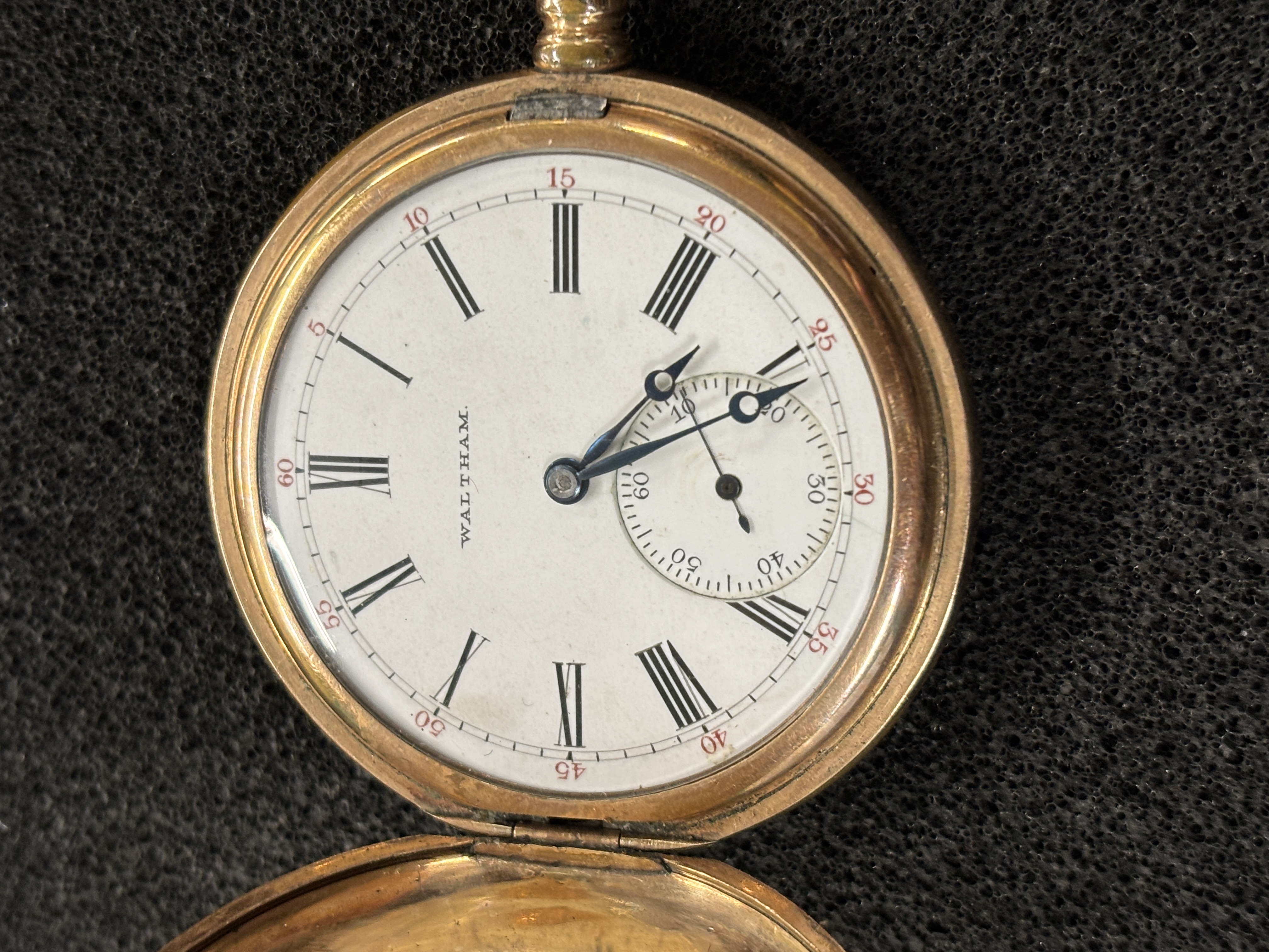 A gold filled Waltham full Hunter pocket watch is seen working