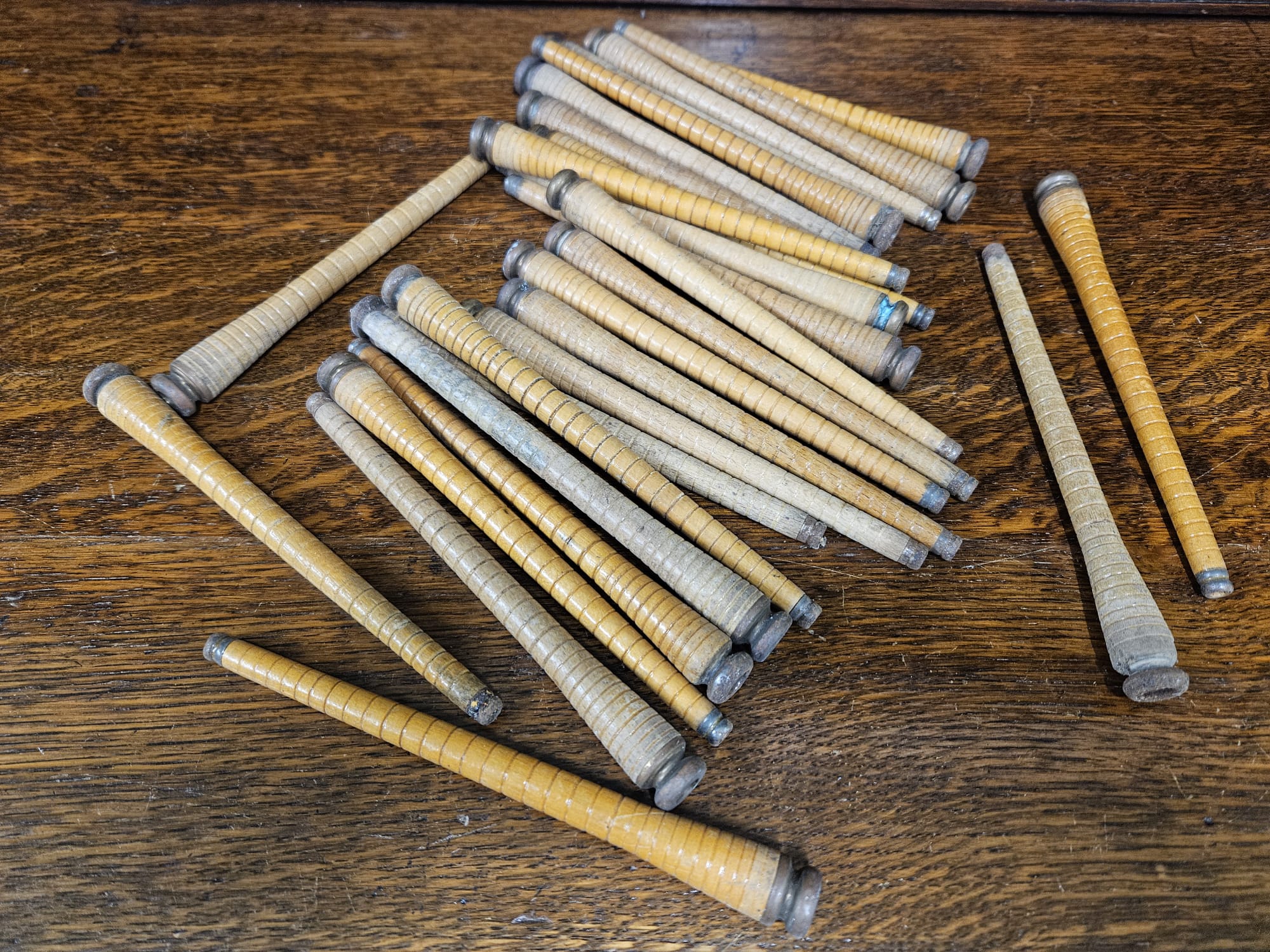 An assortment of vintage turned wood pirns, from a Lancashire cotton mill