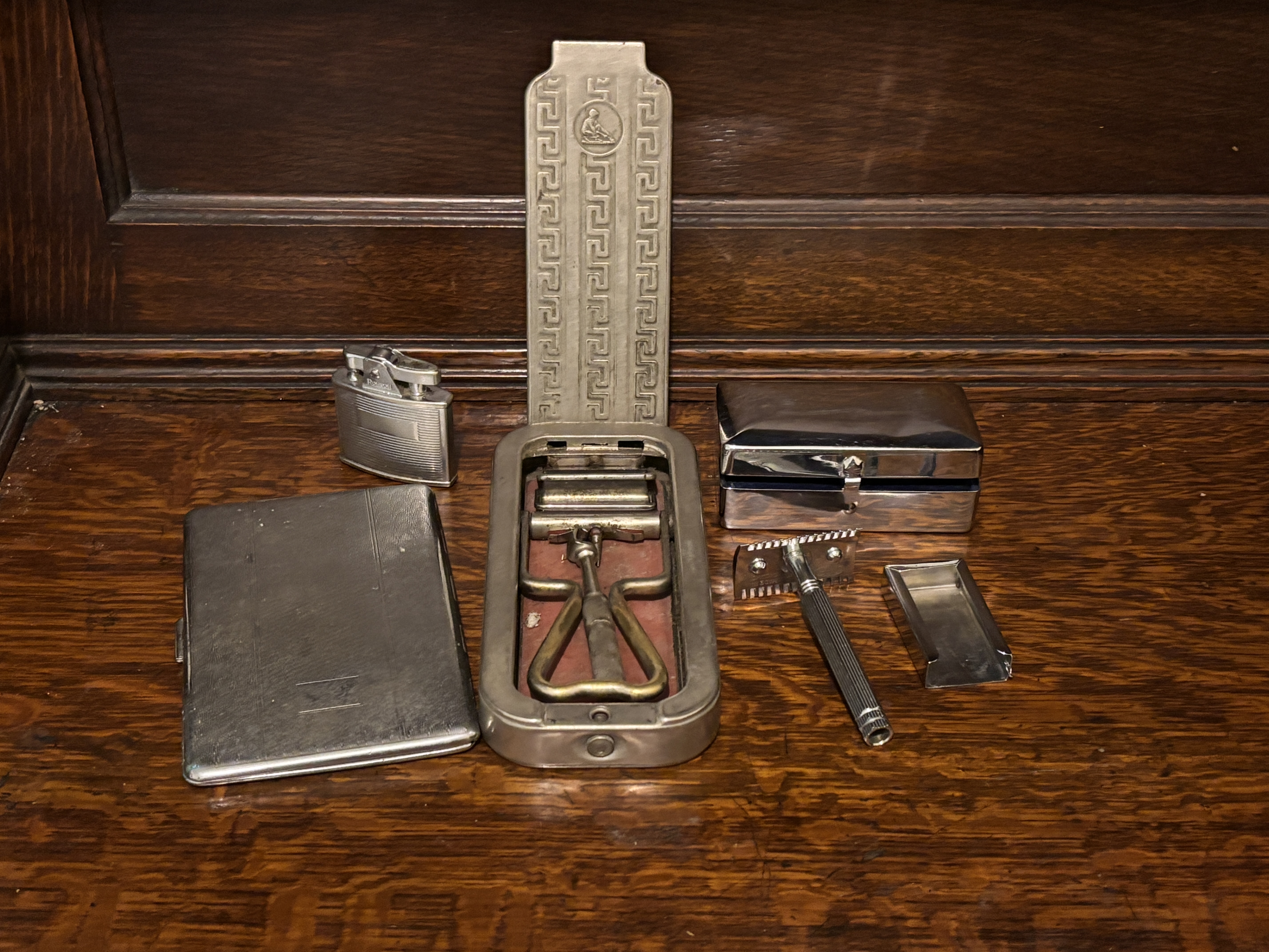 Two boxed razors, cigarette case and Ronson lighter