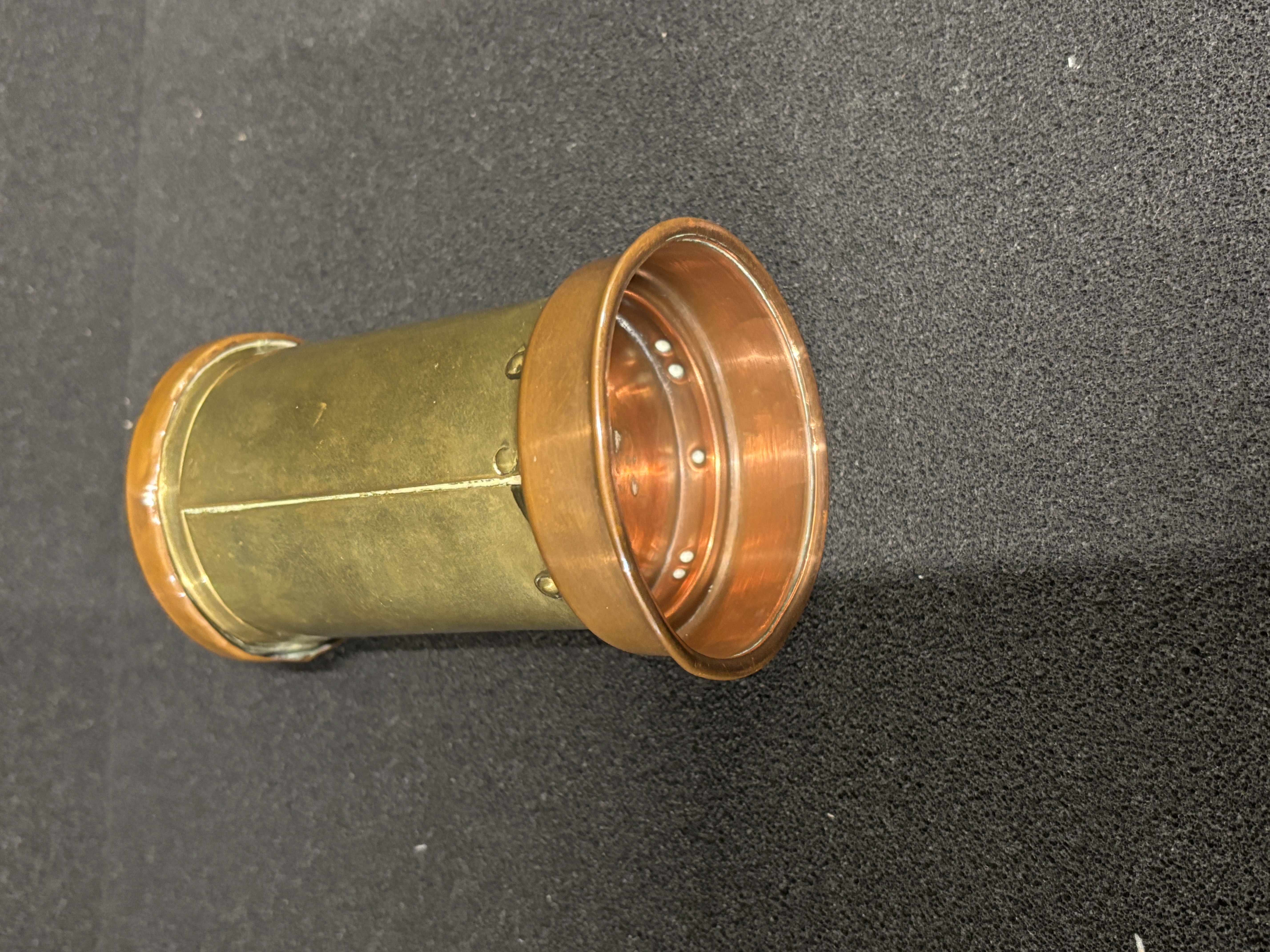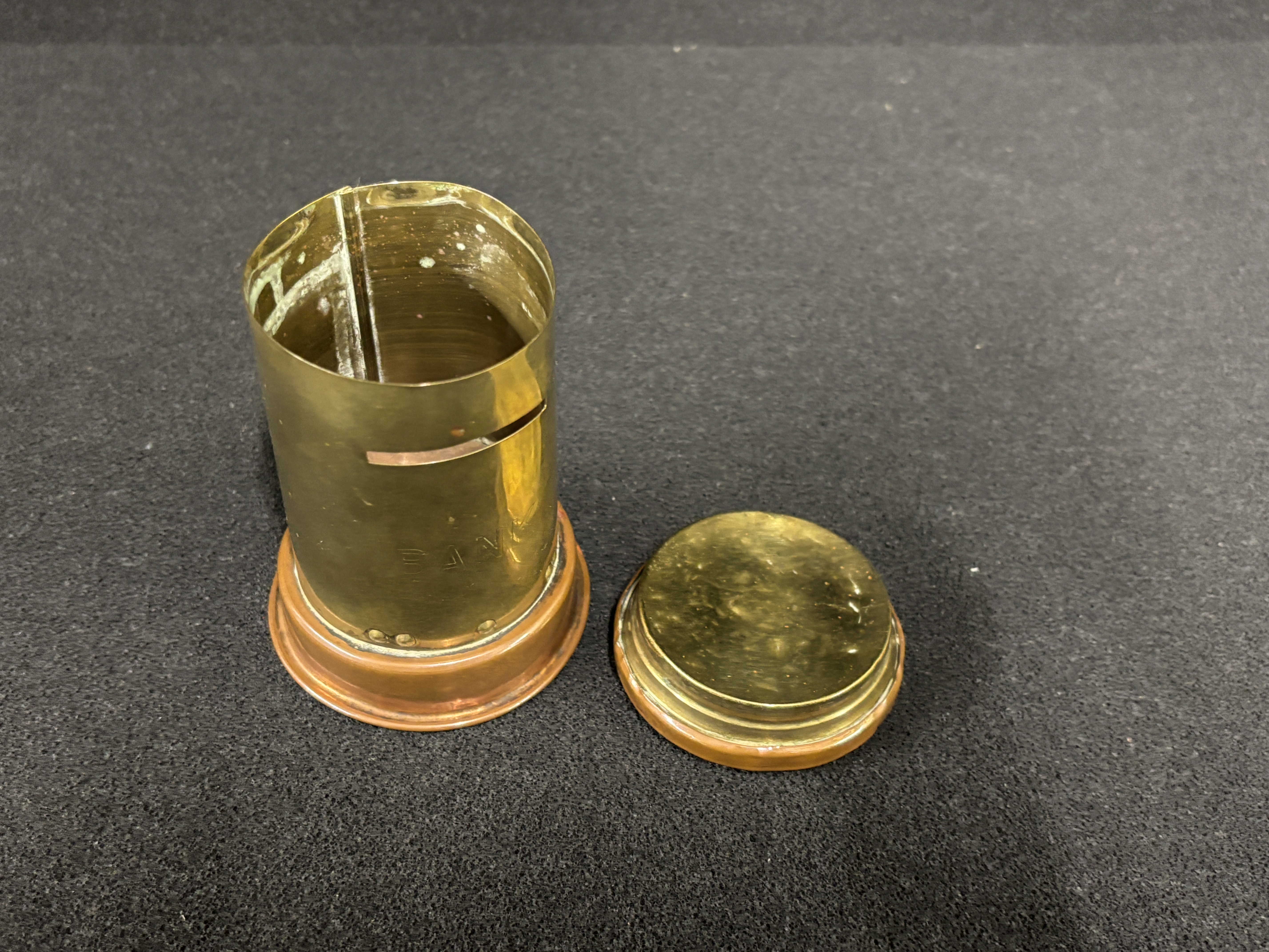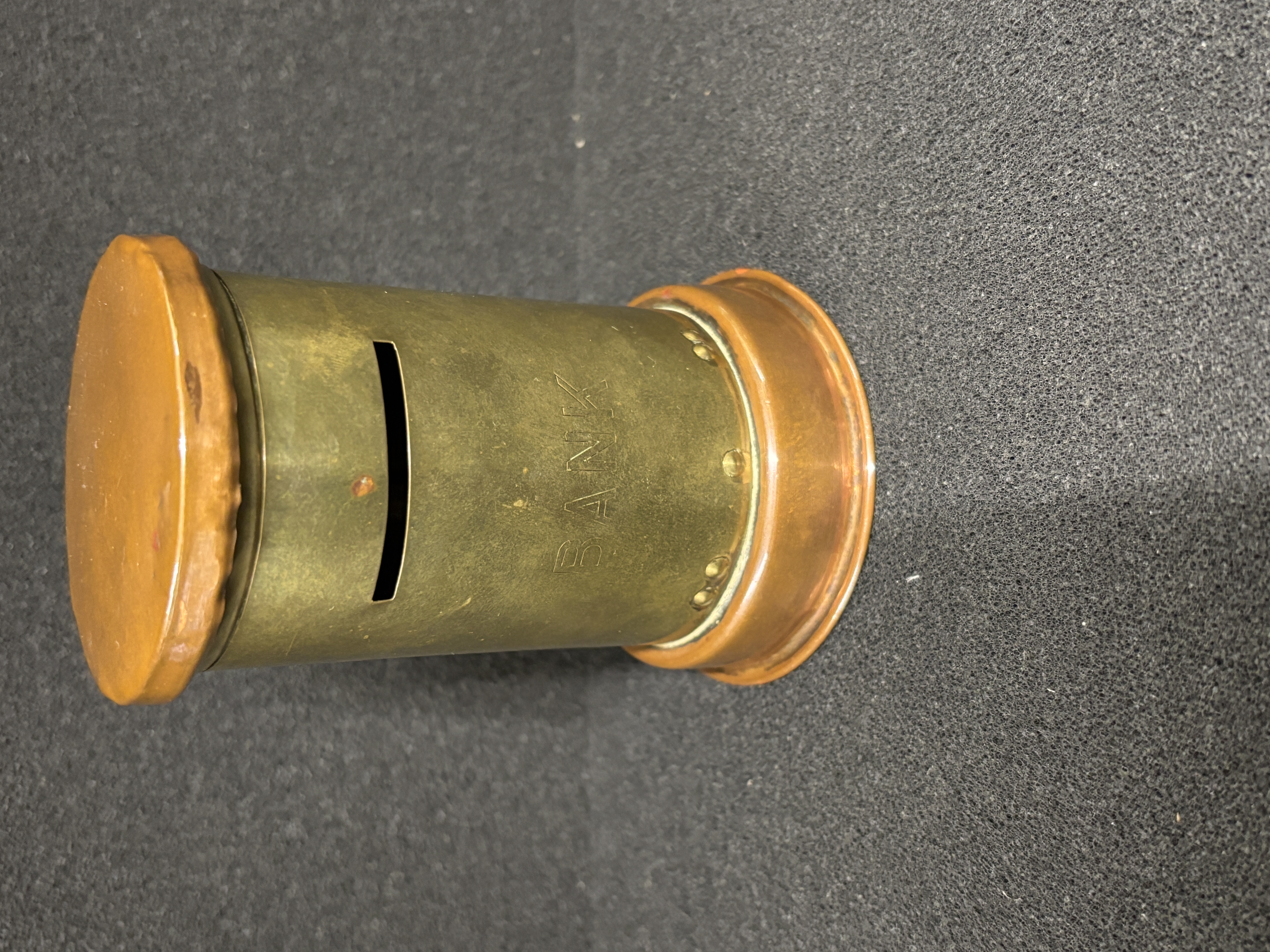 A copper and brass money box 10 cm tall