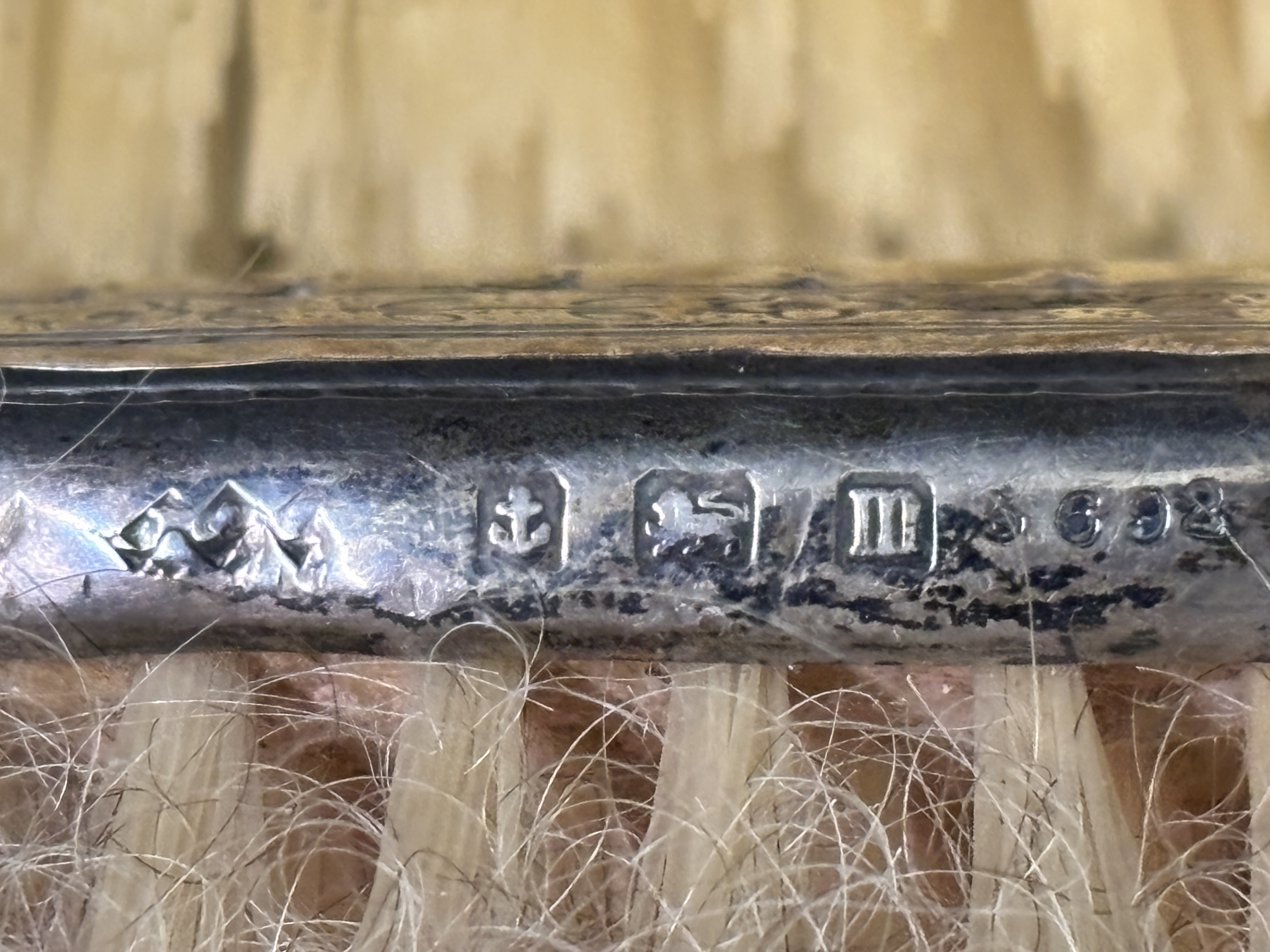 A four piece HM Silver dressing table set comprising two brushes, a mirror and a silver lid from a glass pot