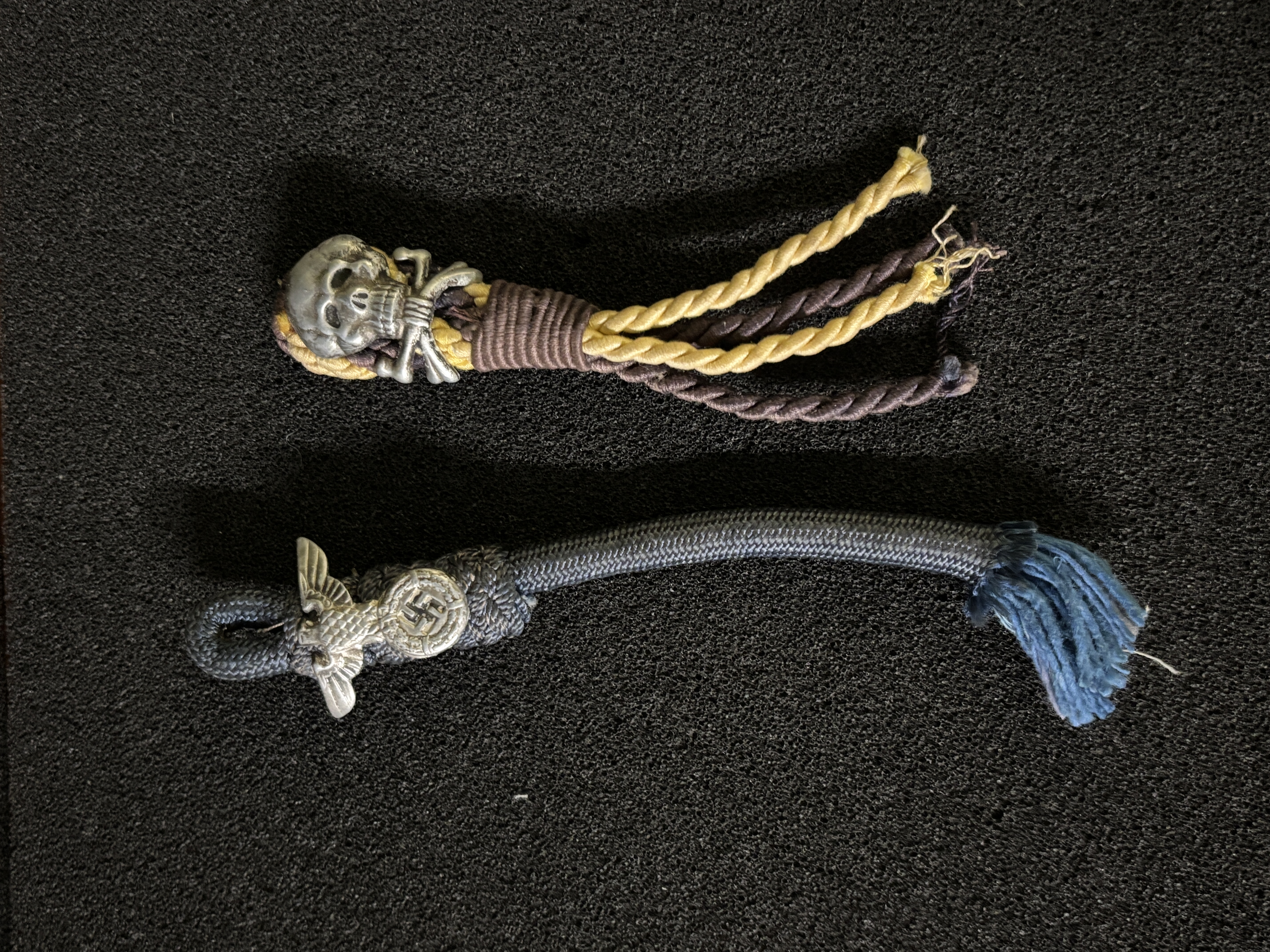 A WWII German 3rd Reich Death head skull and Eagle. Both badges are on the original cords which have been cut