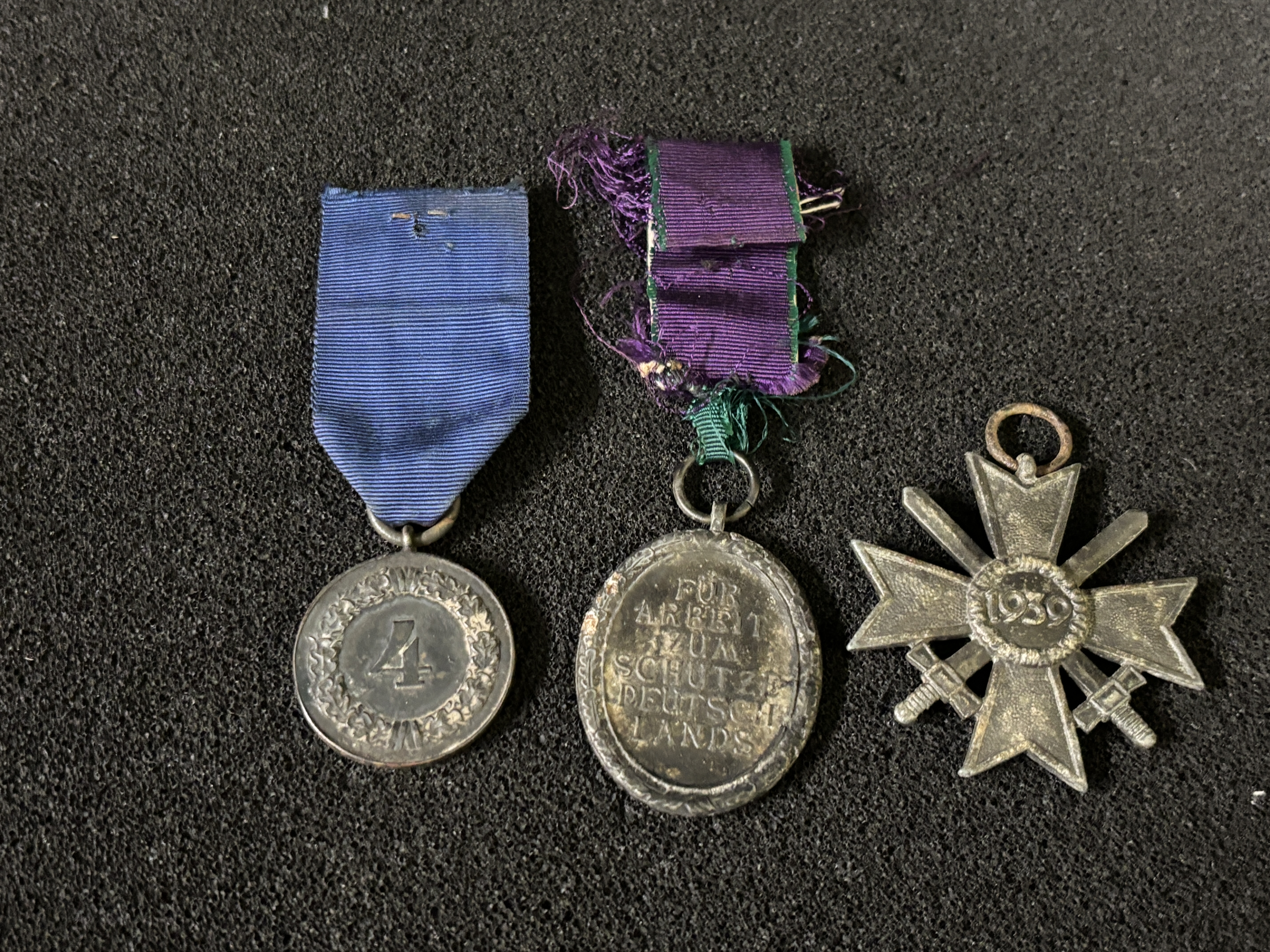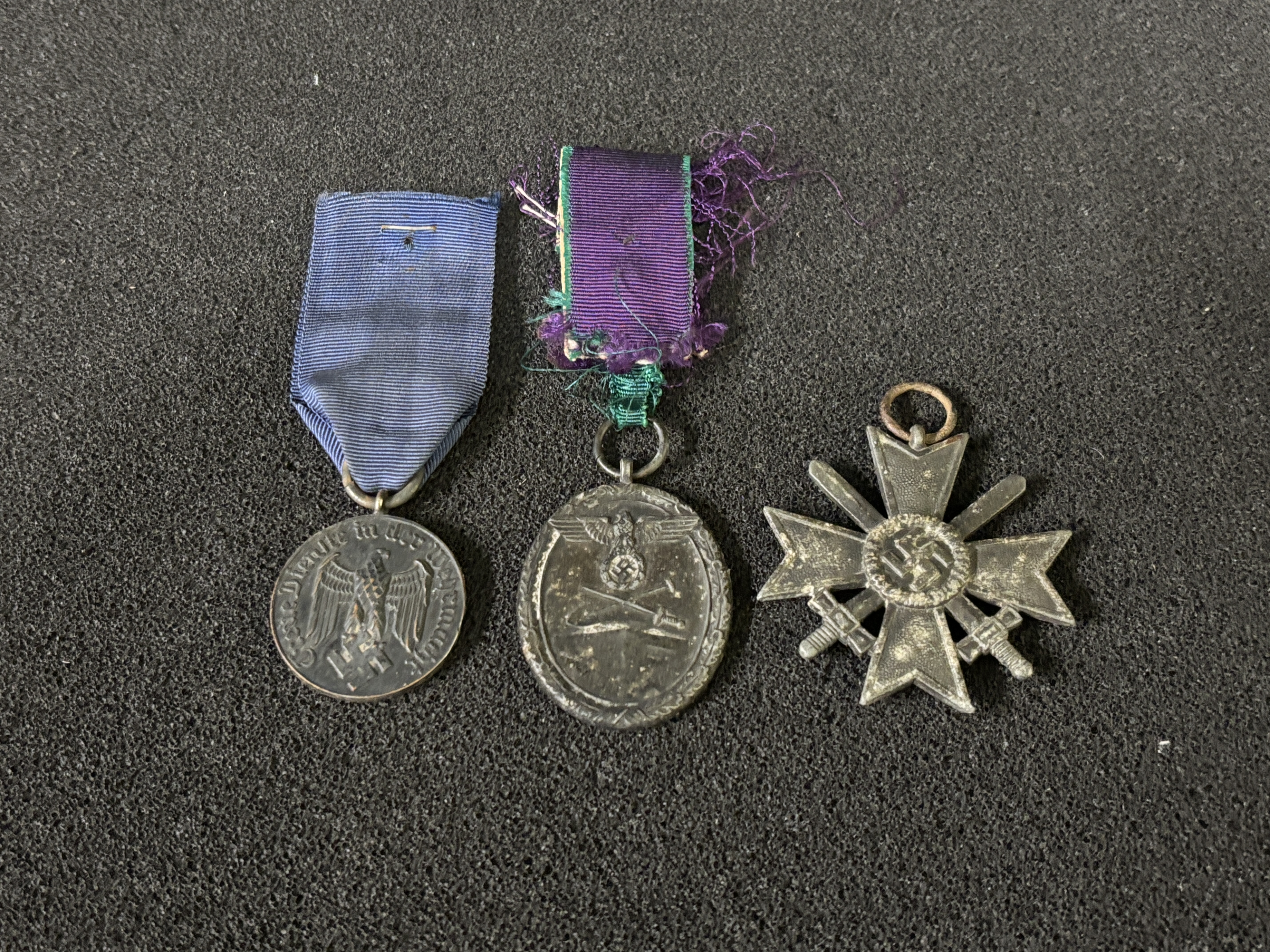 A WWII German 3rd Reich West Wall Medal (Defence of Berlin), A four year Service medal and a Combutant’s Cross Swords medal