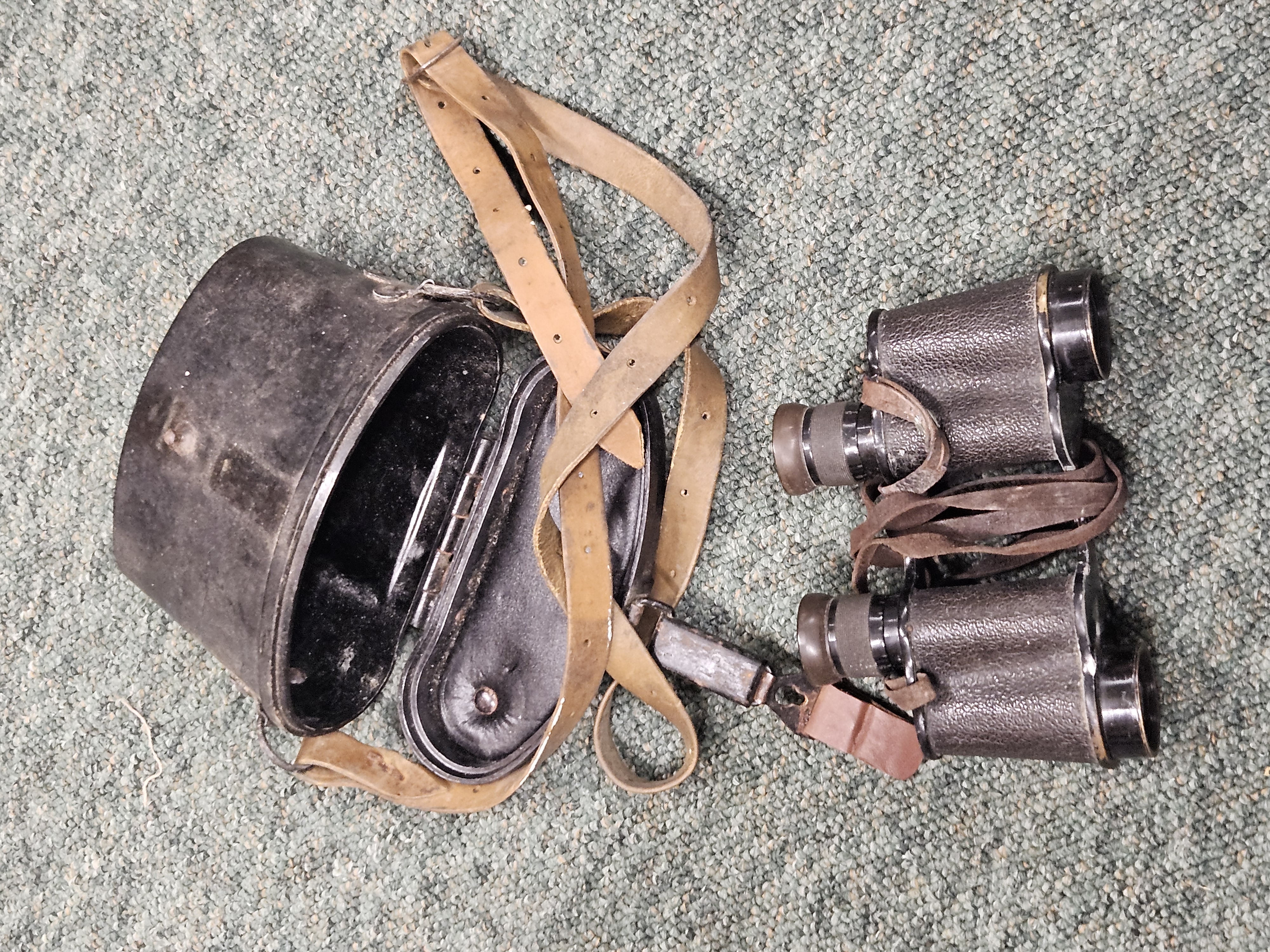 A pair of vintage military binoculars by Ross London, having pheon broad arrow marks, in fitted metal case