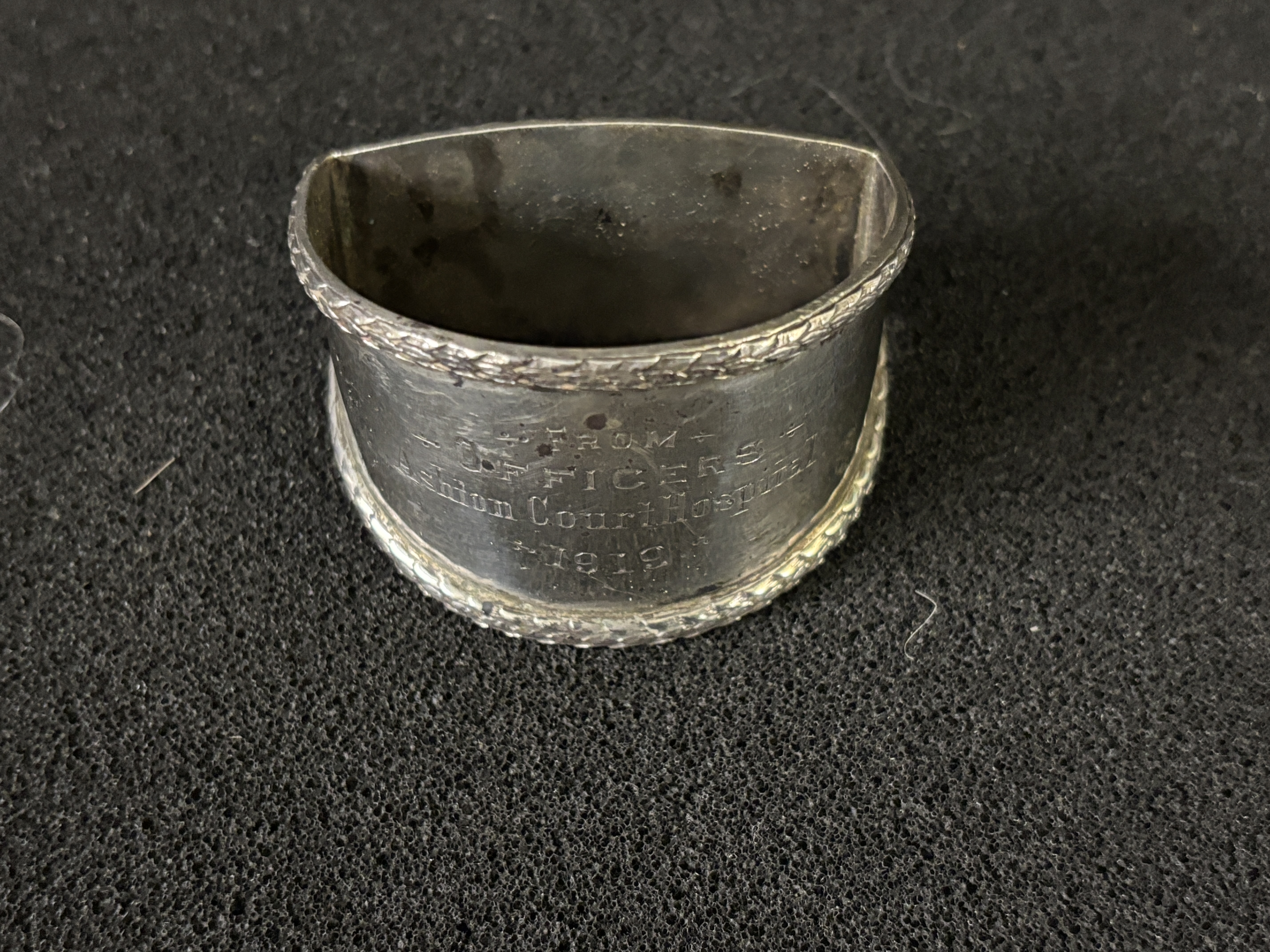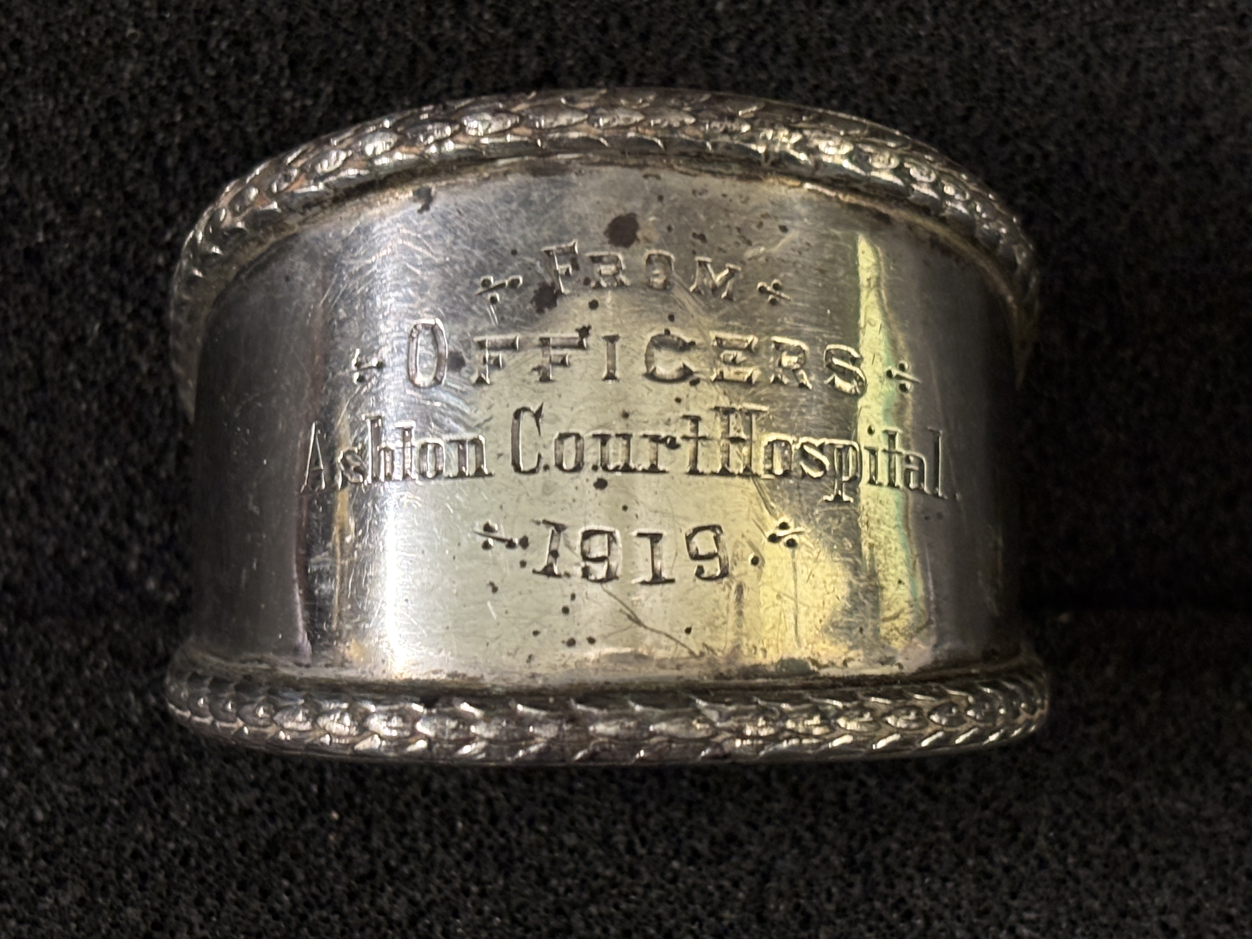 A HM Silver napkin ring presented in 1919 by the Officers of the Ashton Court Hospital weighing 40.61 gm
