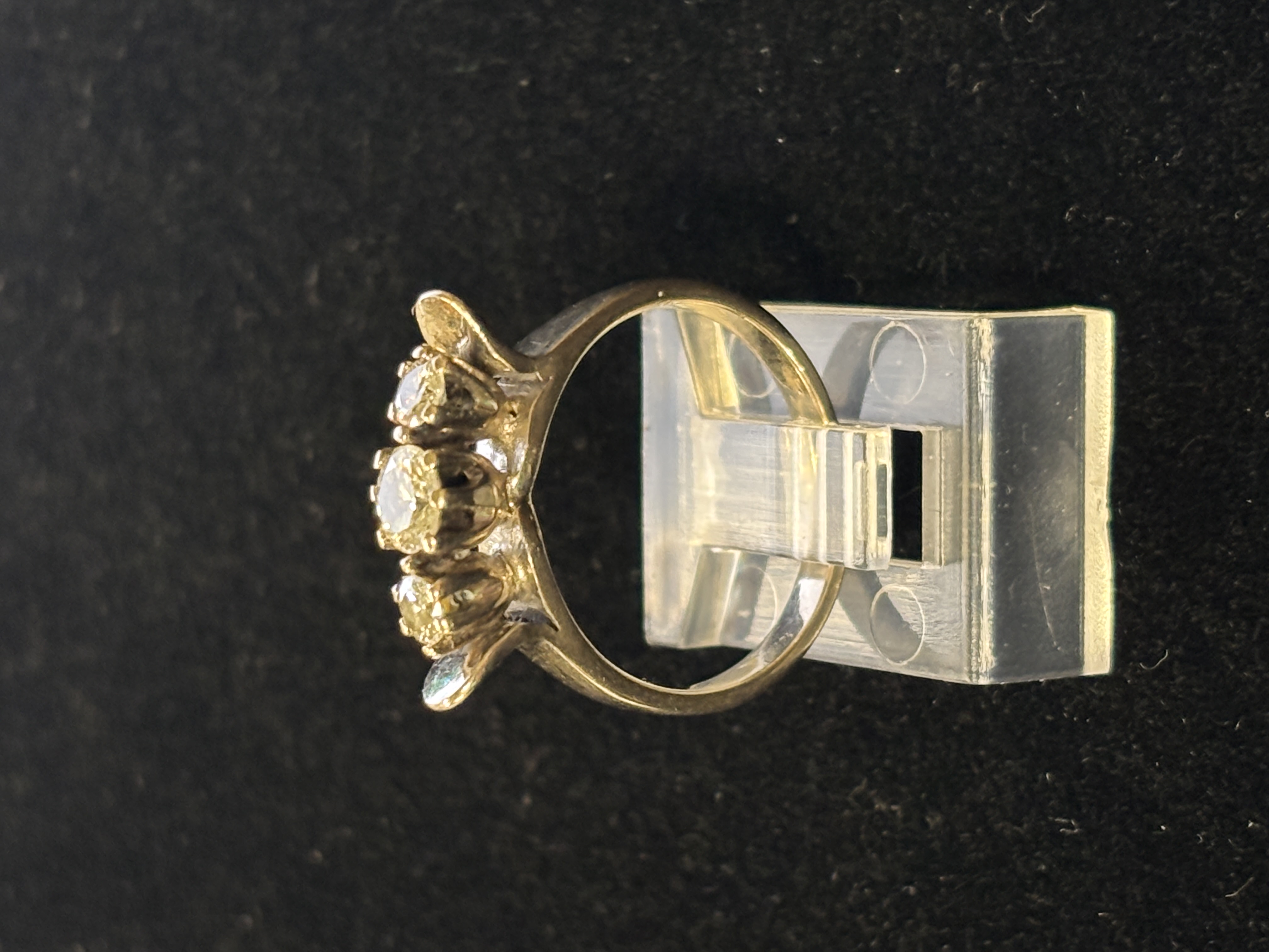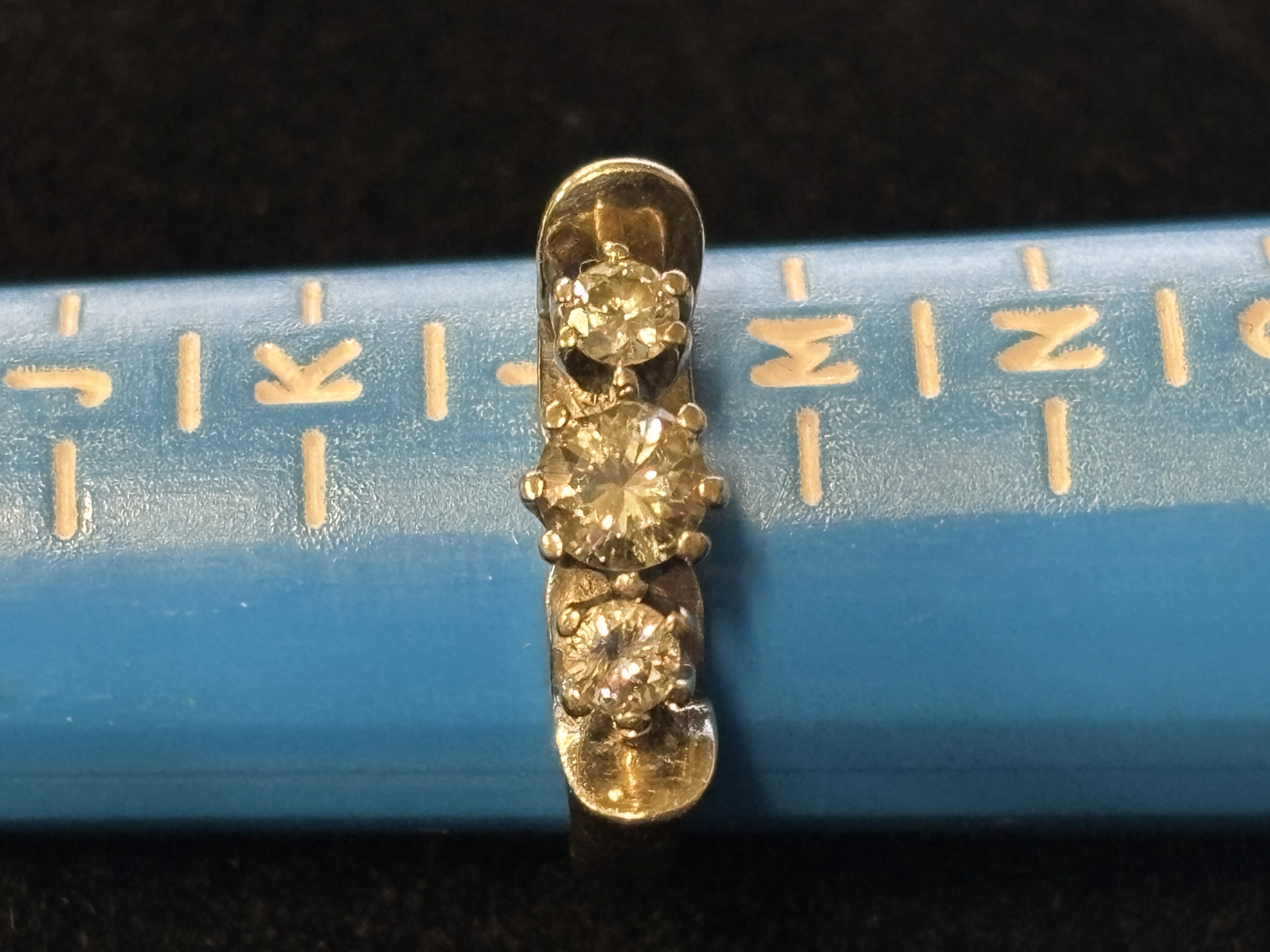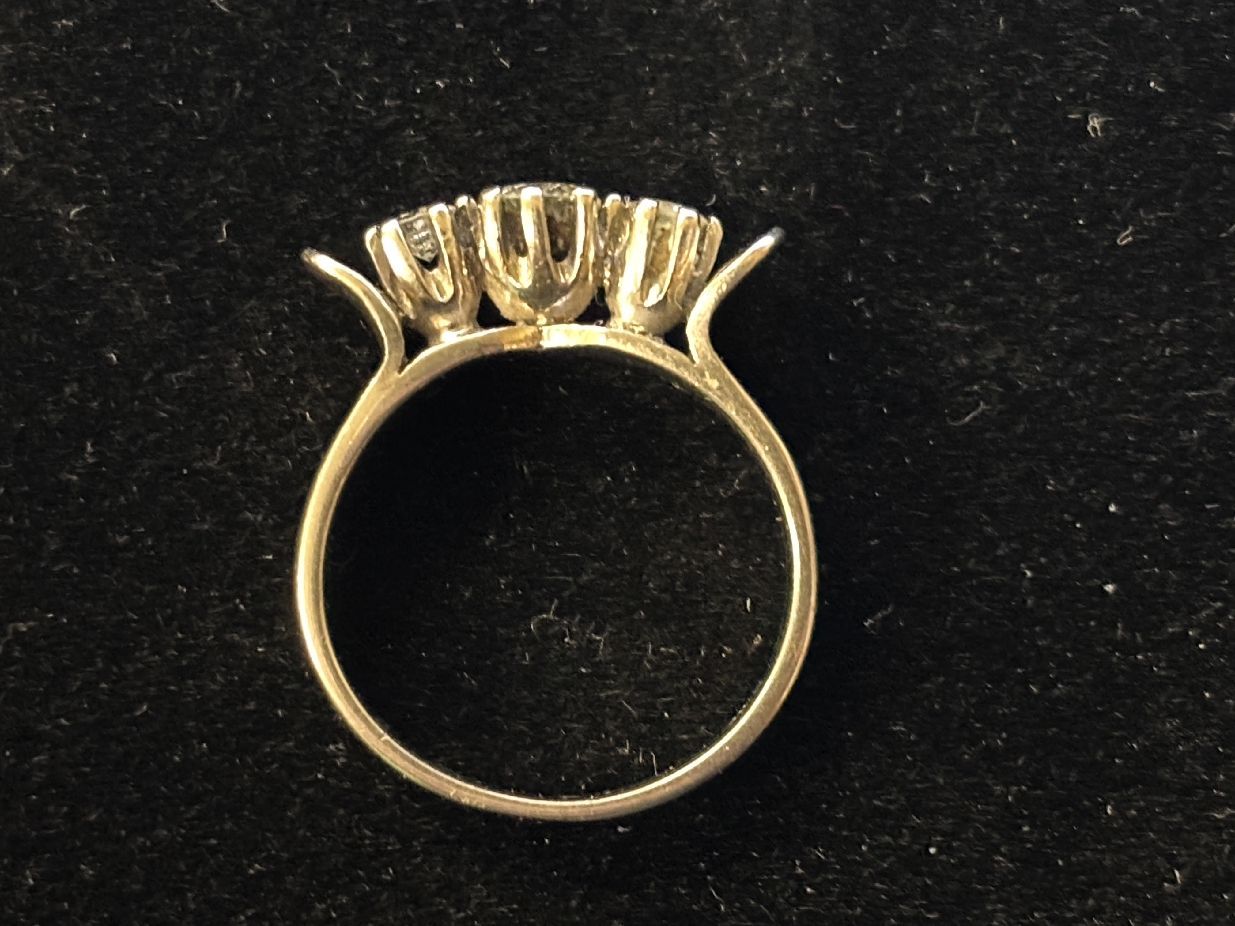 A white metal and diamond ring having three stones size L