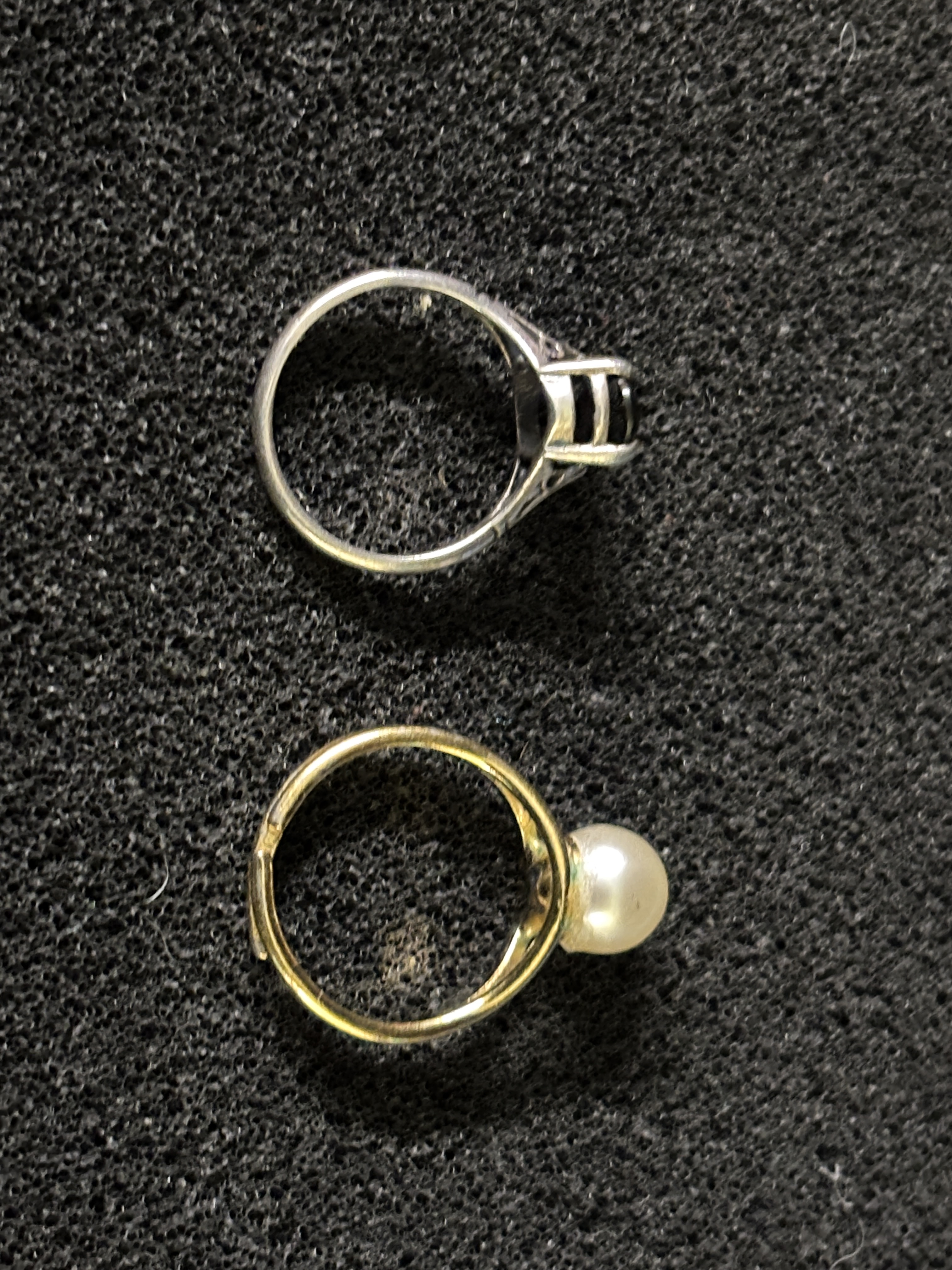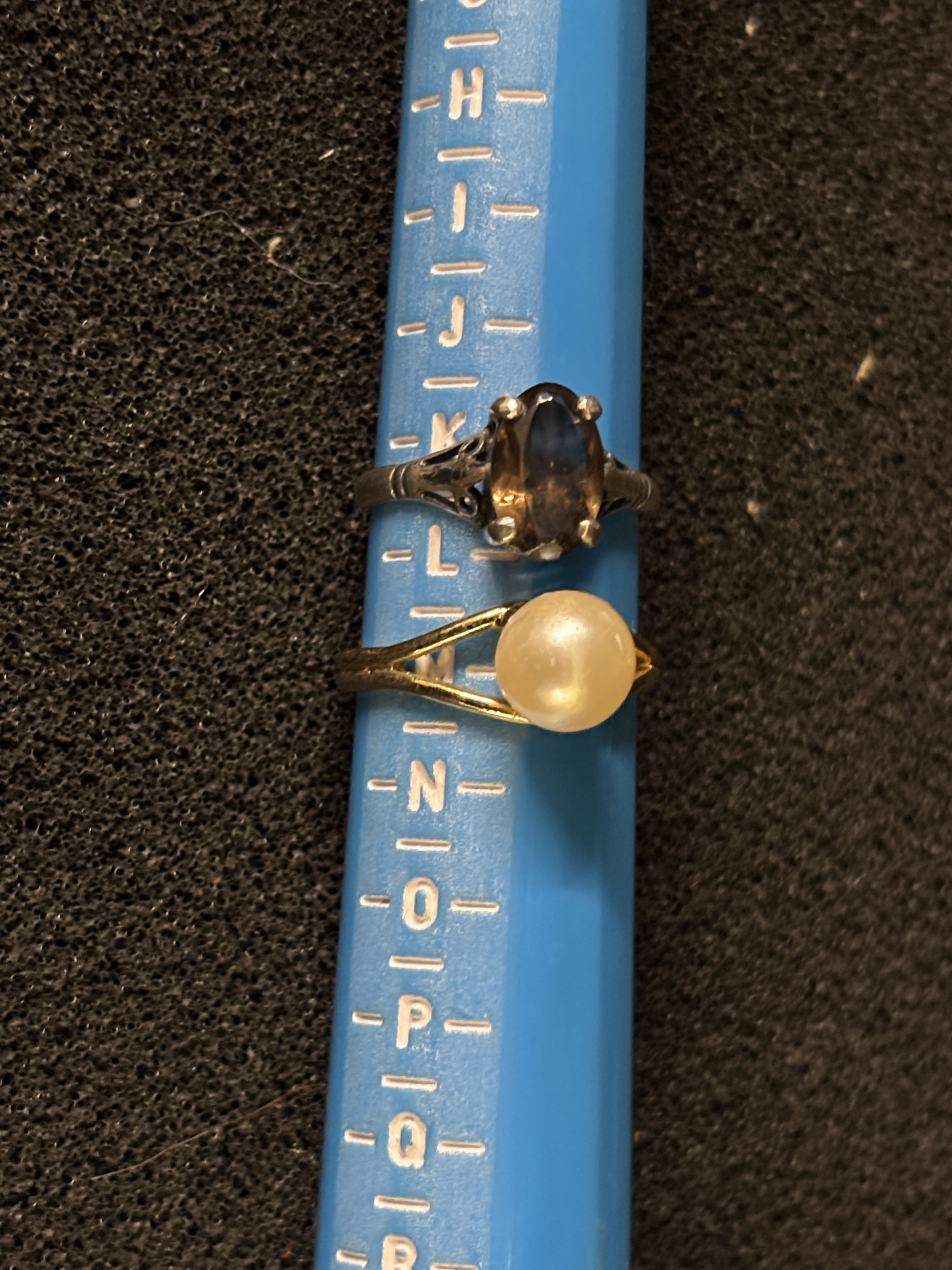 A silver and smoky quartz ring together with a gold plated adjustable pearl ring