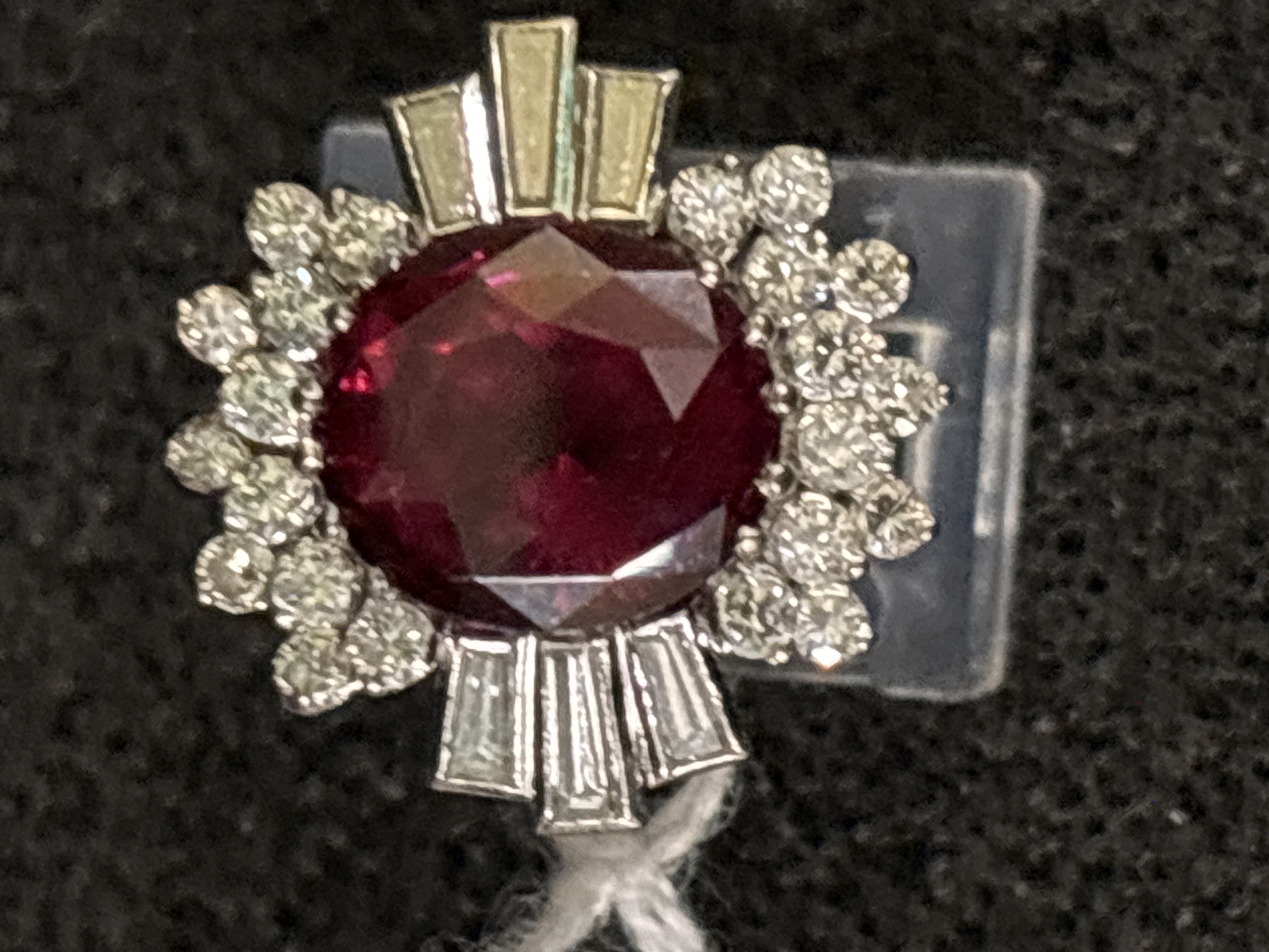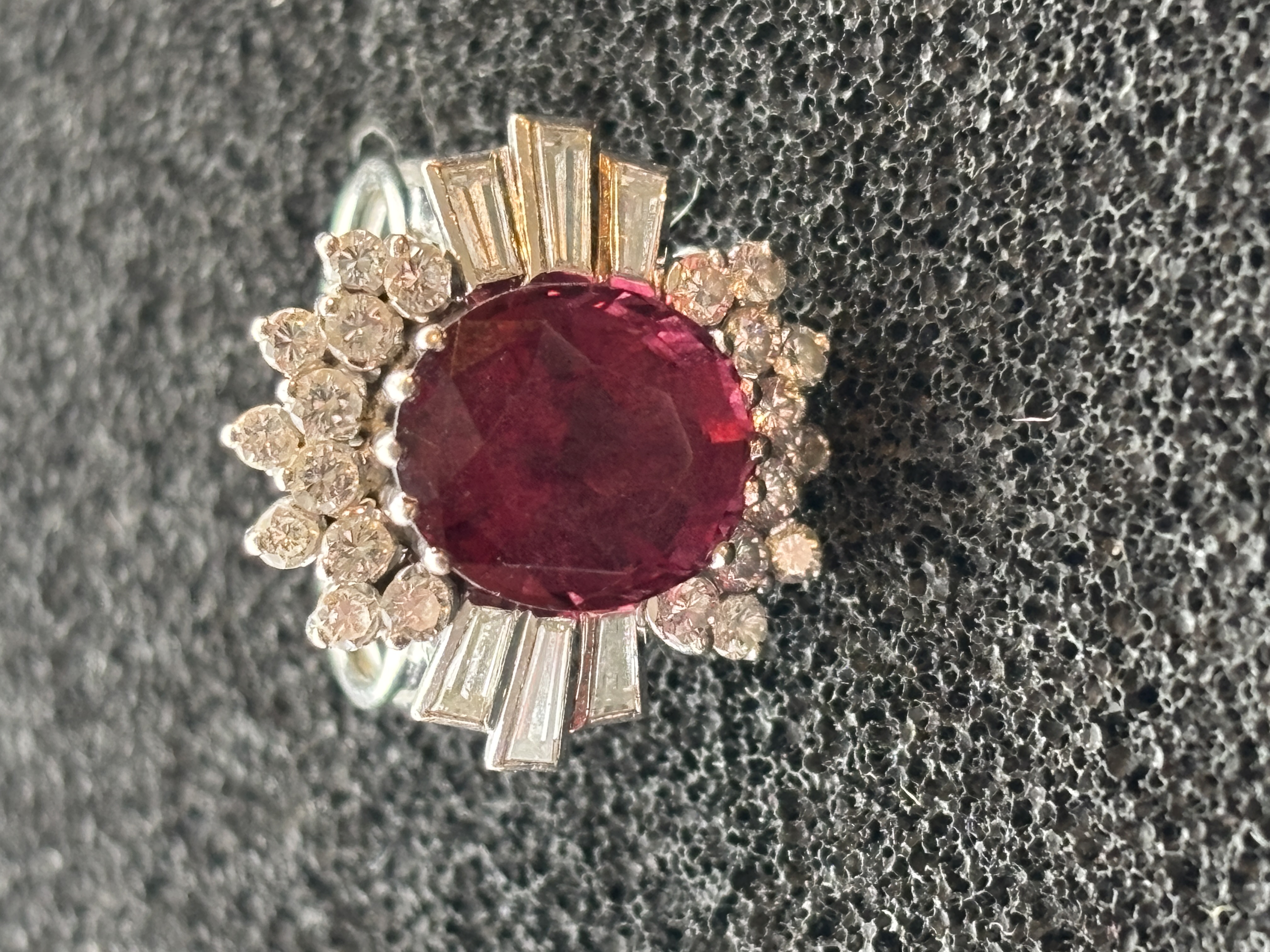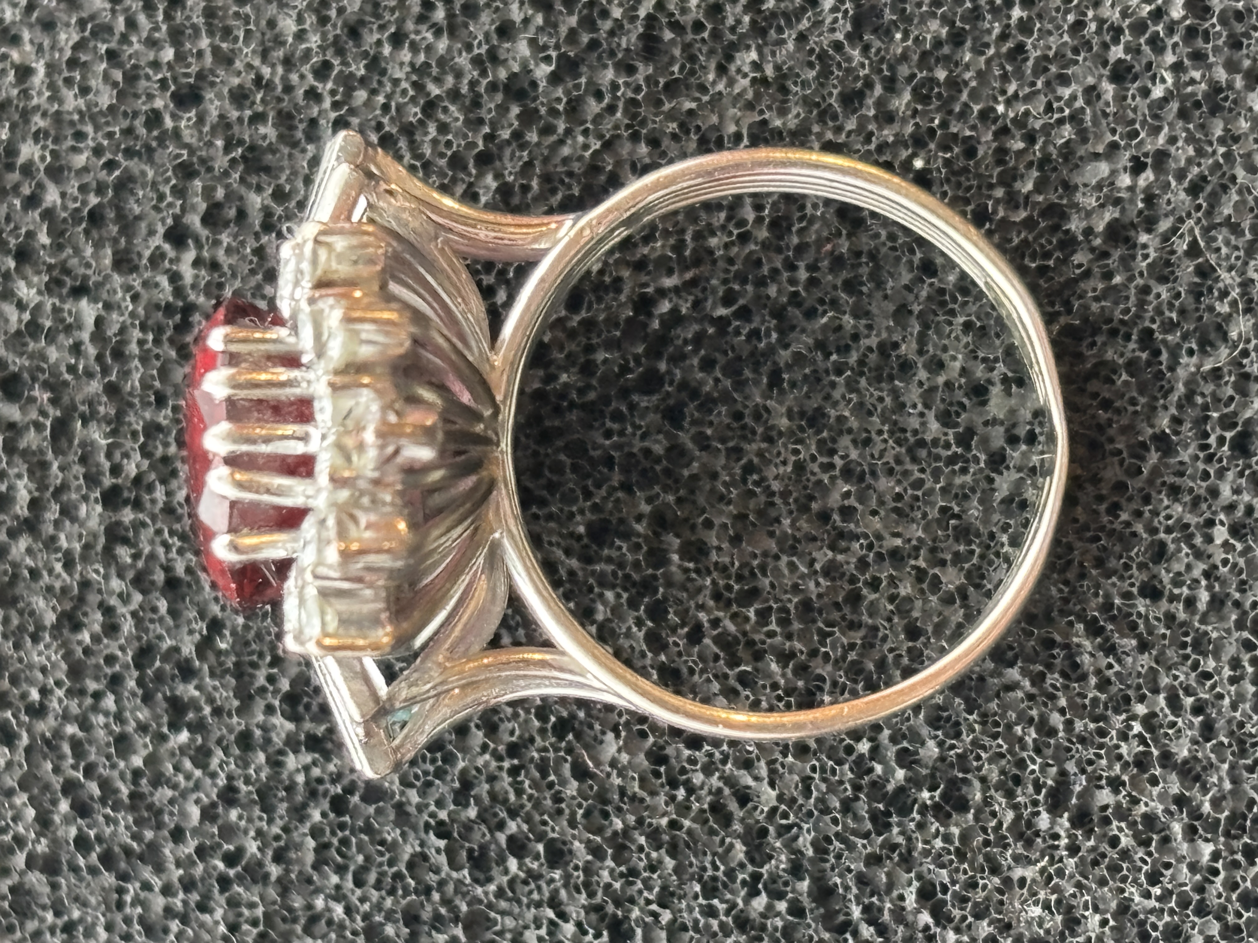 An 18ct white gold Diamond and Garnet cluster ring size 0 1/2. Total weight of ring 9.4 gms