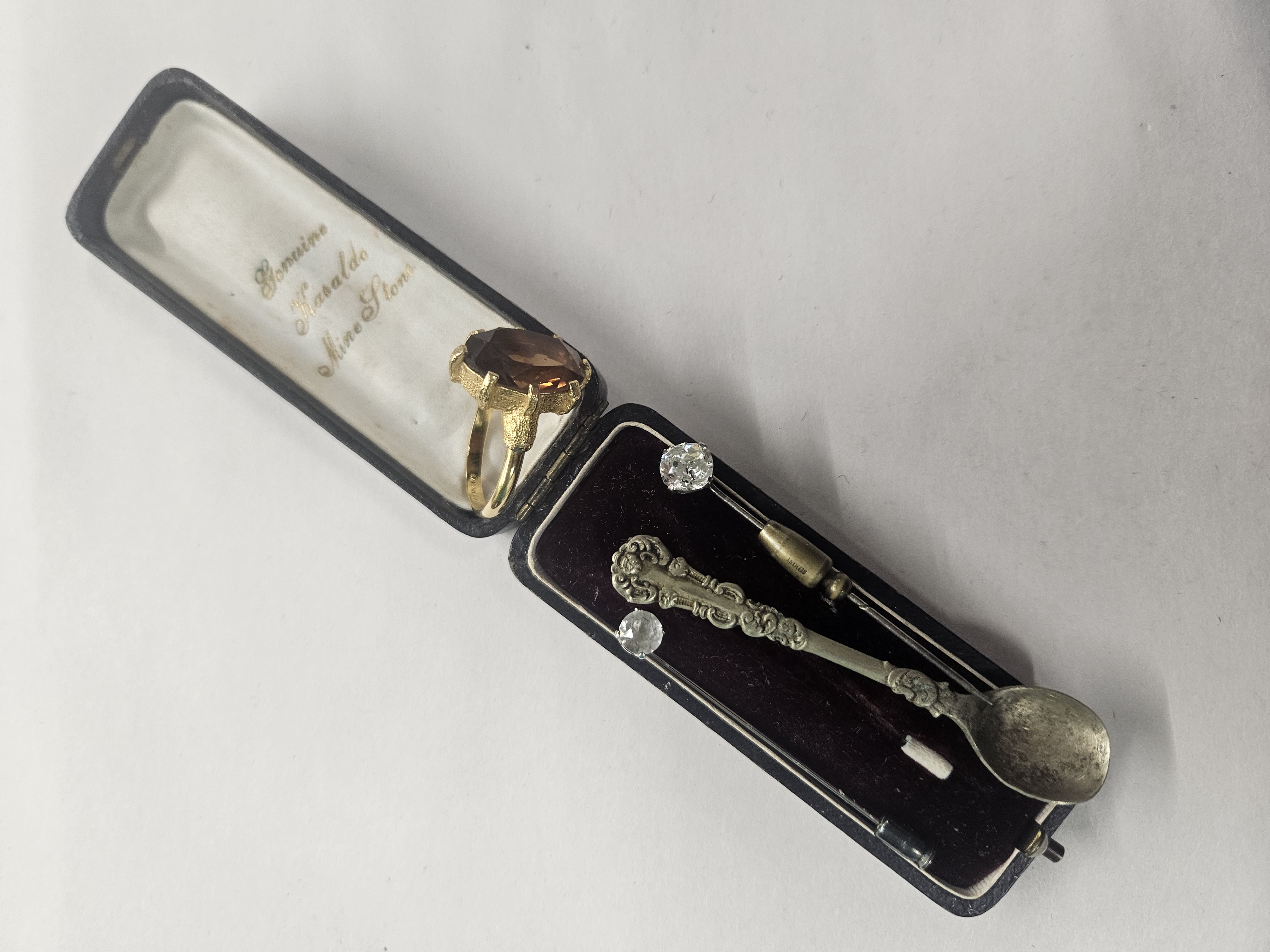 Two early 20th century hat or stick pins, a vintage white metal salt spoon with pseudo marks, and a Sarah Coventry dress ring
