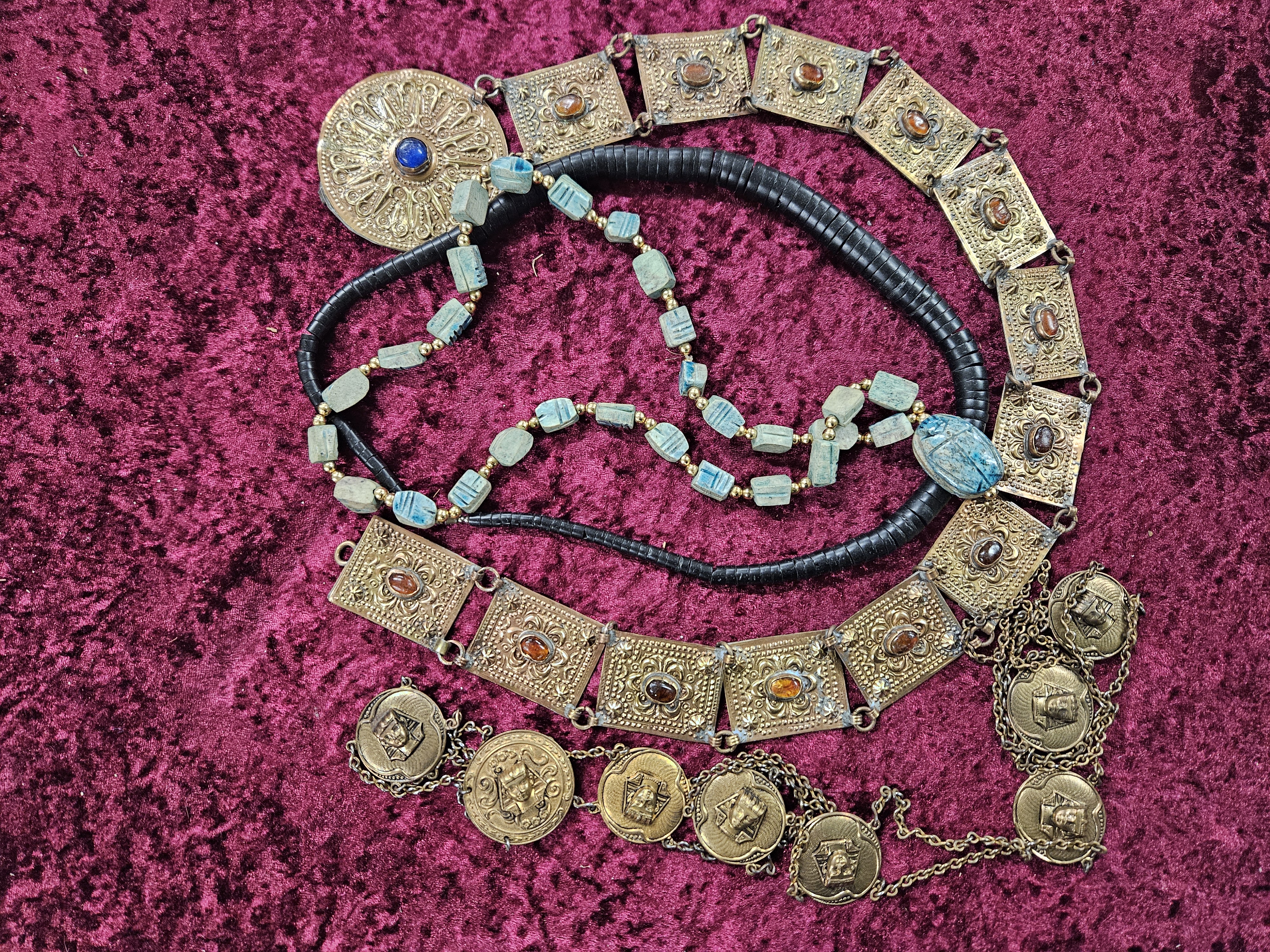 A selection of necklaces, and chain belts, including Egyptian style