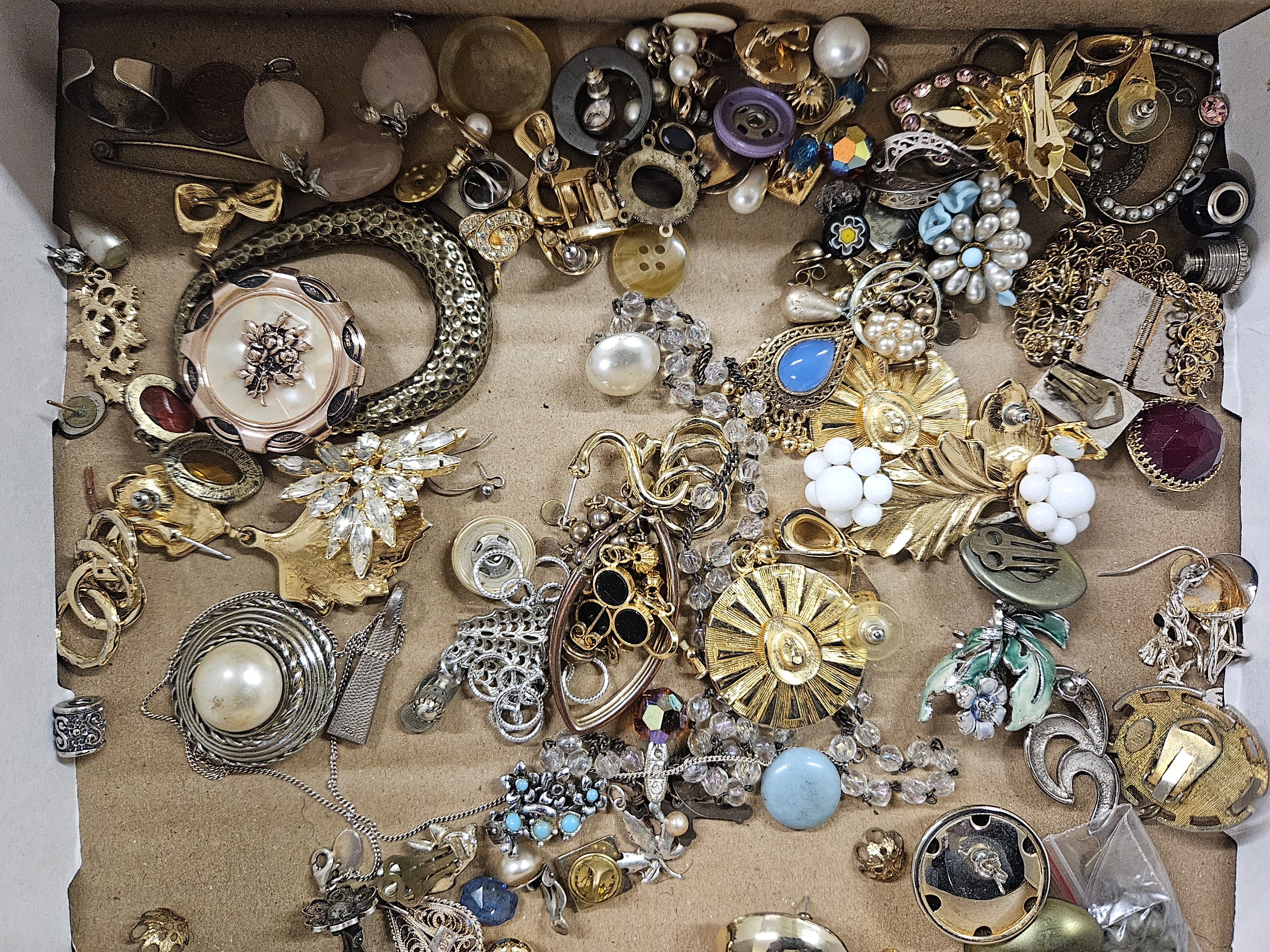 A selection of costume jewellery including brooches