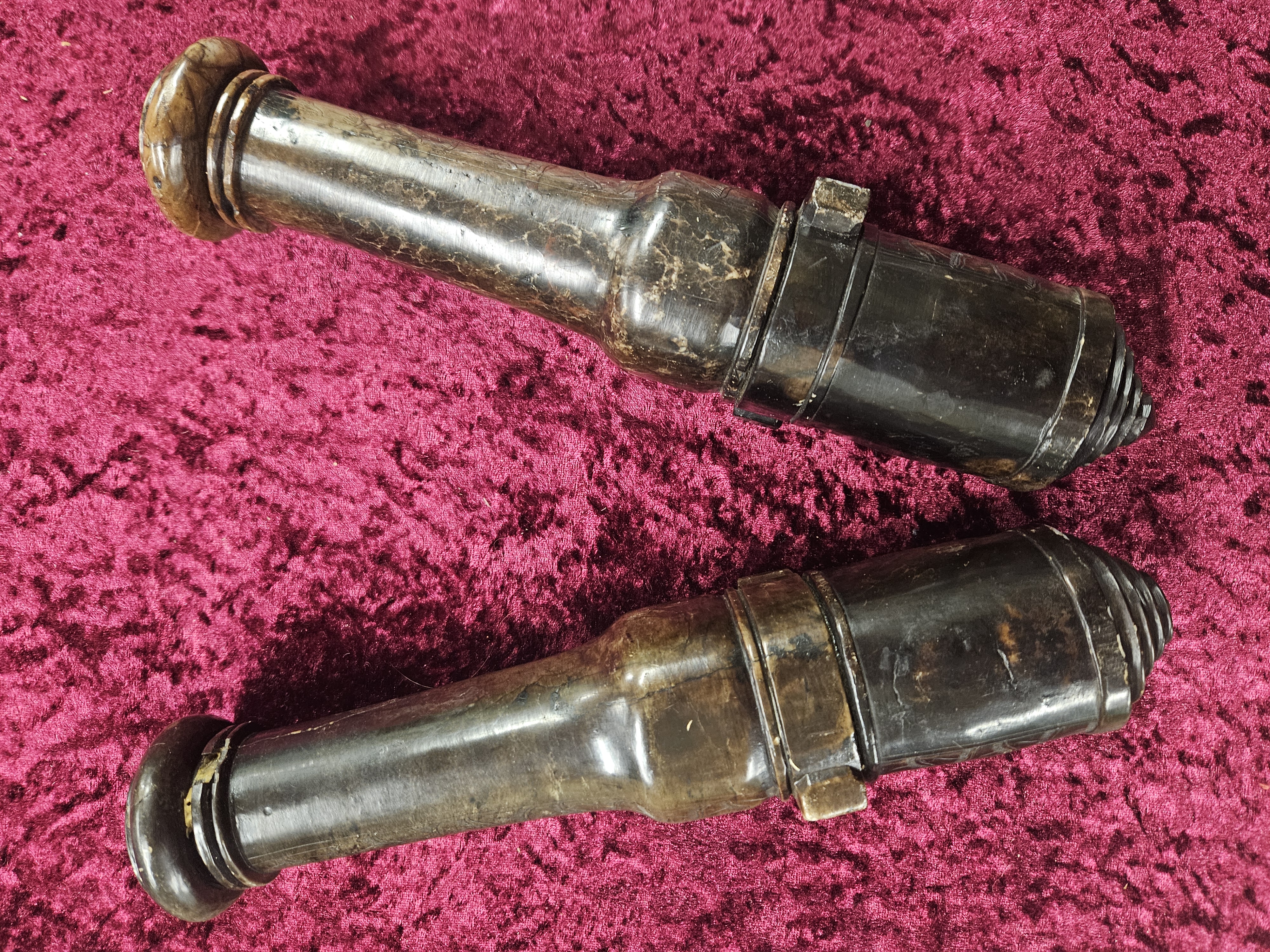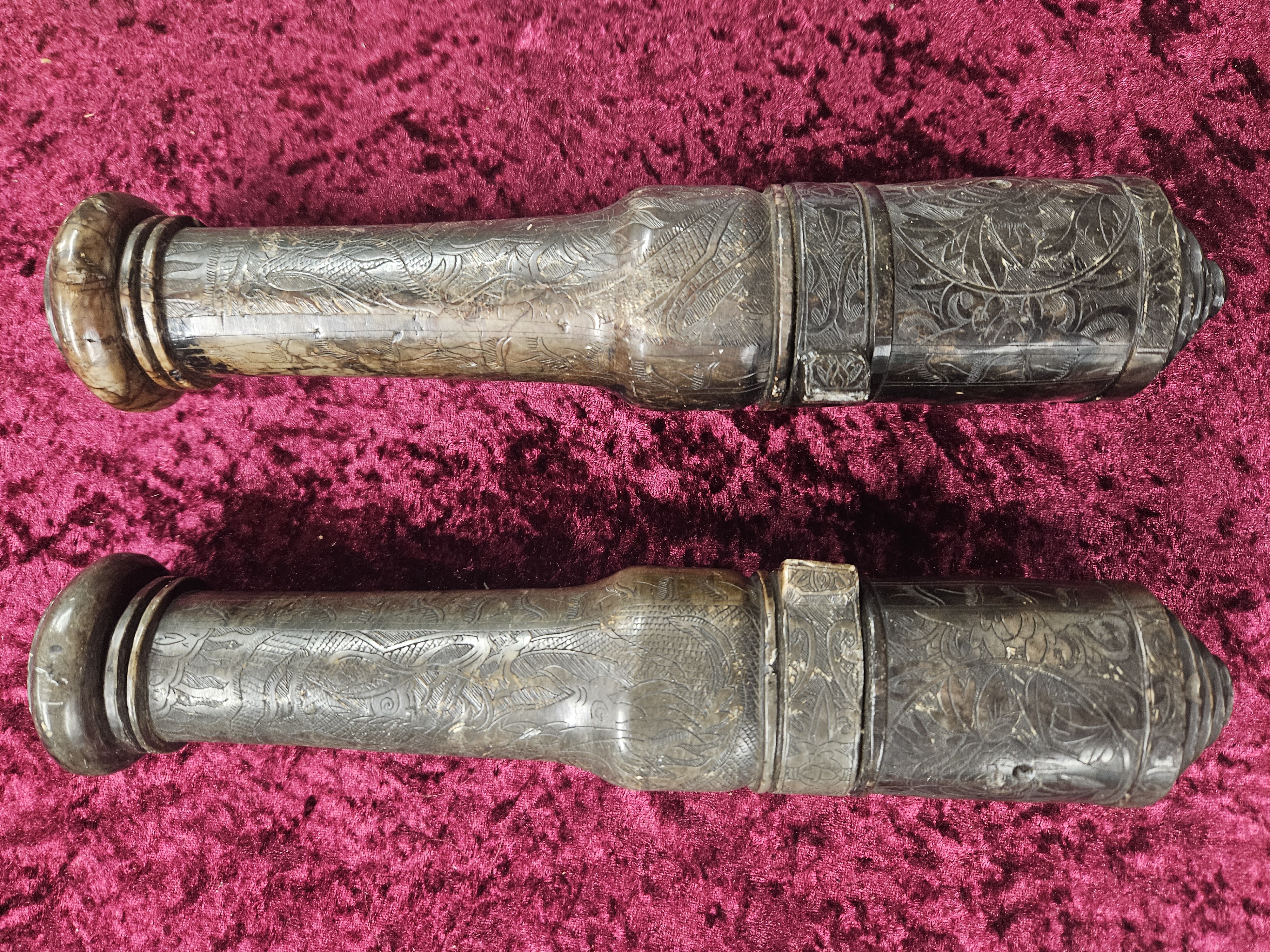 A pair of soapstone desk cannons having carved foliate decoration of Chinese form, length 28cn