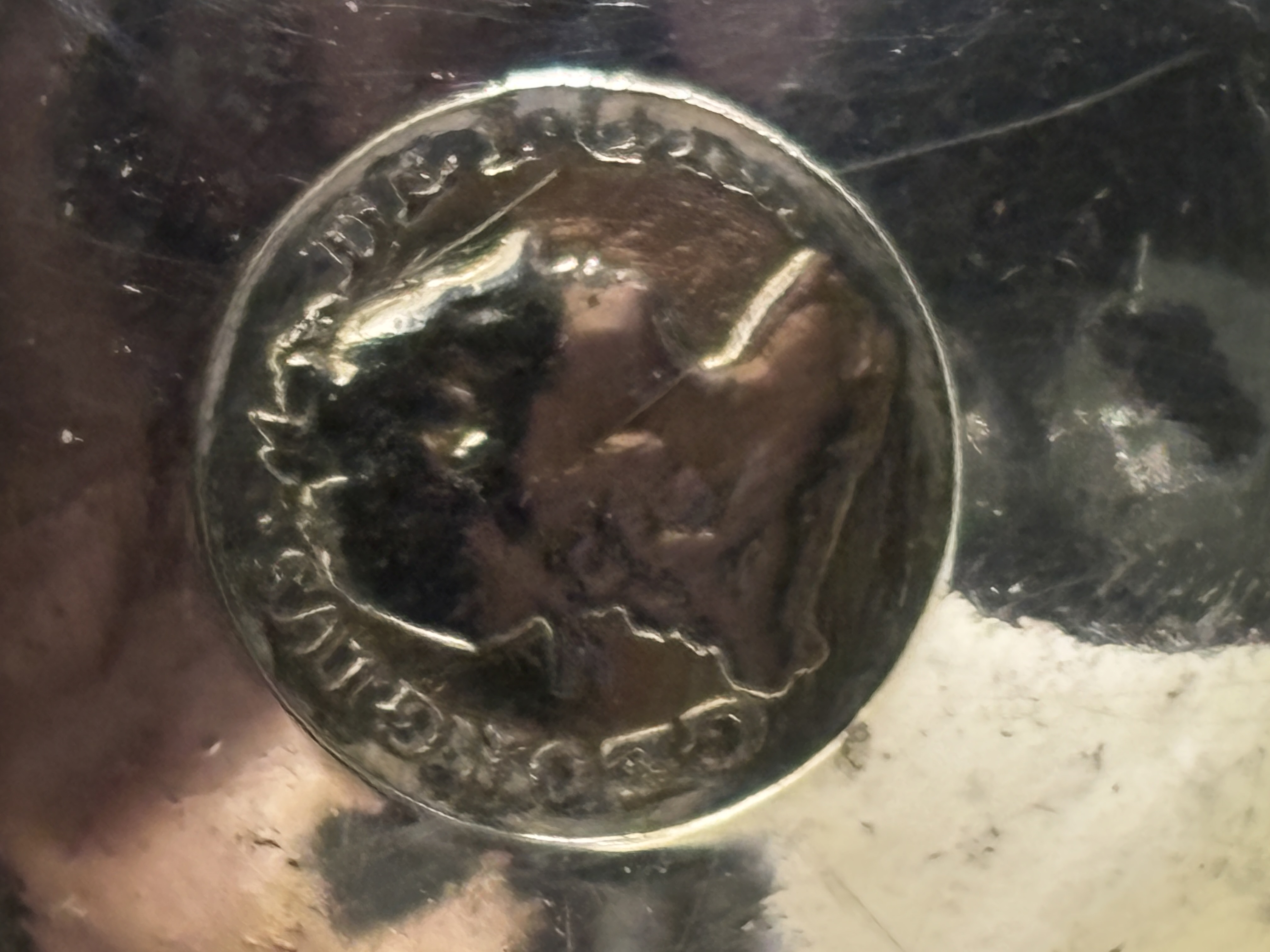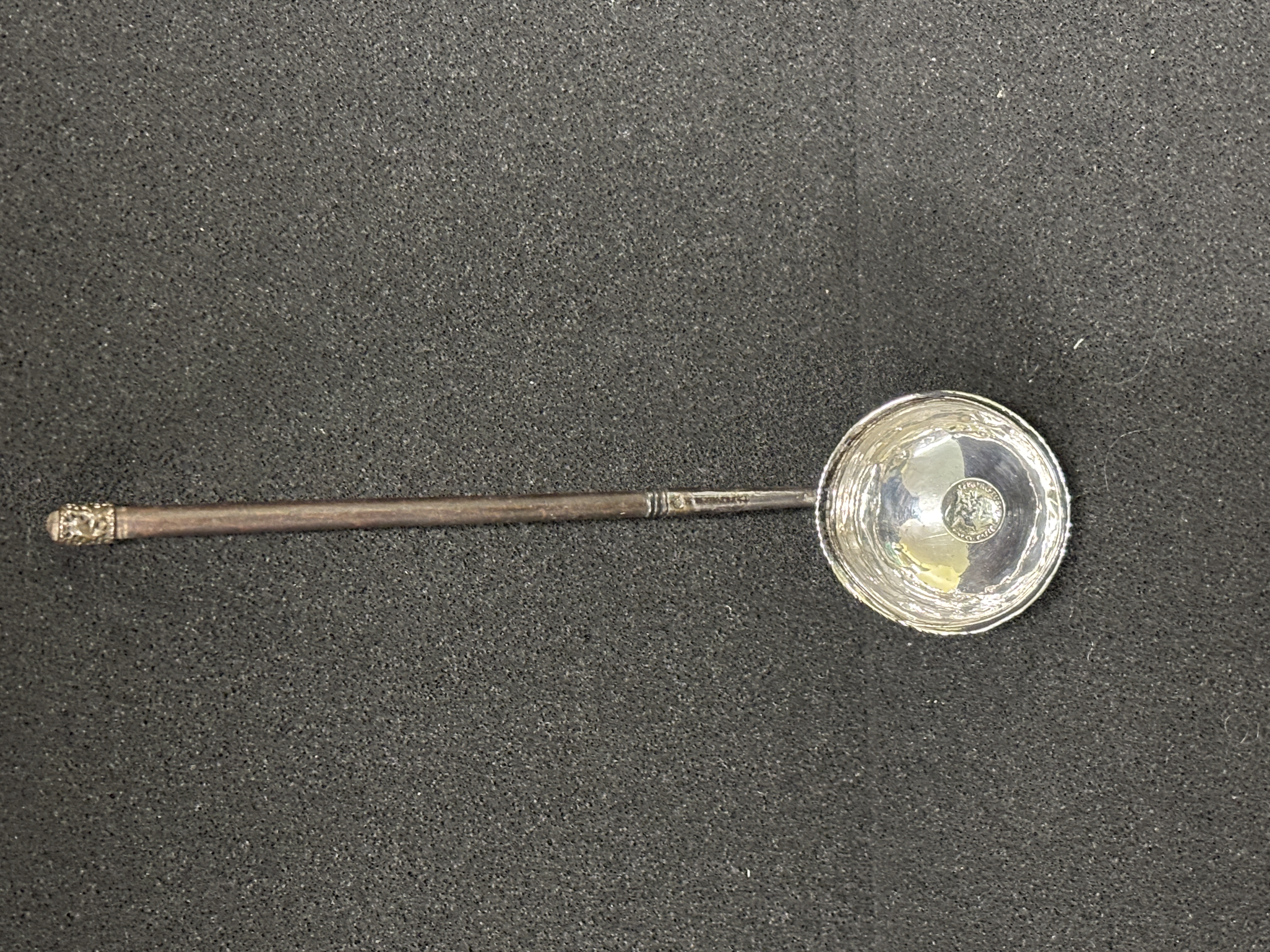 A white metal toddy ladle with wooden handle inset with a George IV coin