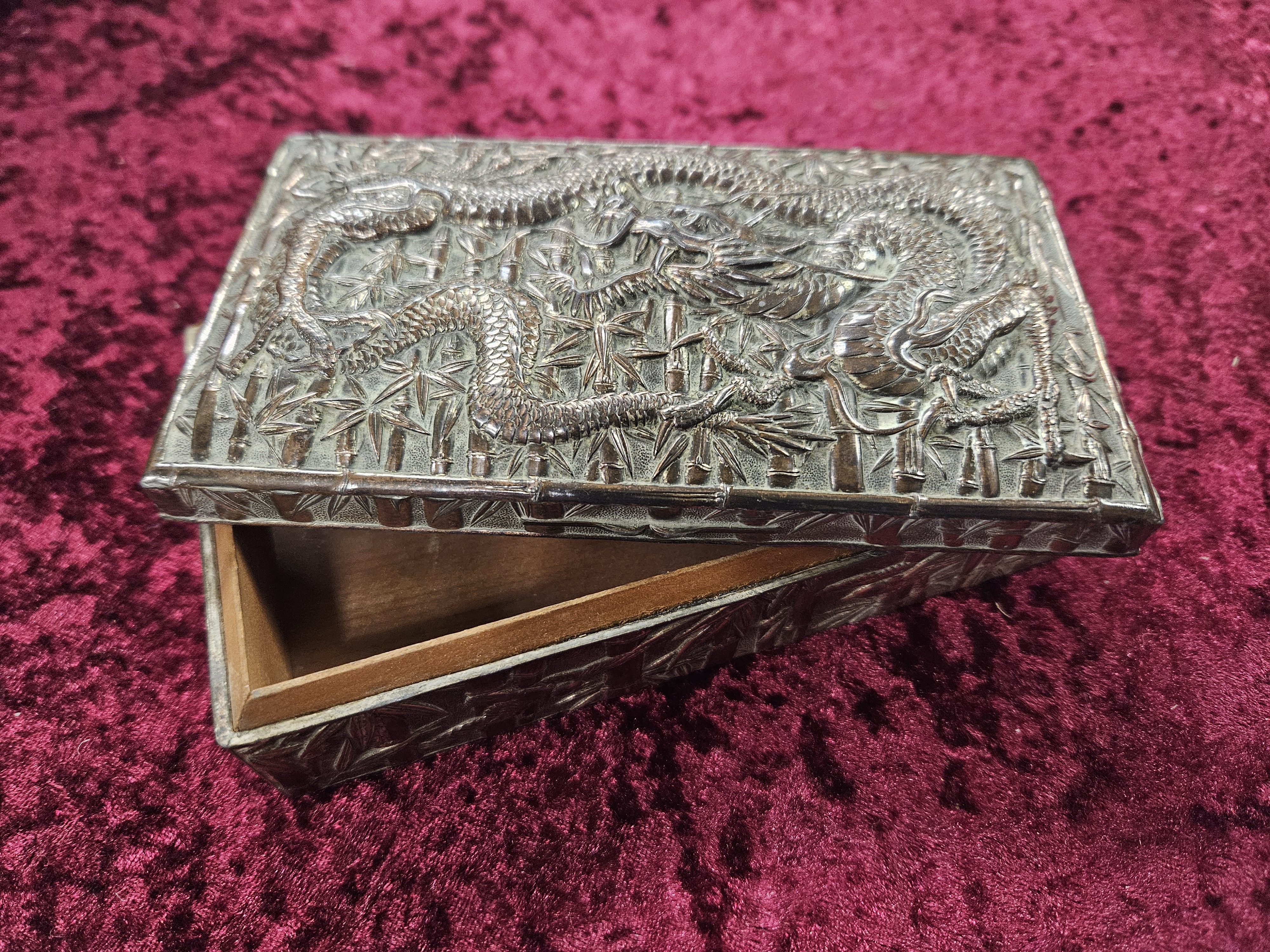 An Oriental metal alloy dragon trinket cigarette box, wood lined, width 15cm