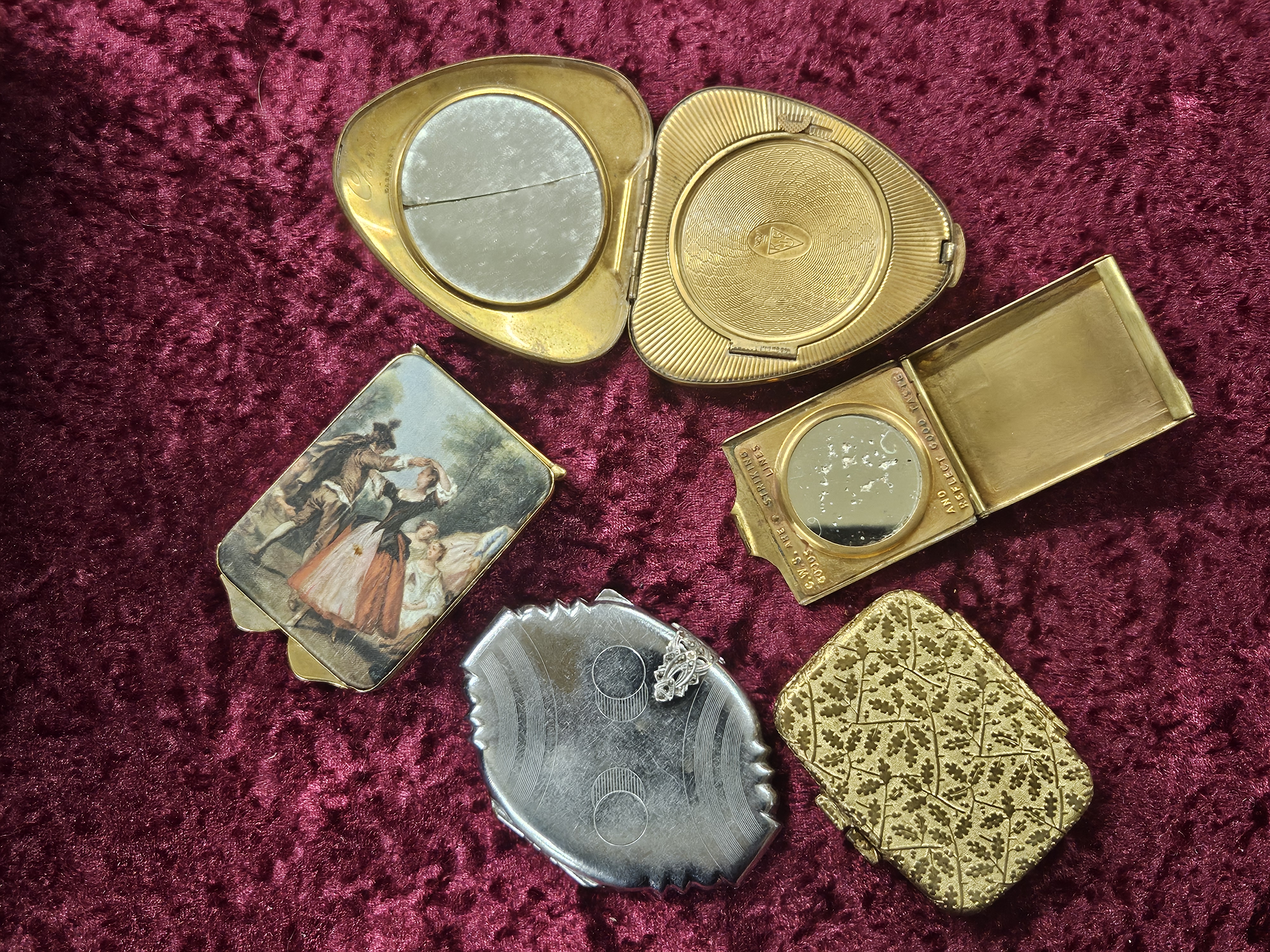 A vintage Kigu metal compact, a similar CWS compact and four others including marcasite interest