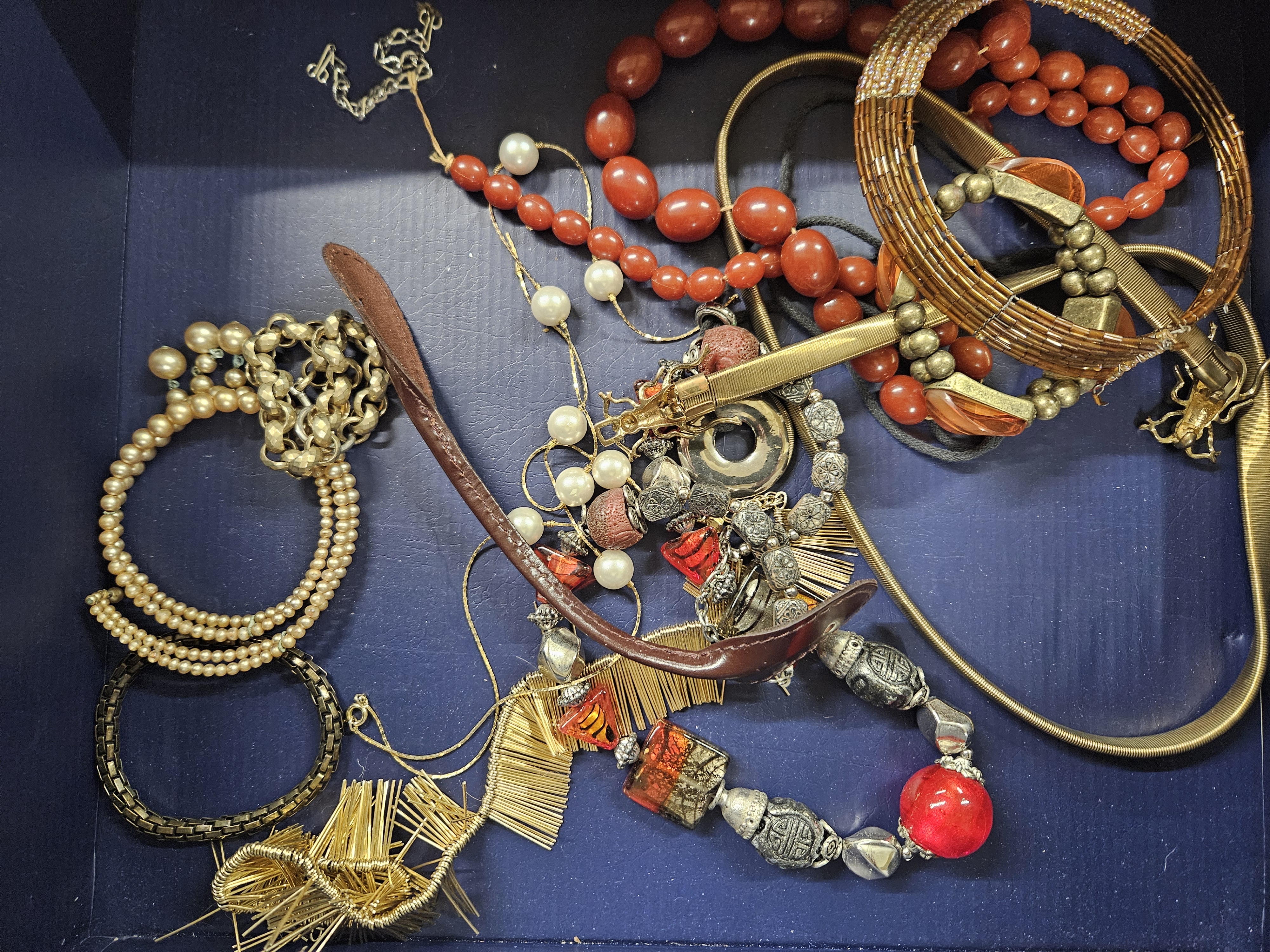 A selection of costume jewellery including bead necklace