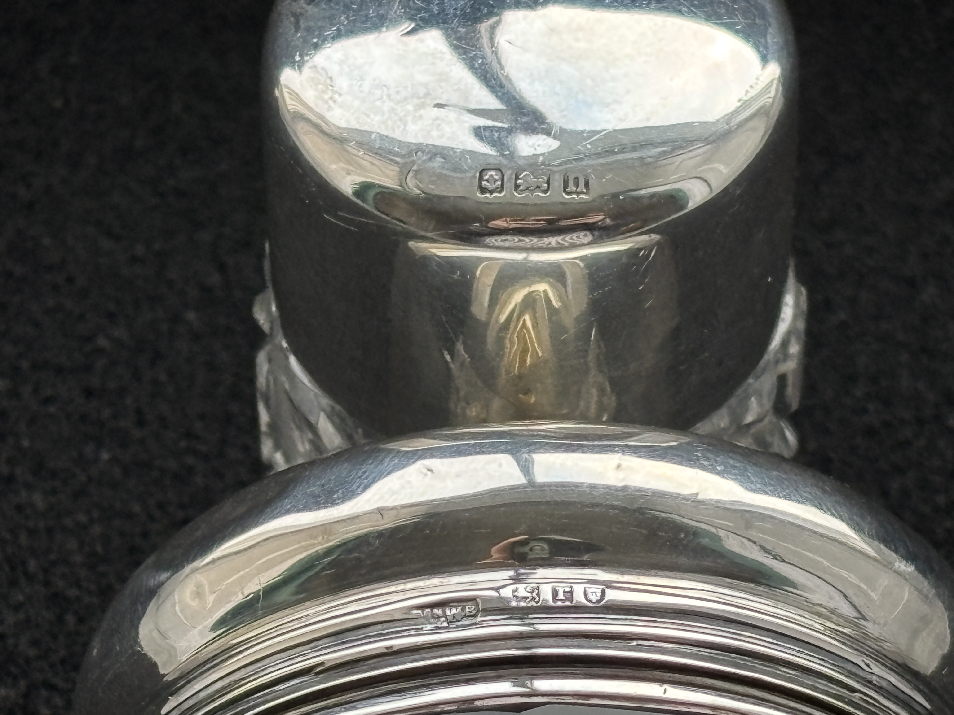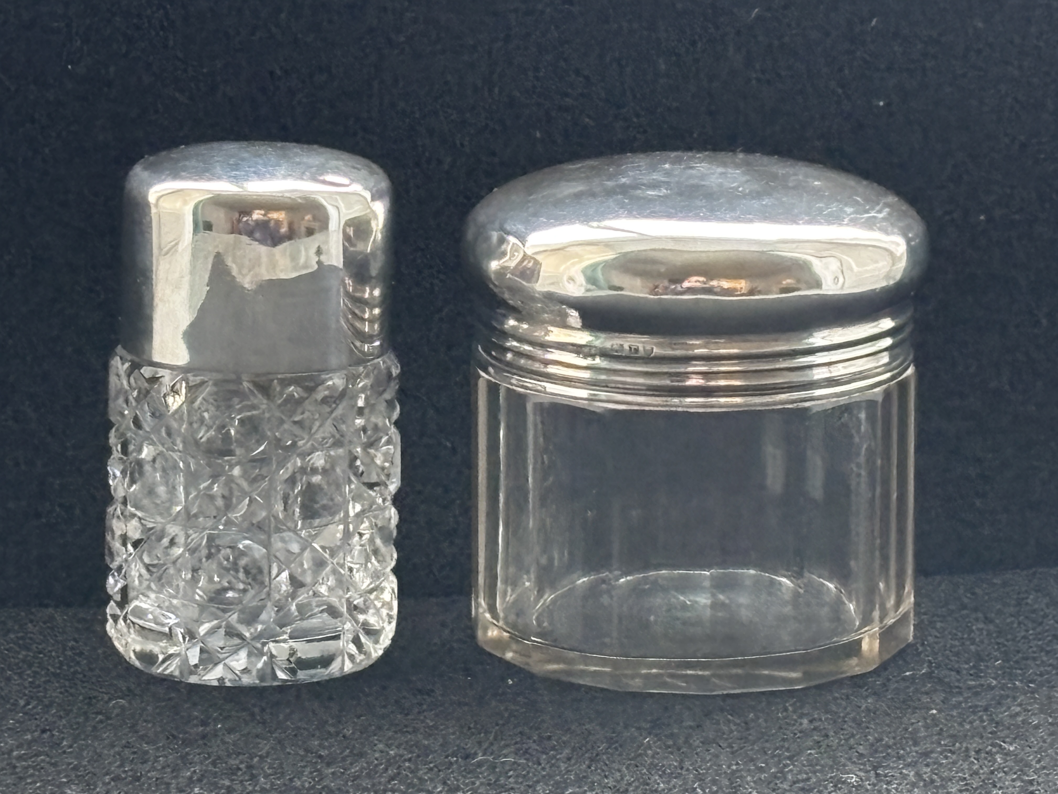 Two glass pots with HM Silver lids