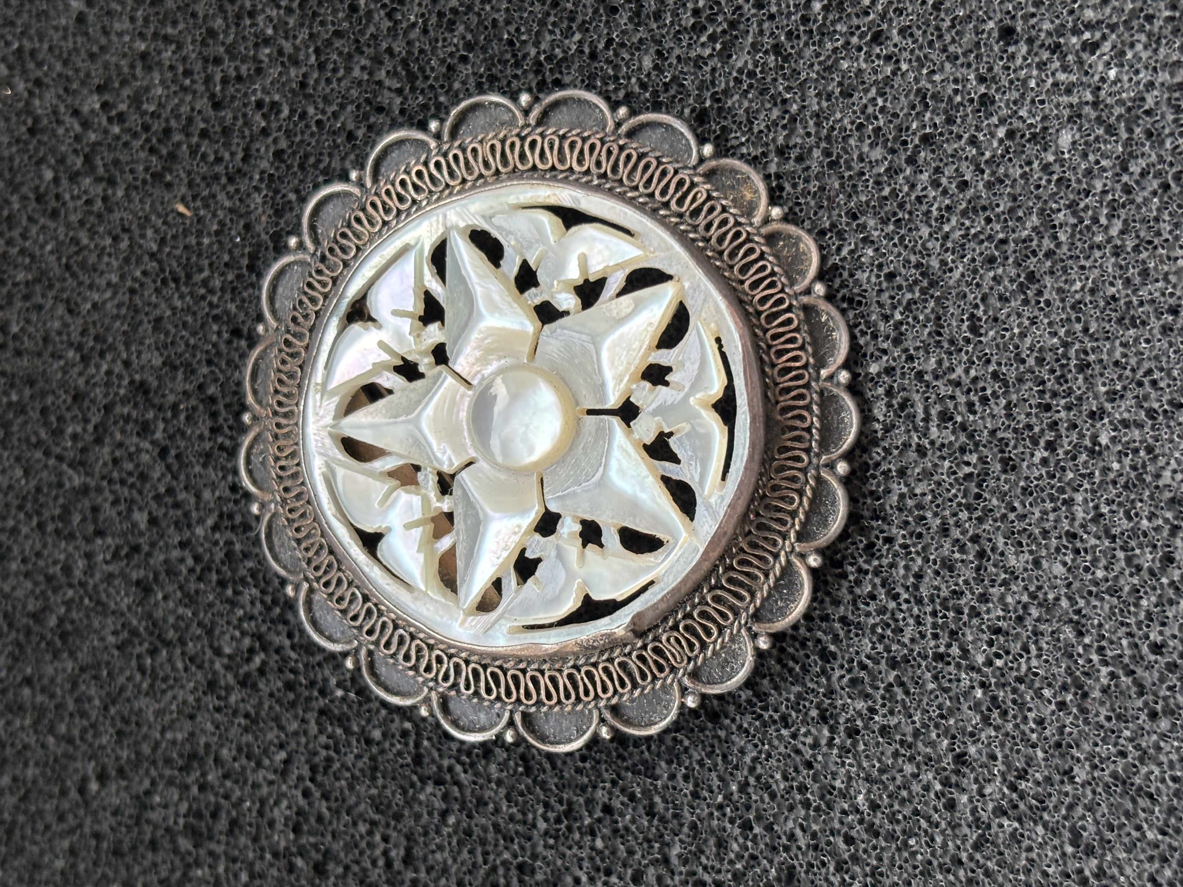 A Silver and Mother of Pearl Jerusalem Brooch/pendant with a diameter of 4cm