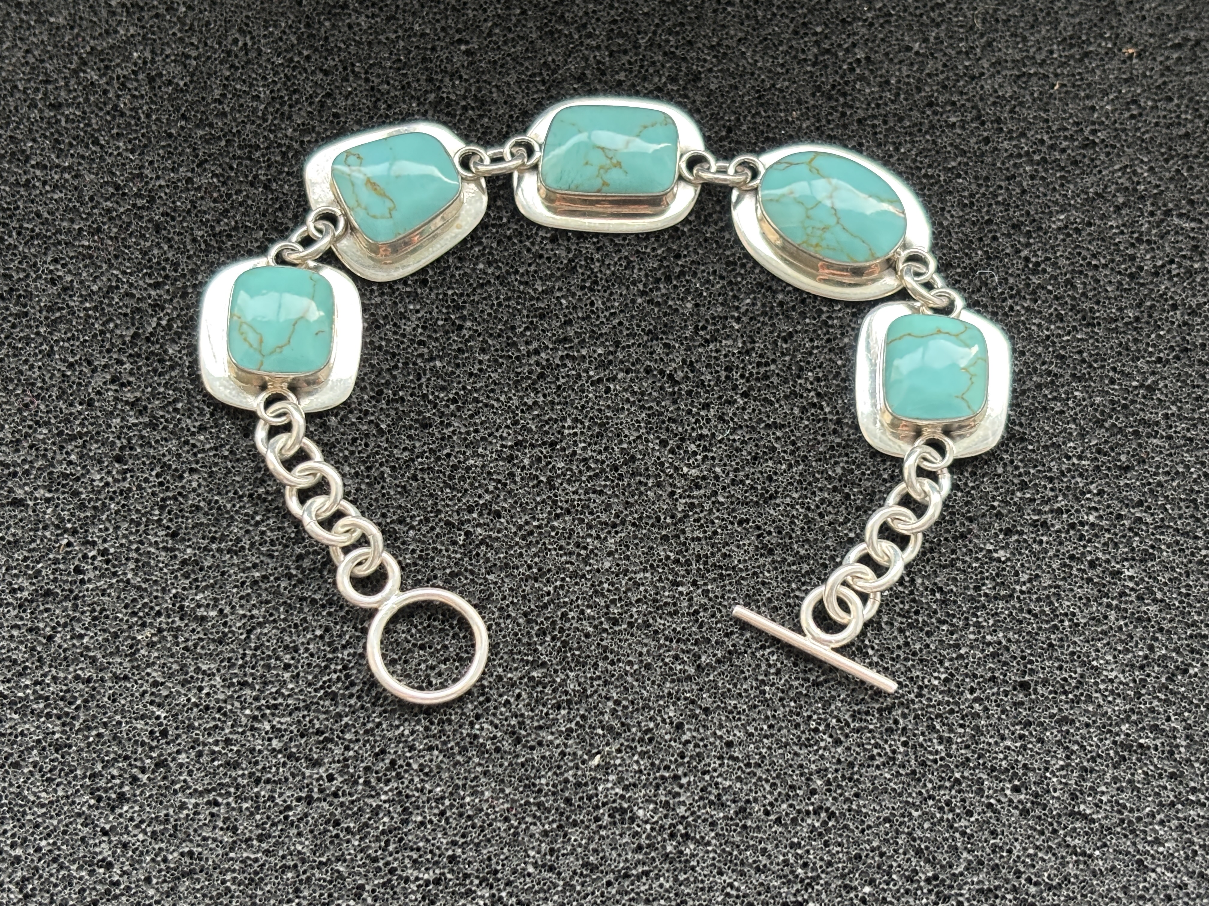 A silver bracelet with turquoise coloured stones weighing 22.4 gm overall