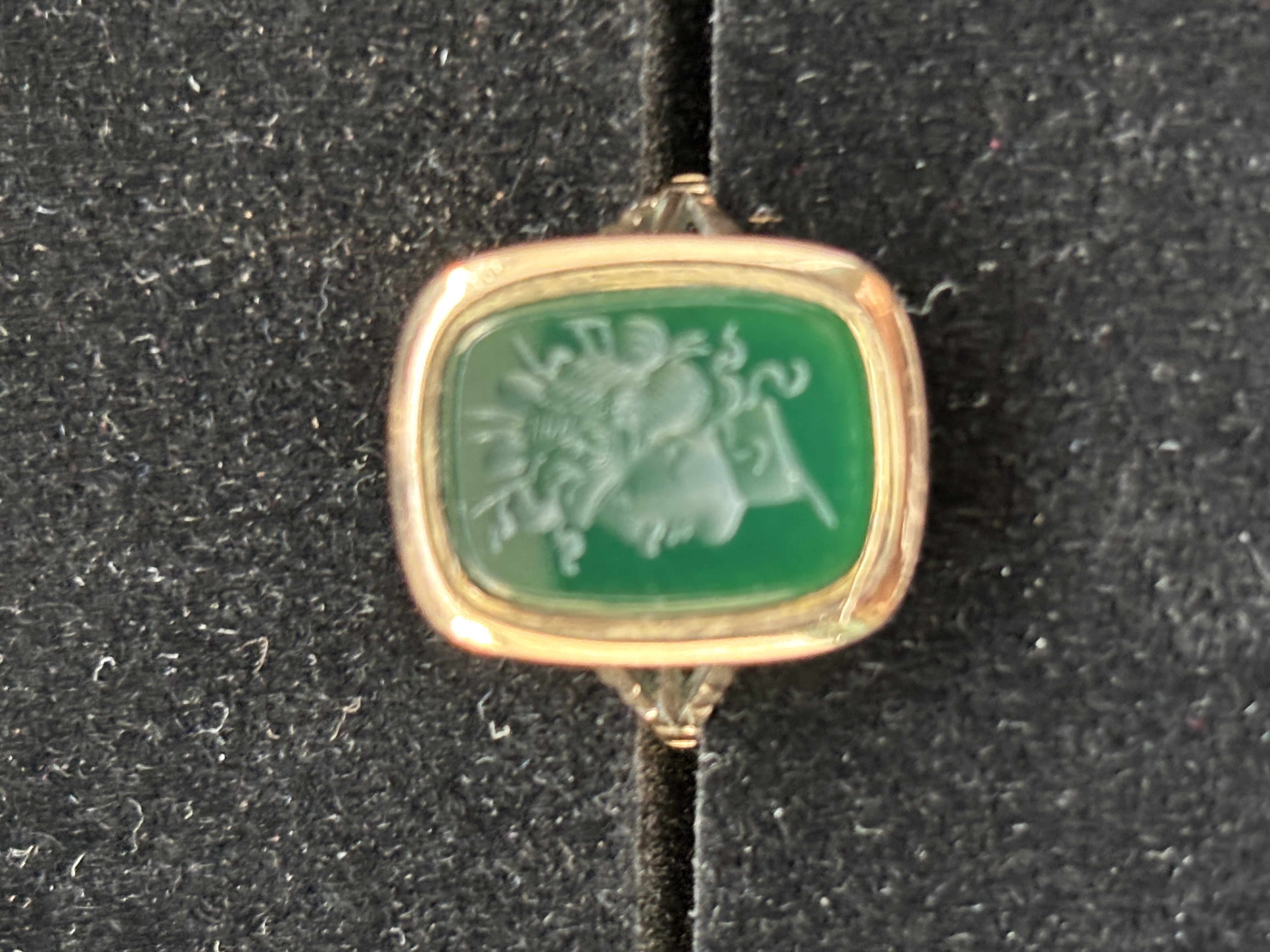 A yellow metal (awaiting verification for 18 ct gold) Intaglio ring size R weighing 3.5 gm