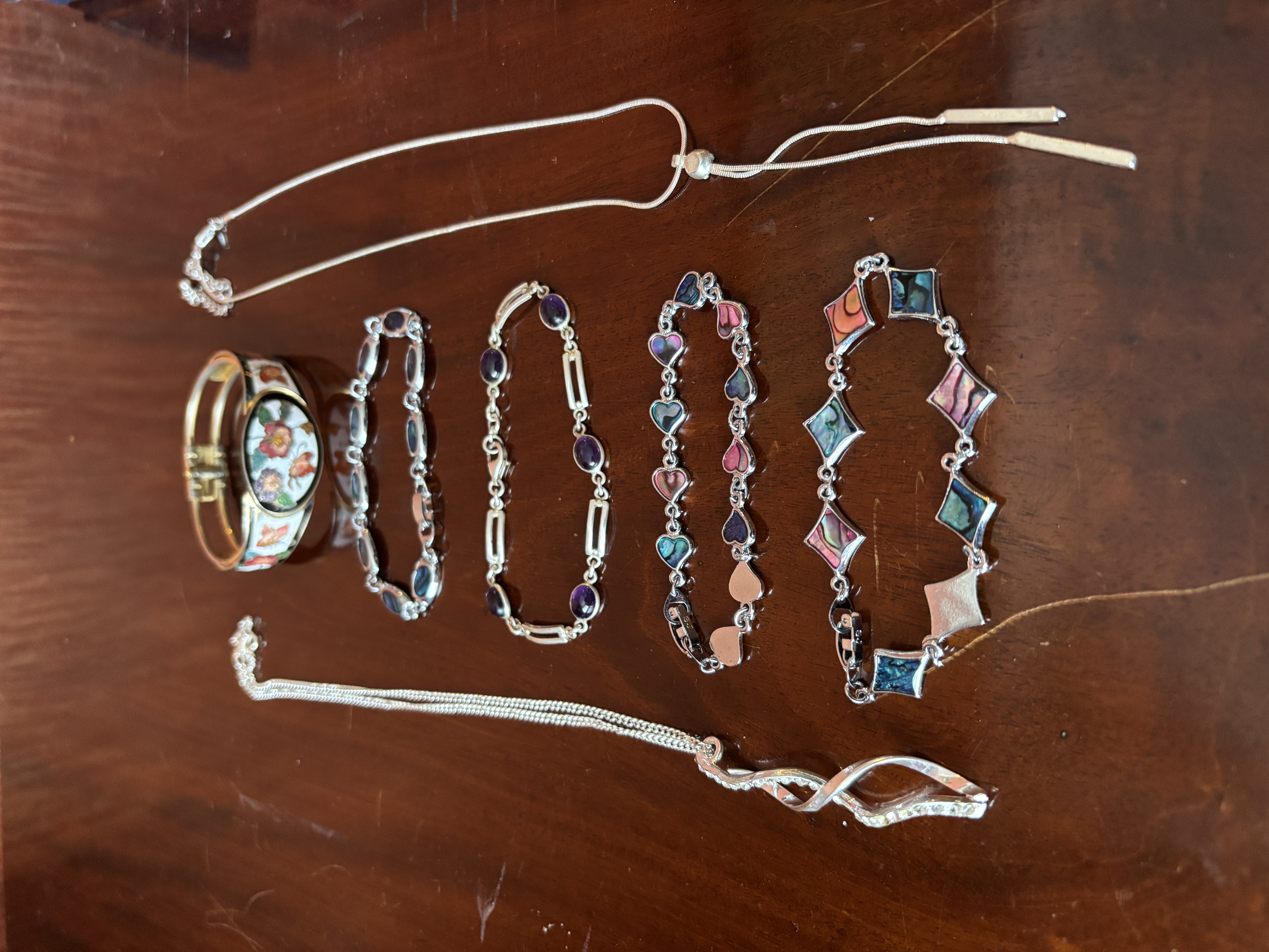 A silver and amethyst set bracelet together with four others and two pendants