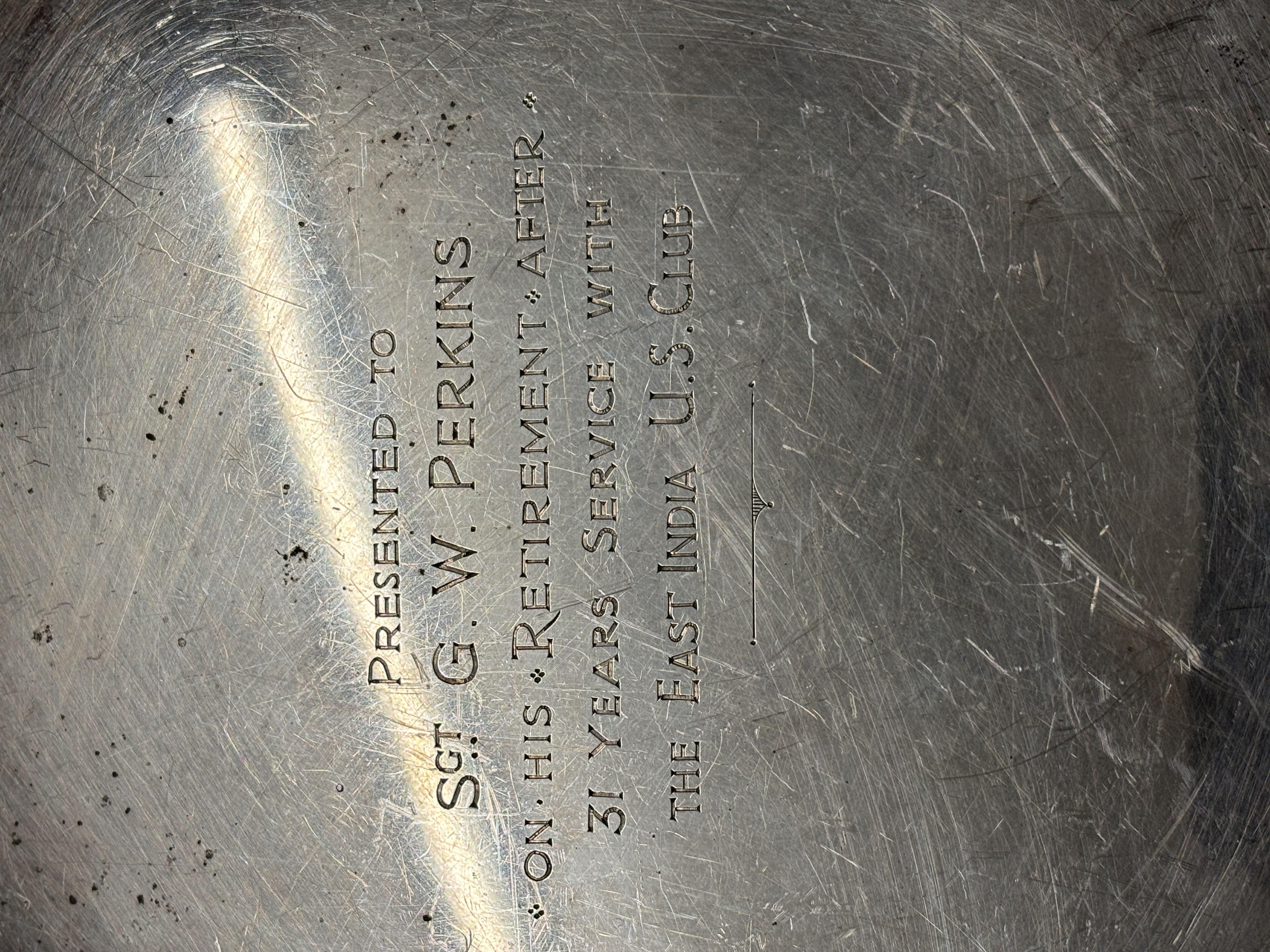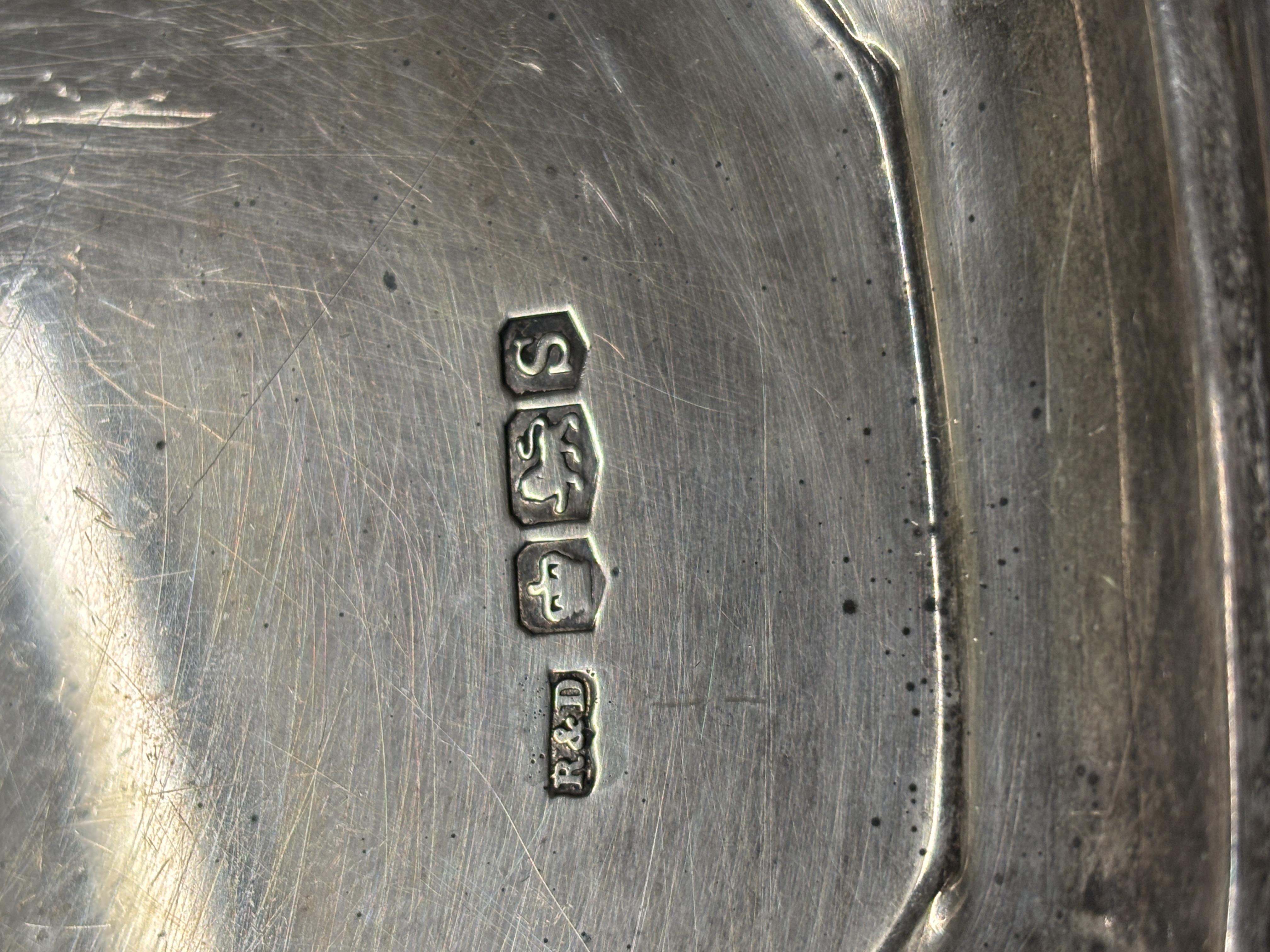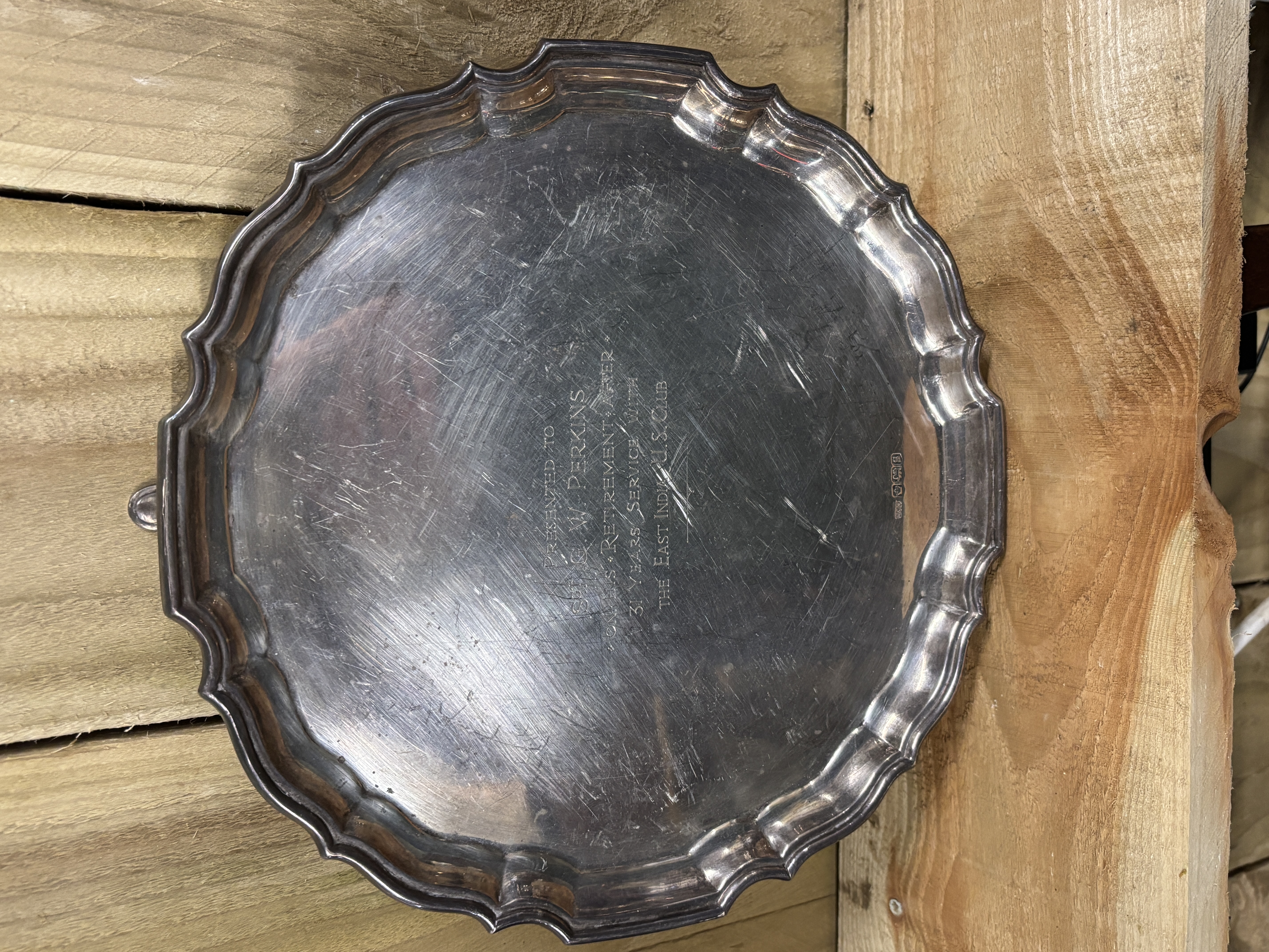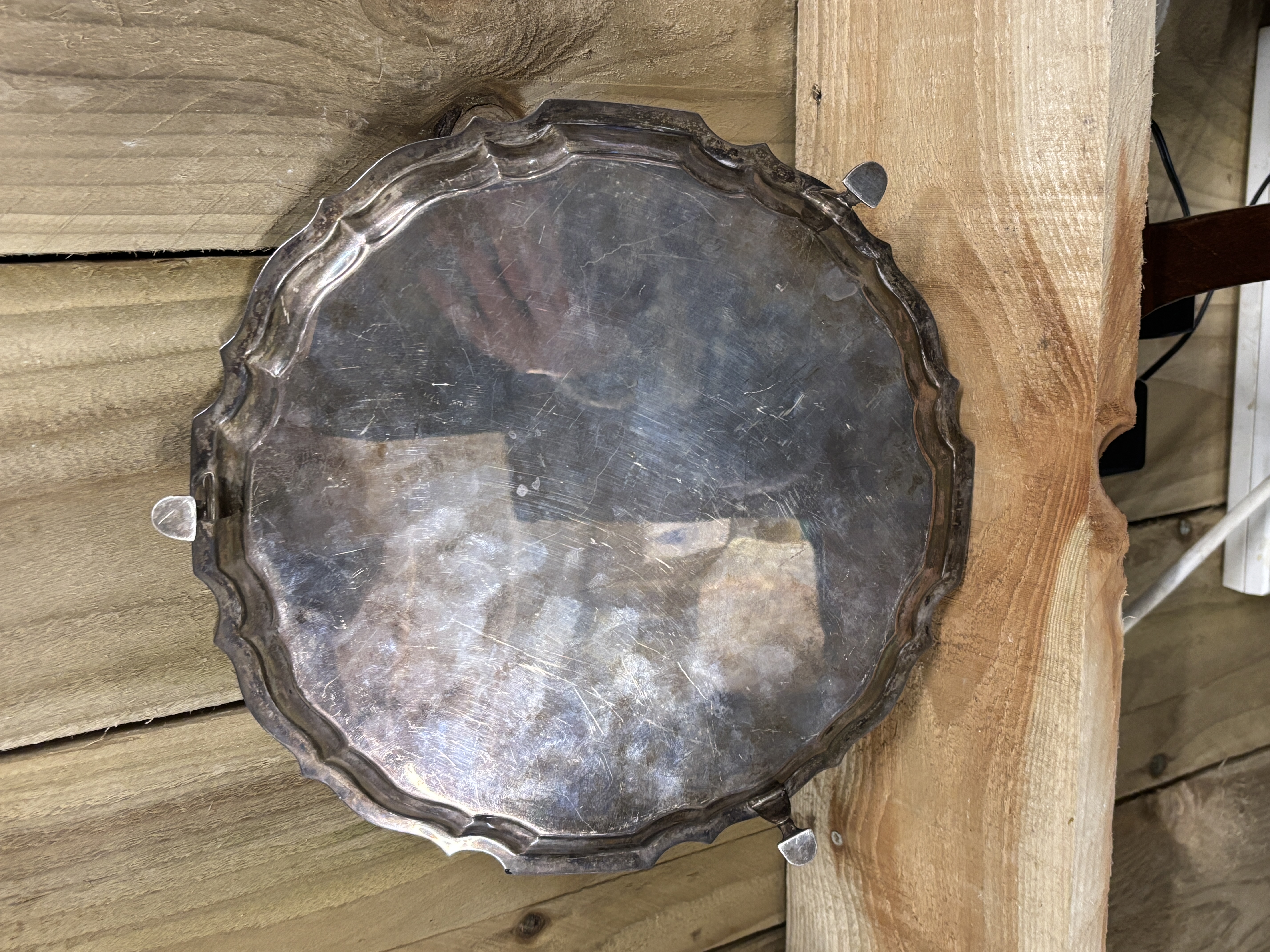A silver salver on three feet weighing 580...