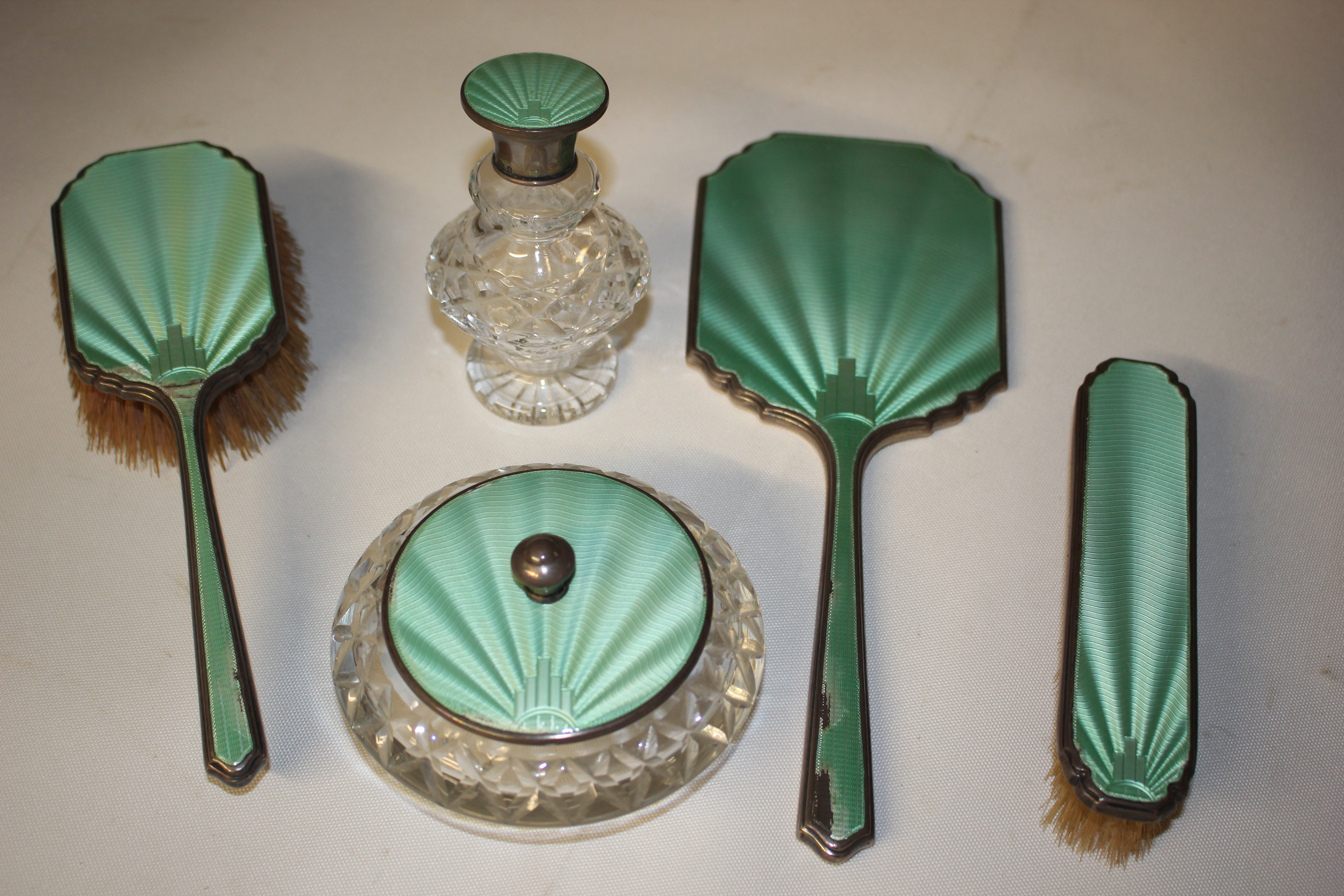 A silver and enamel dressing table set