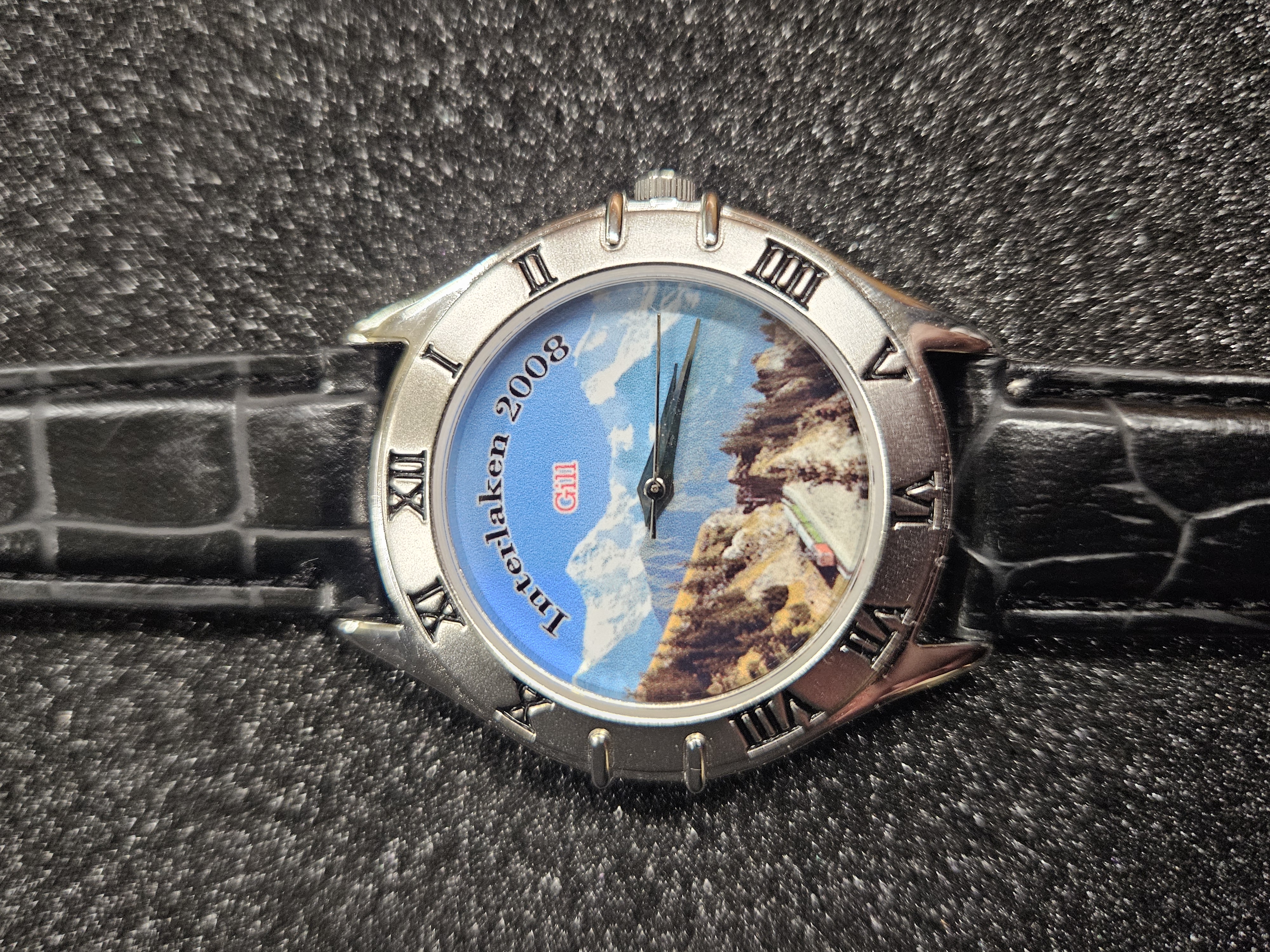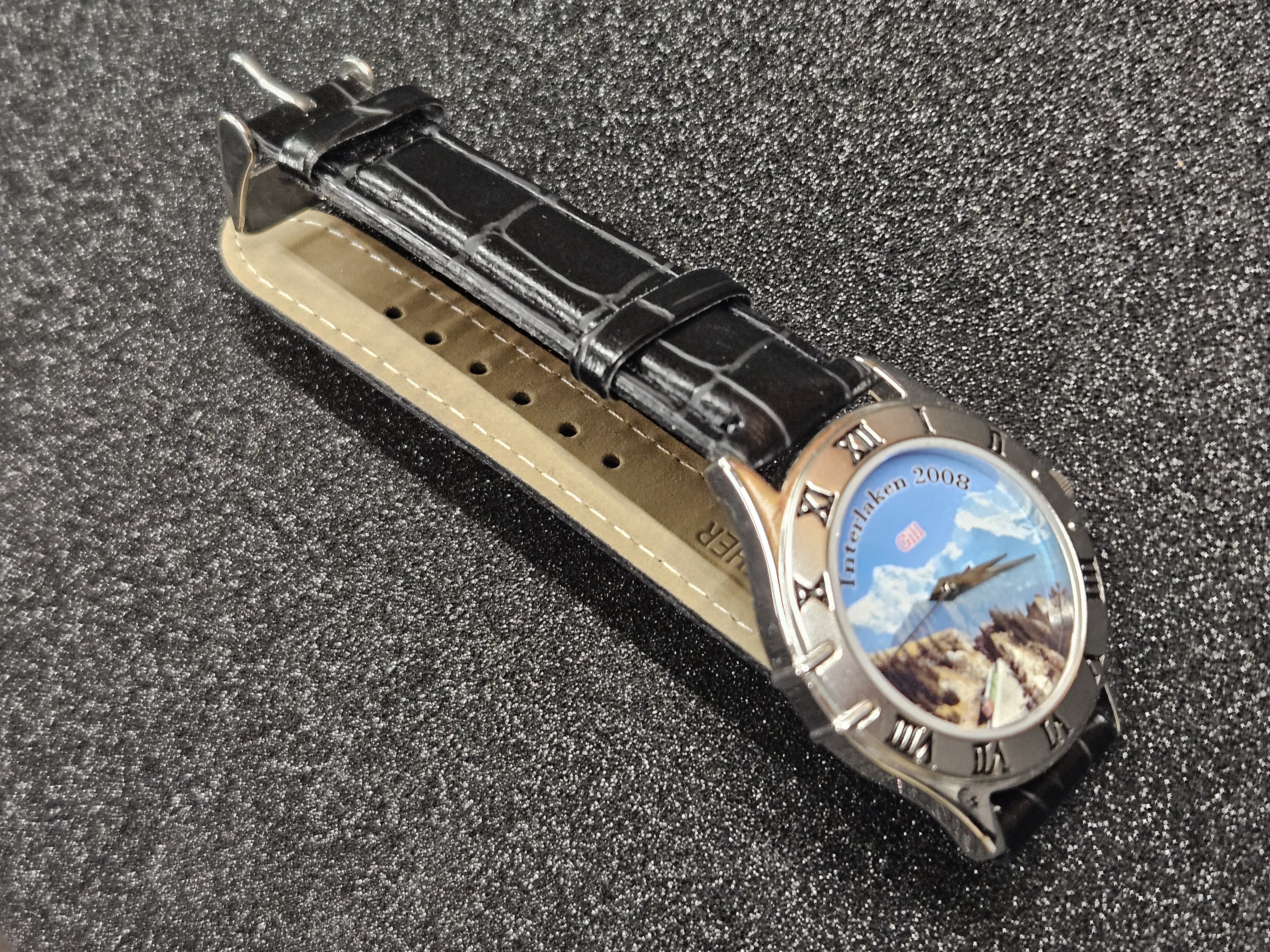 A Kandahar watch having Swiss quartz movement, rhodium plated case and sapphire crystal, with pictorial railway scenic face for Interlaken 2008, Dia 36mm