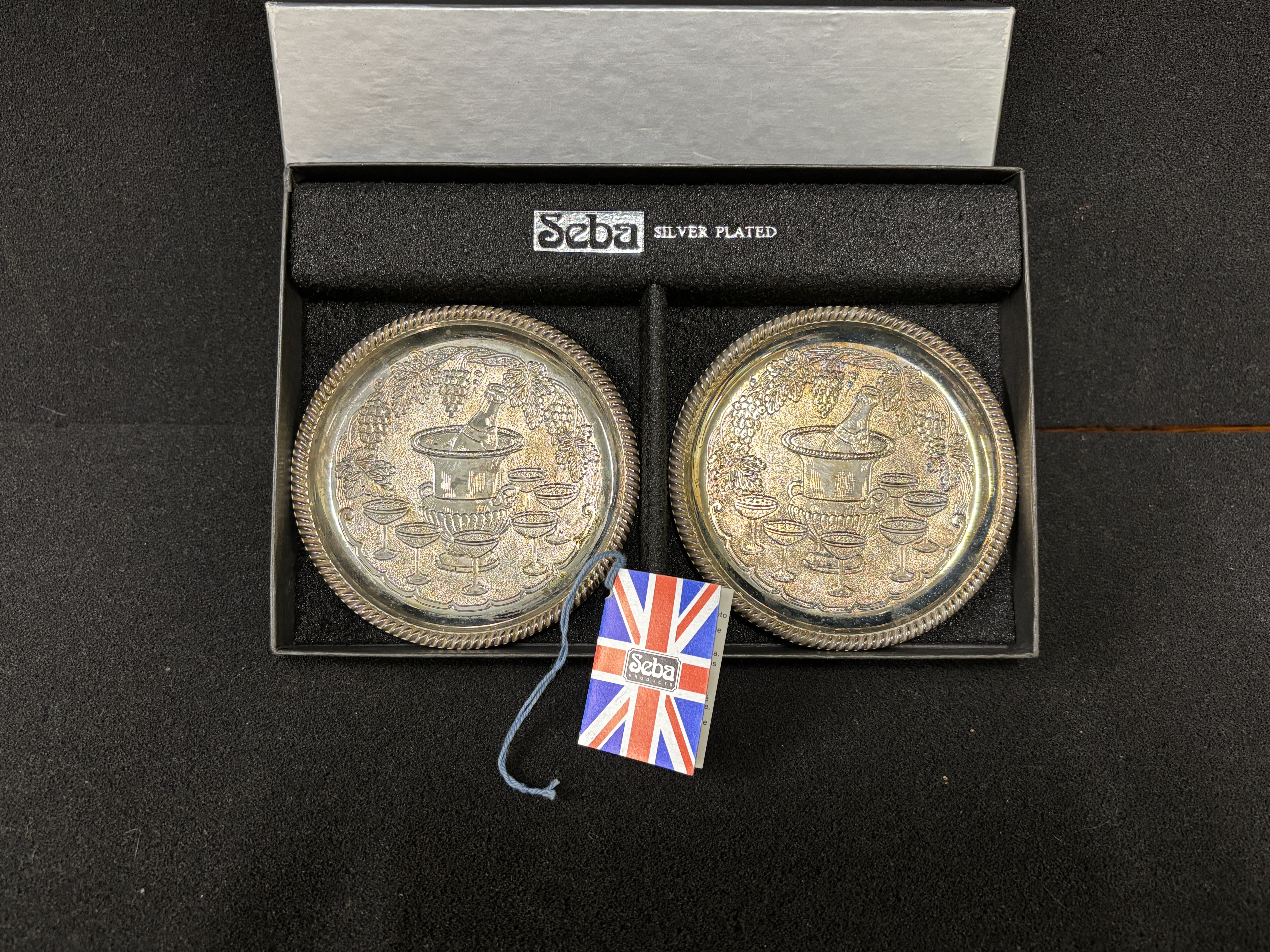 A pair of silver plated SEBA coasters in original box