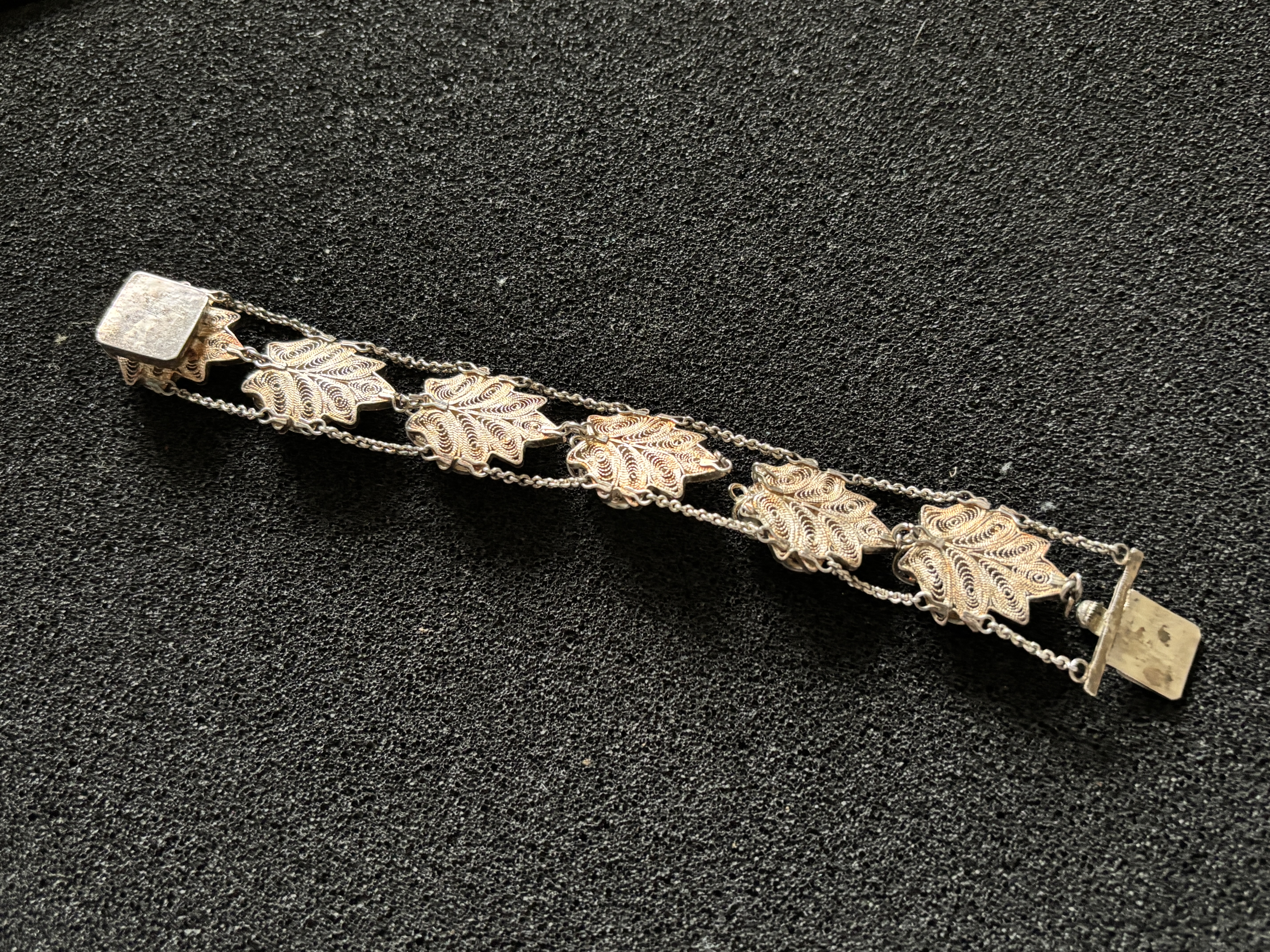 A silver filigree bracelet , 18 cm long and weighing 48.09 gm