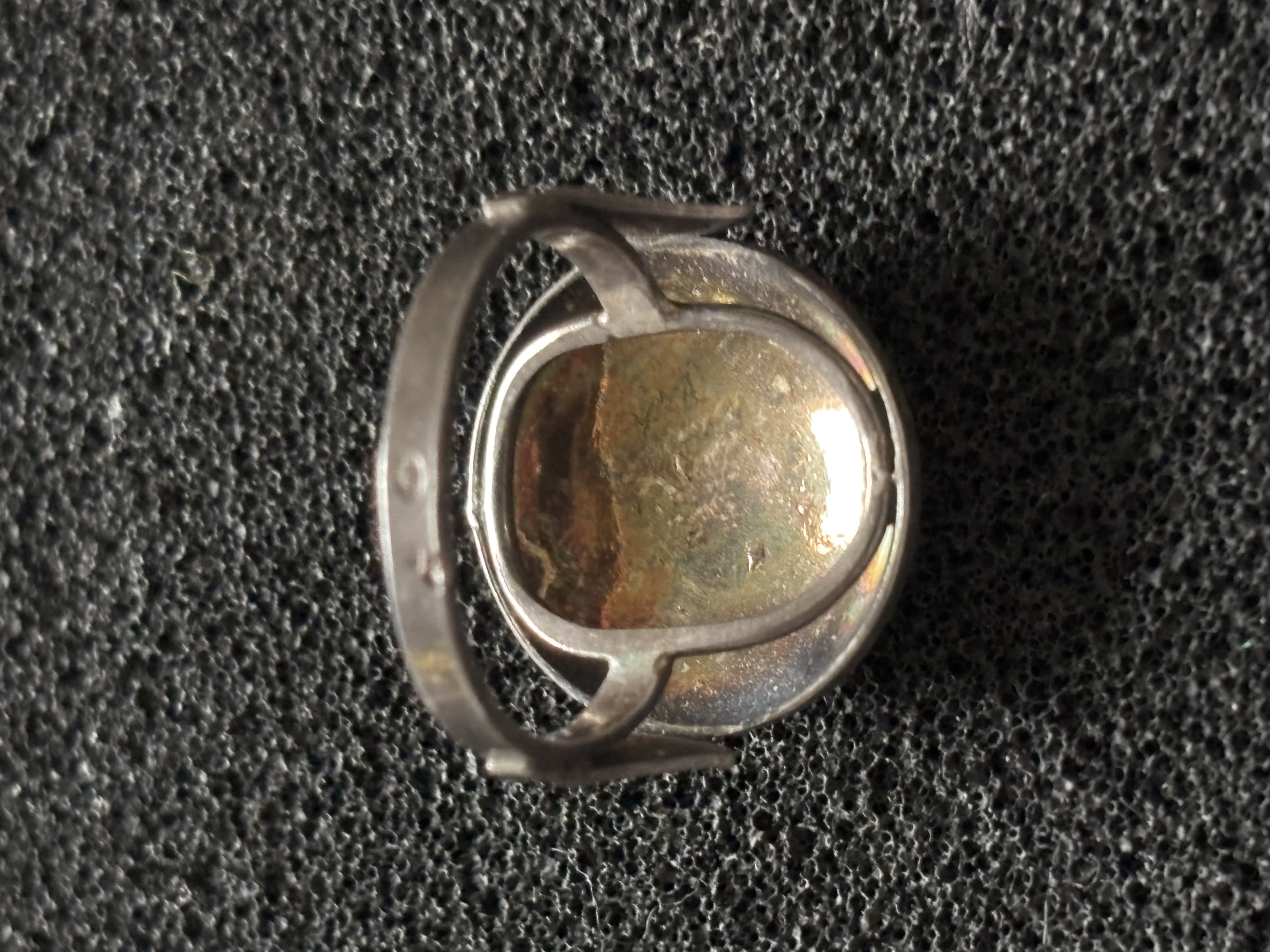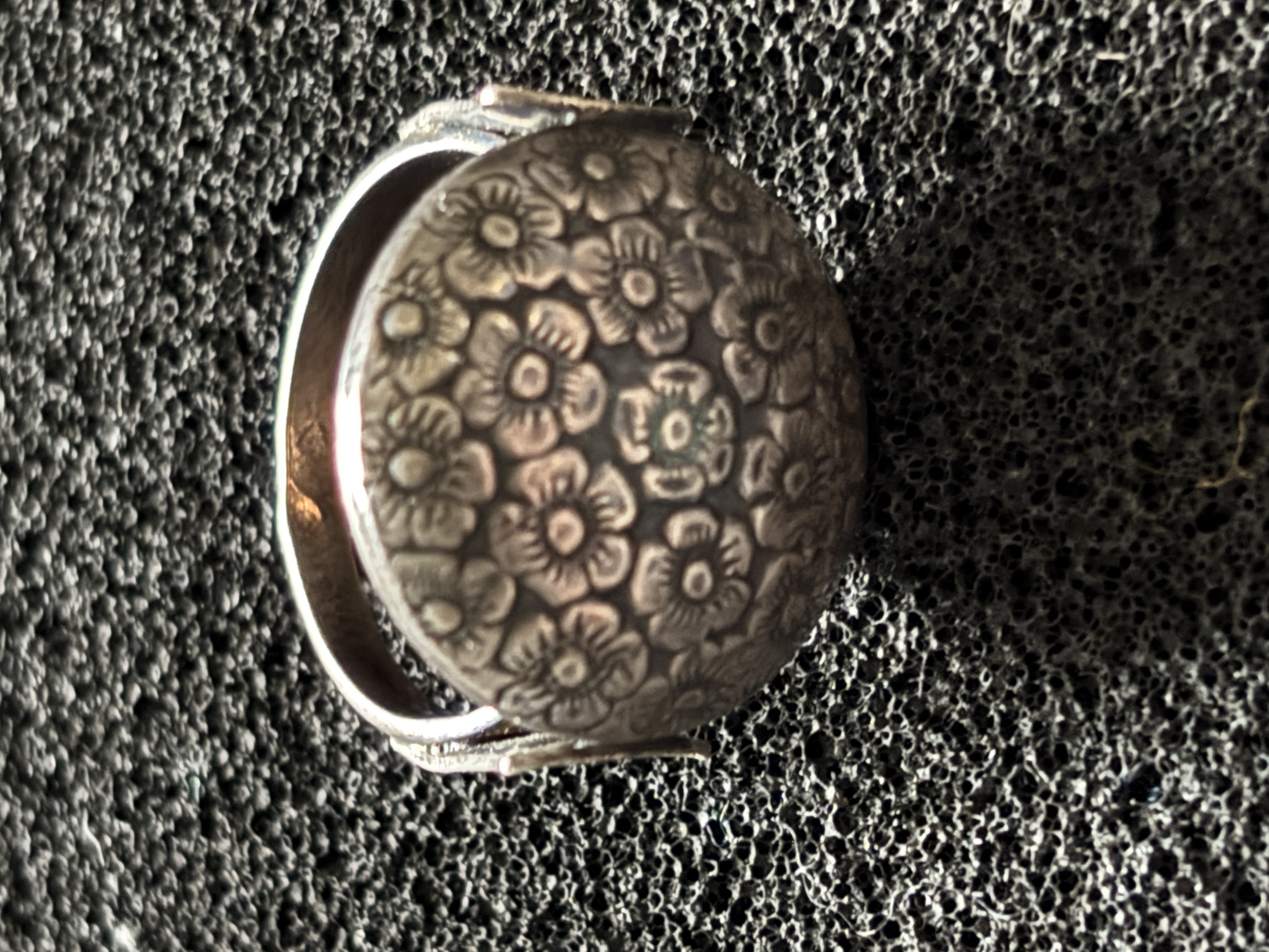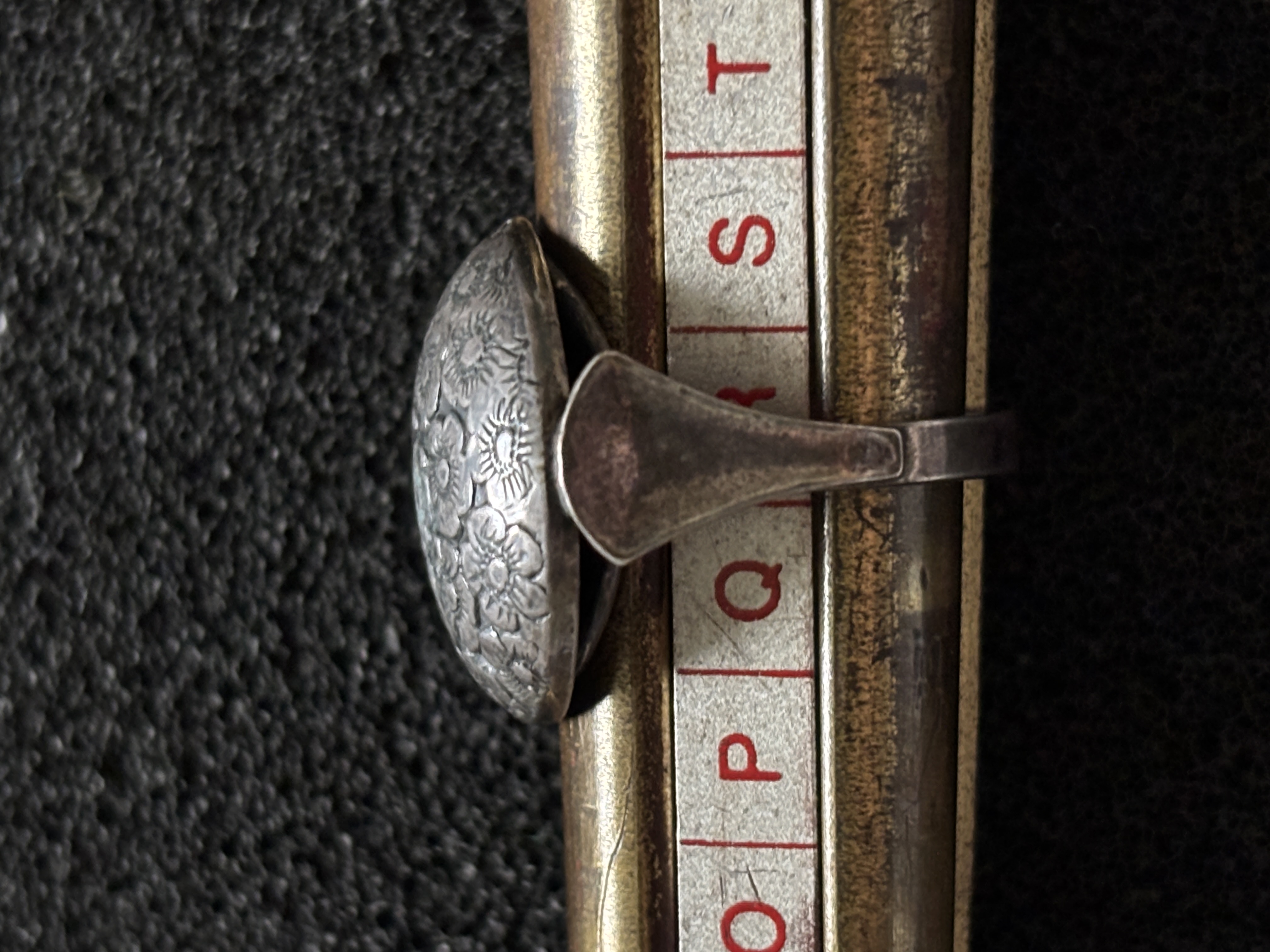 A silver ring with floral decoration size S/T and weighing 6.62 gm
