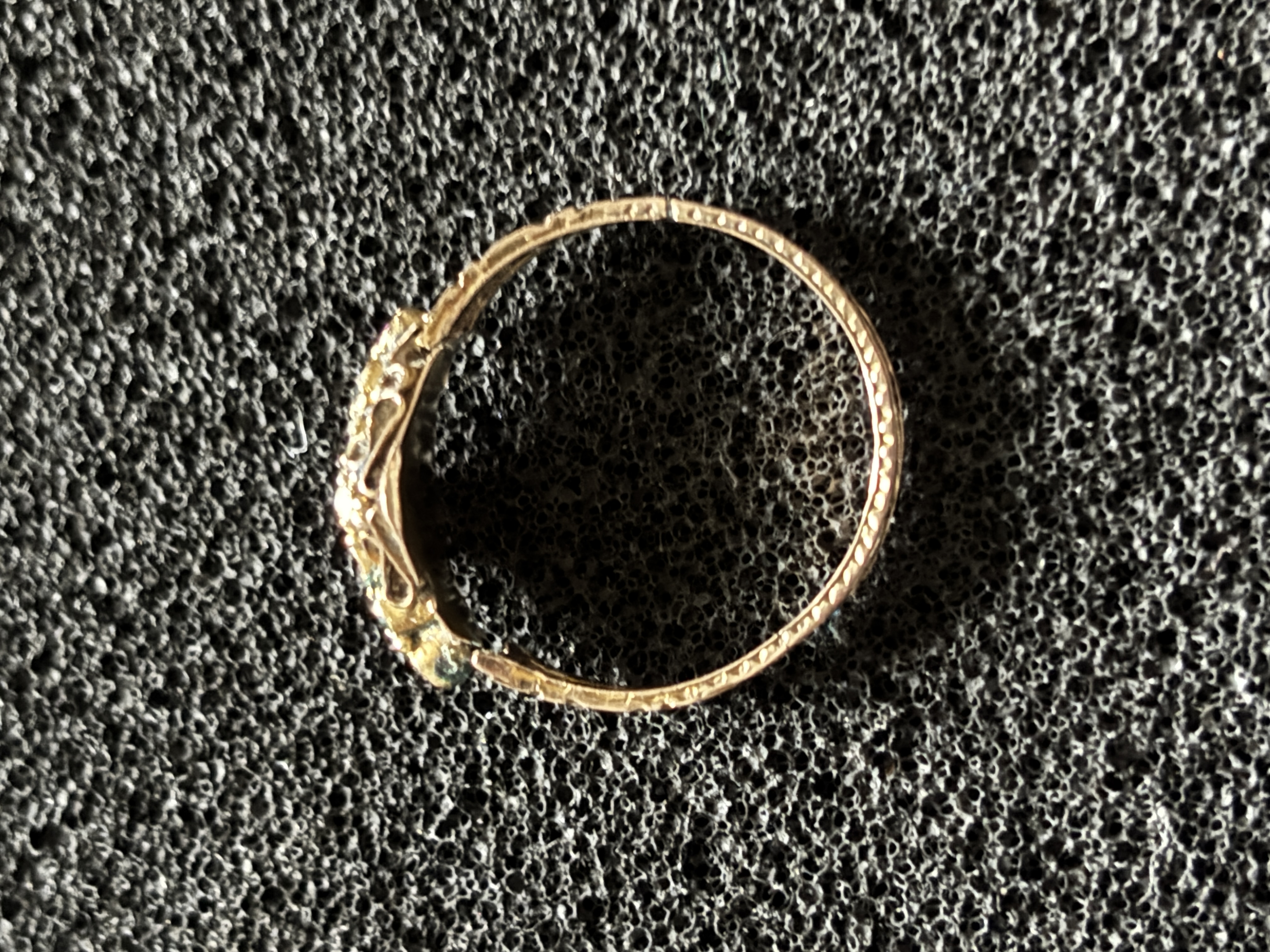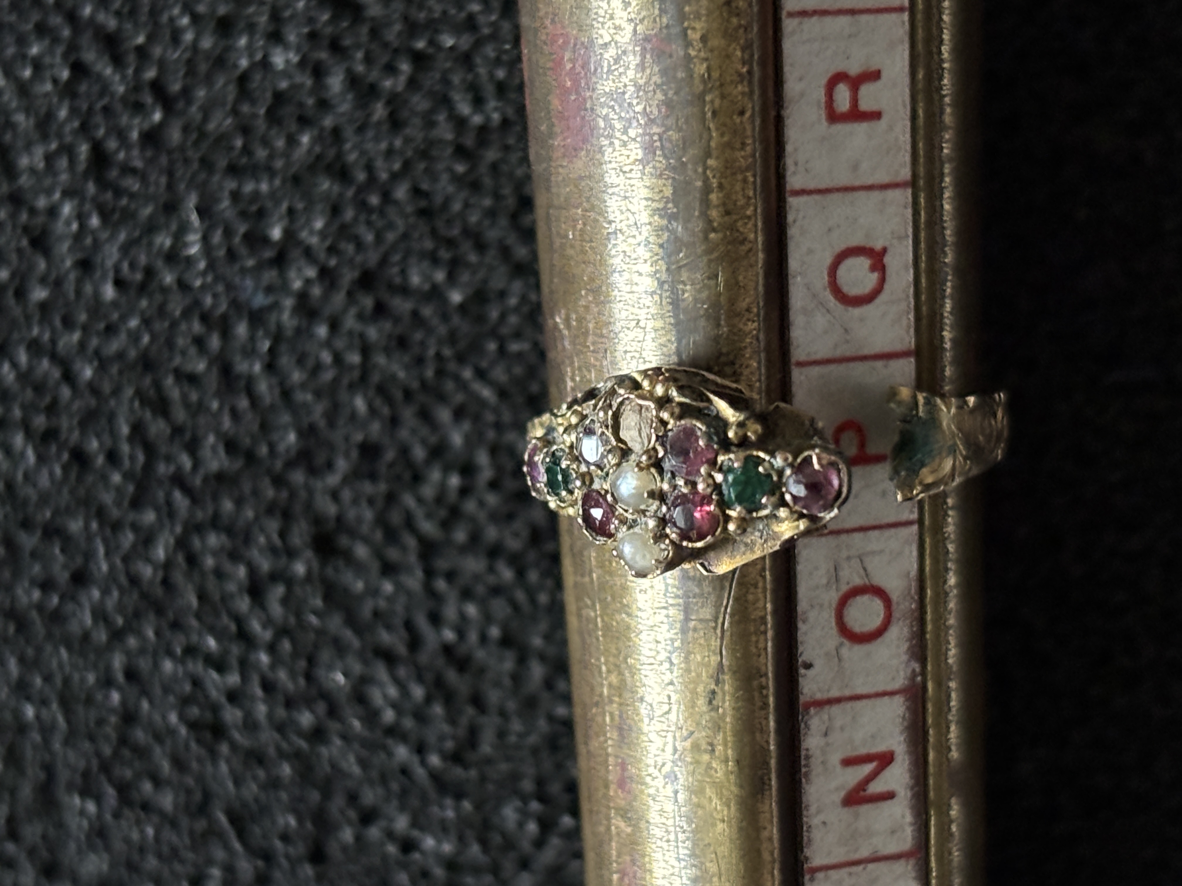 A Victorian 9ct gem set ring (emerald, garnet & pearl) weighing 1.59 gm (a/f)