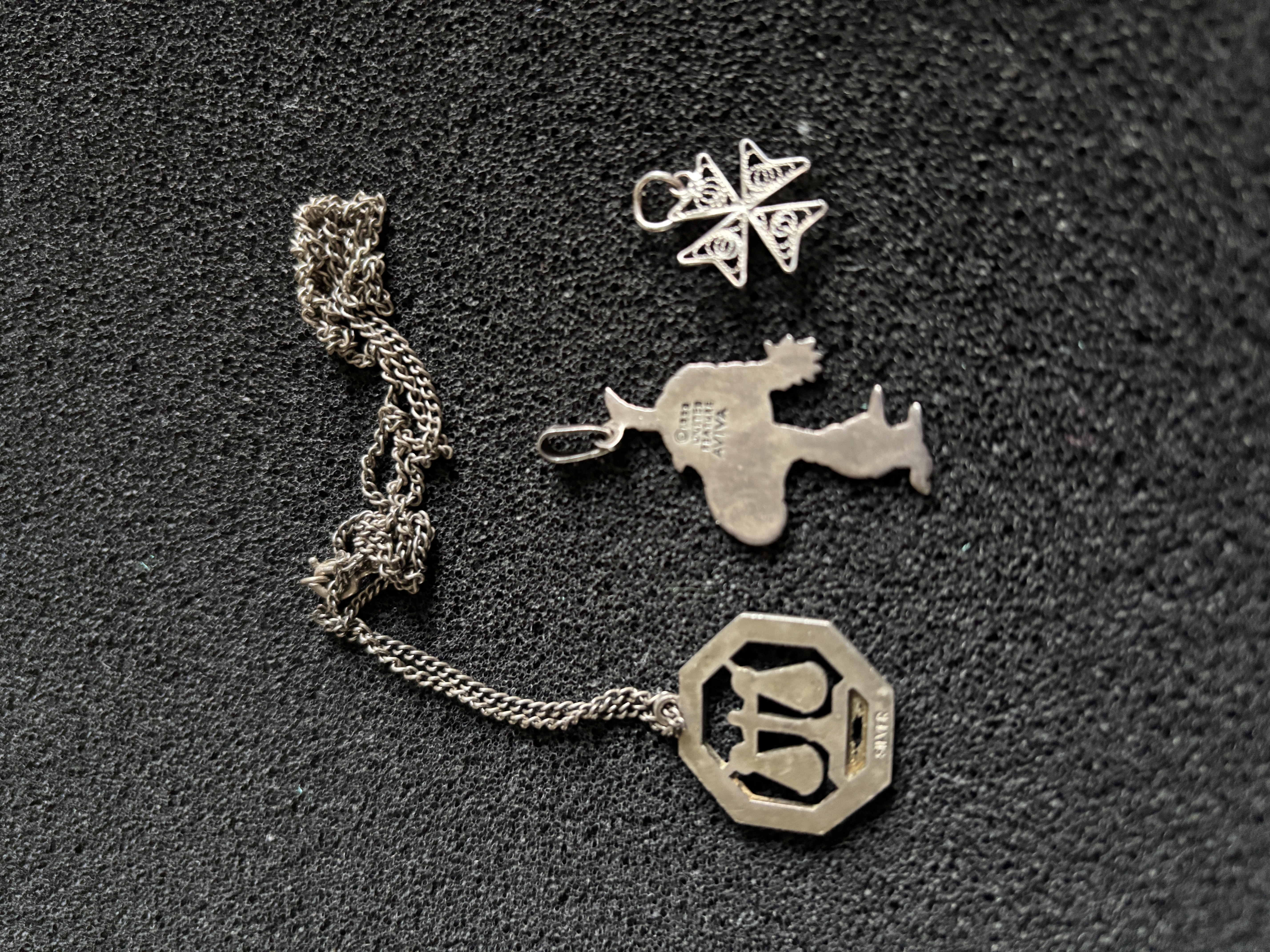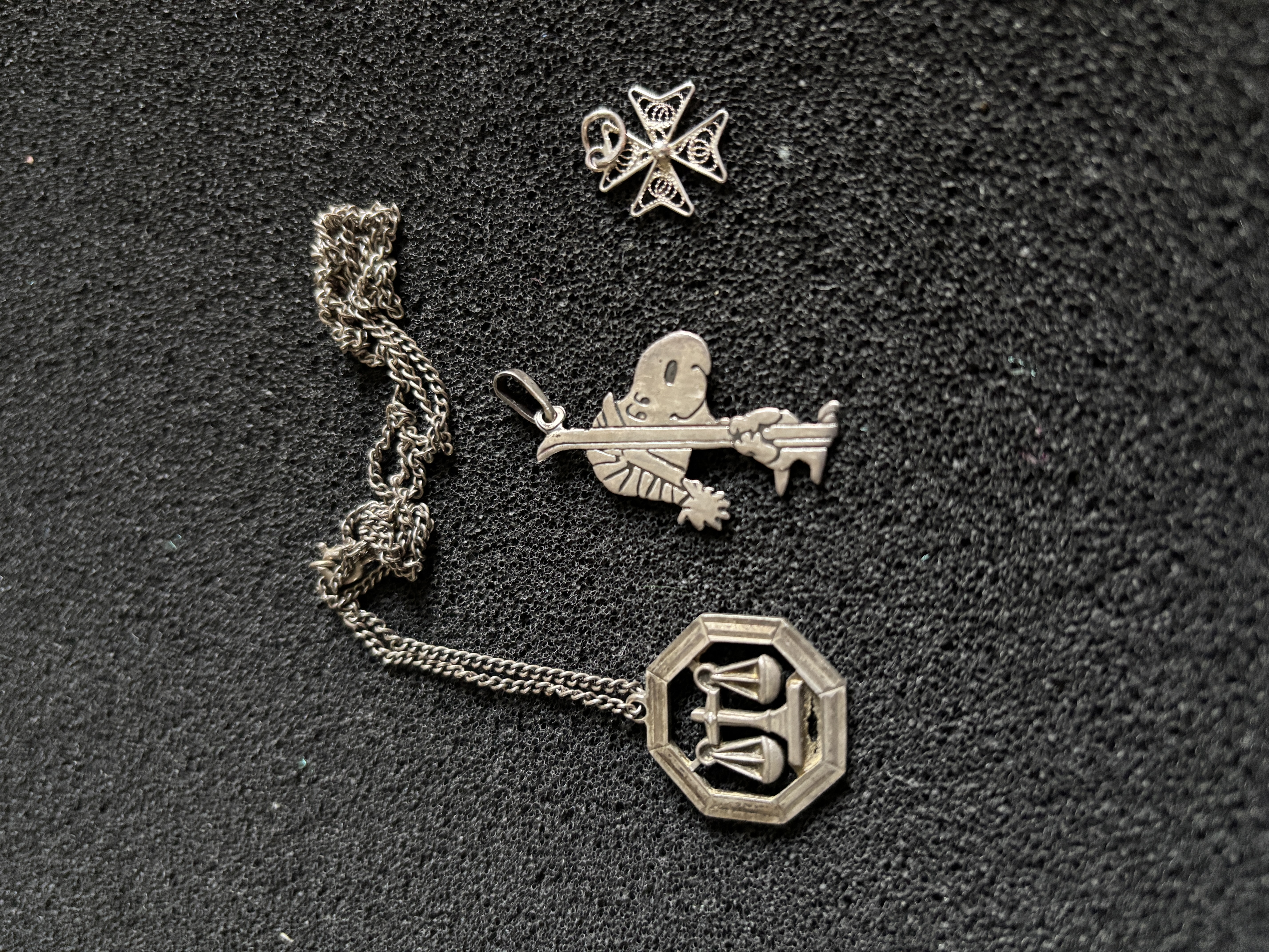 A mixed bag of silver to include a Snoopy skiing Pendant, Libra Scales and a filigree Maltese cross weighing 9.91 gm