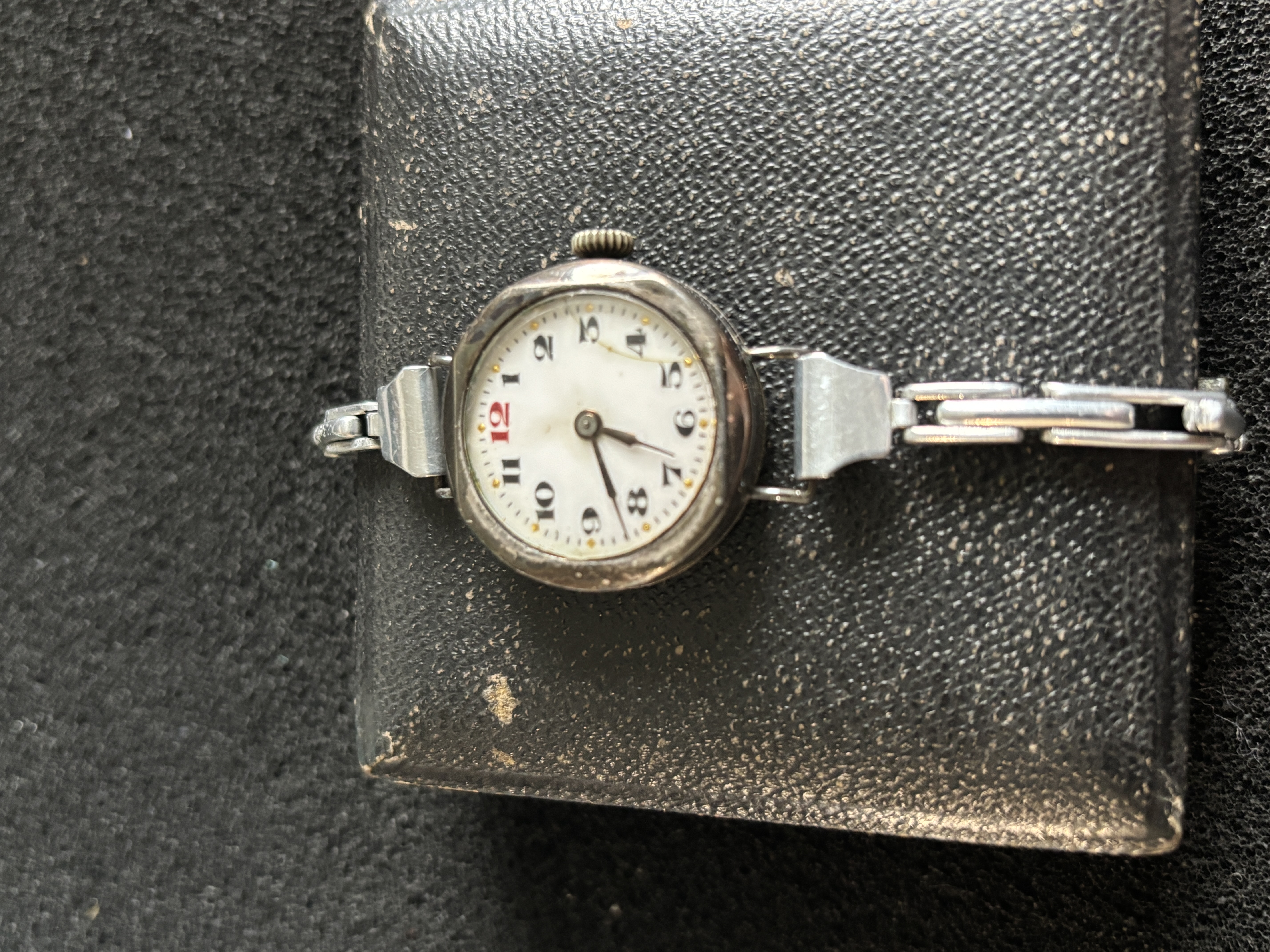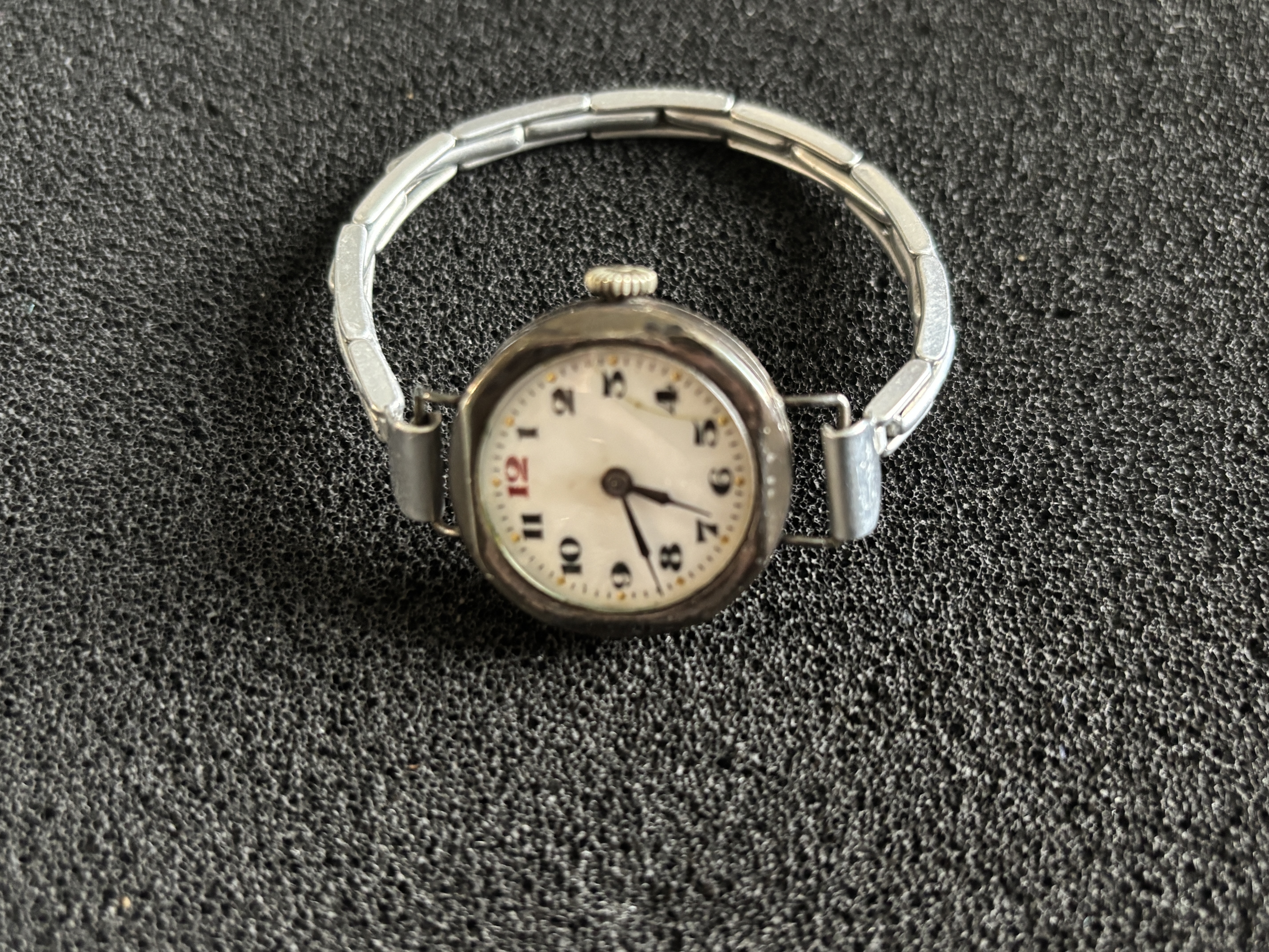A ladies red top wristwatch with expanding bracelet