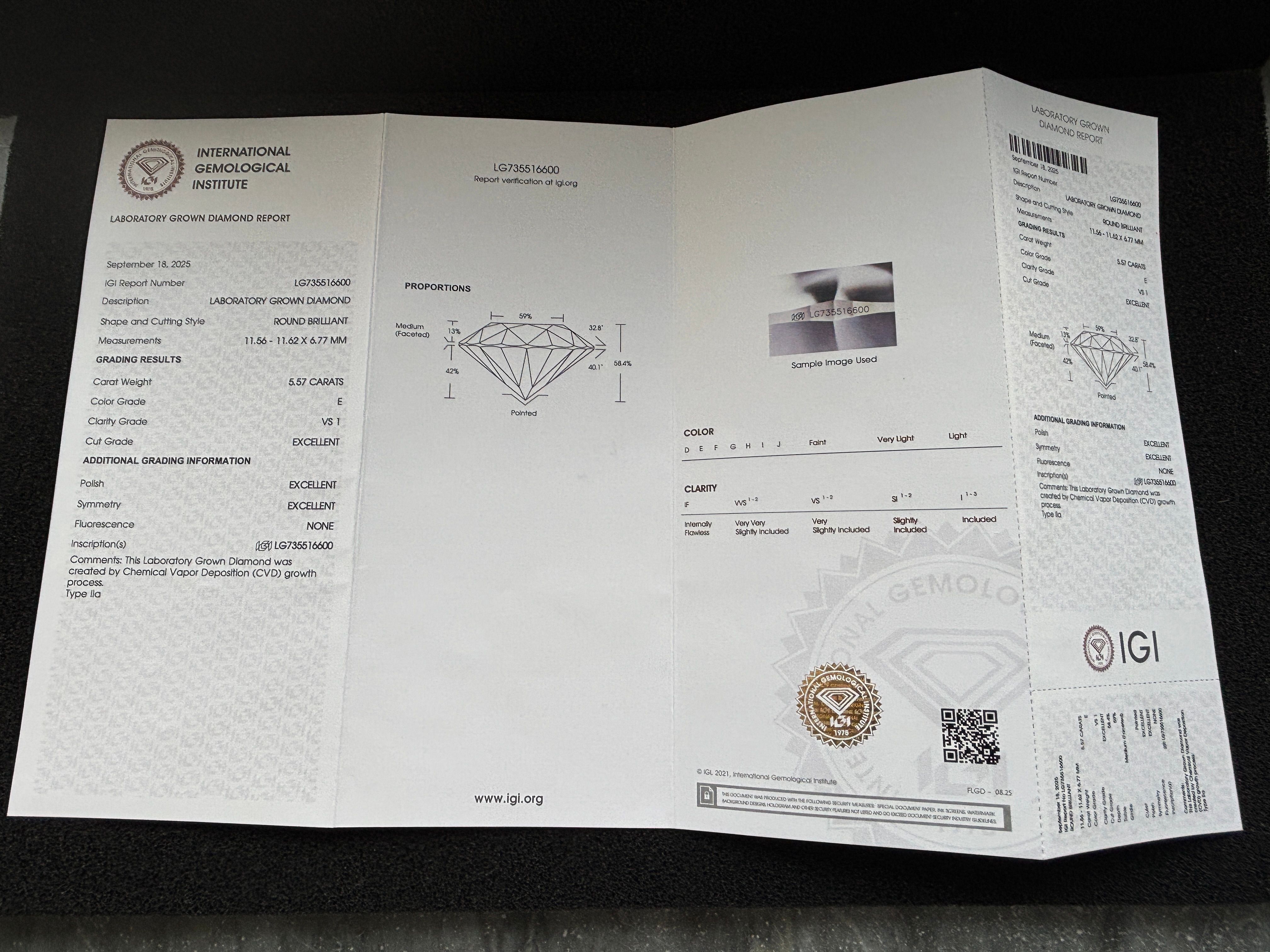 A platinum and lab grown diamond being 5.57 carat size K/L complete with certification