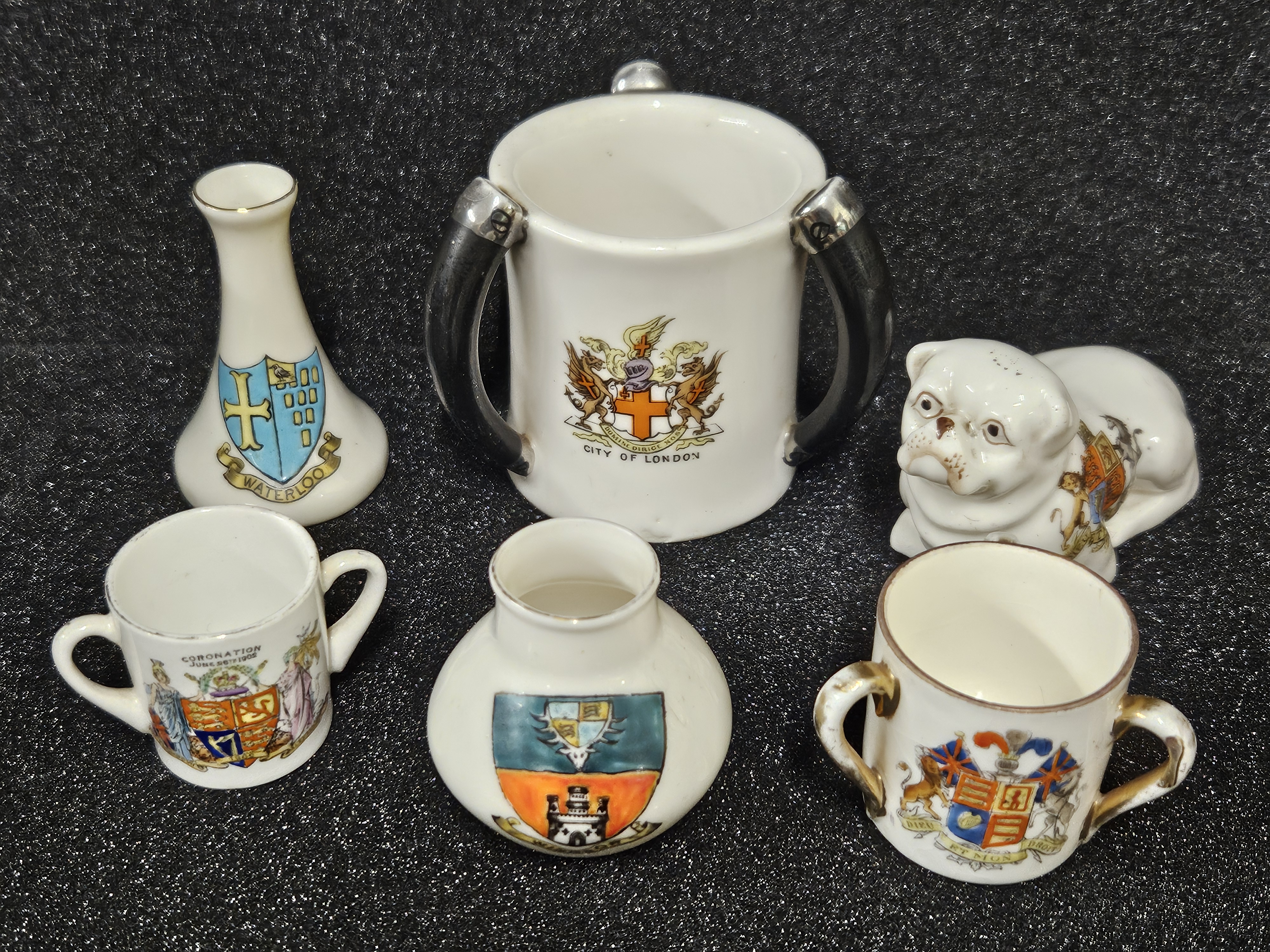 A selection of crested ware, including London tyg, coronation ware, pug etc, (af)