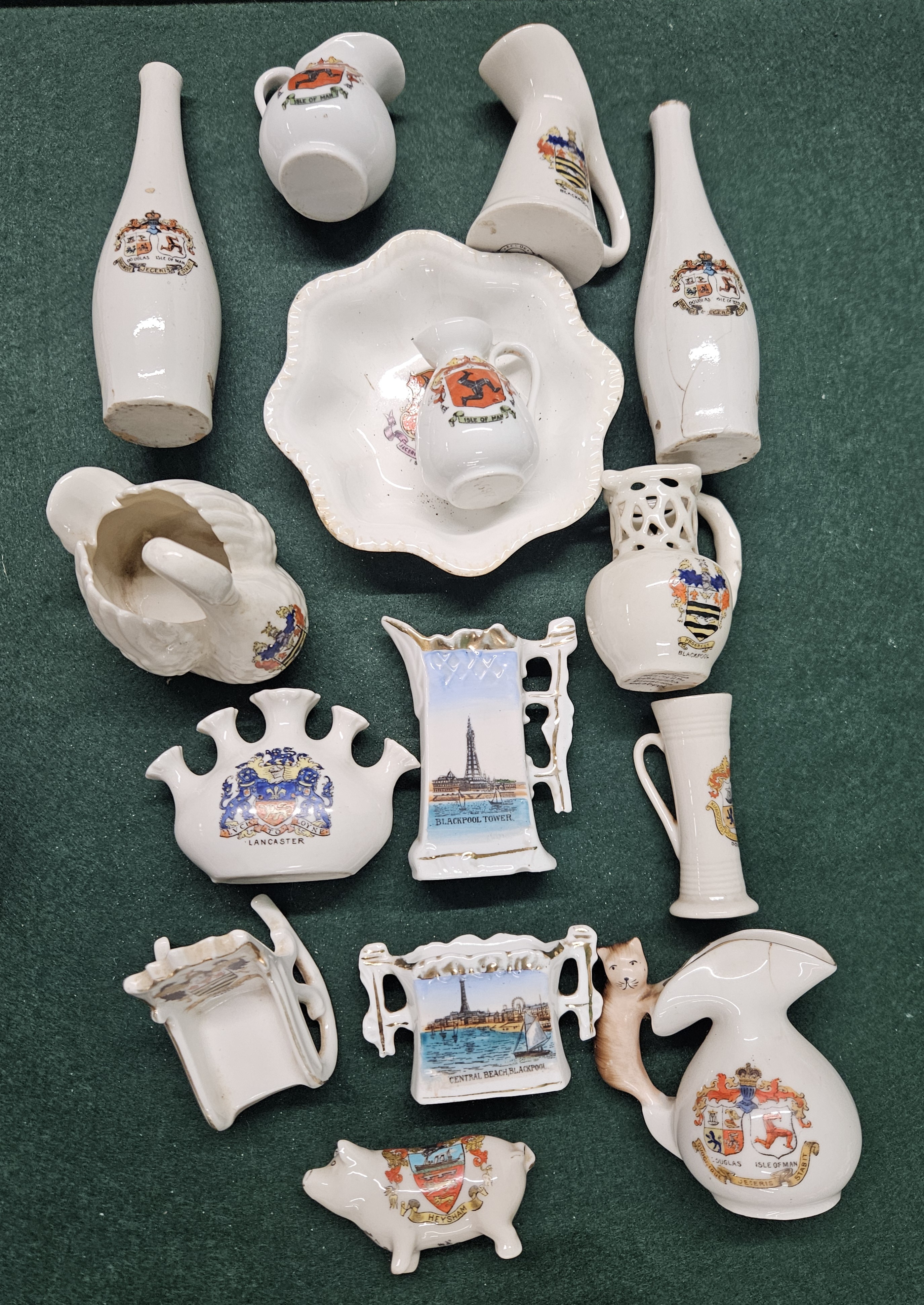 A selection of crested ware, including Blackpool rocker, jug, Lancaster bud vase, Isle of Man dish, etc, (af)