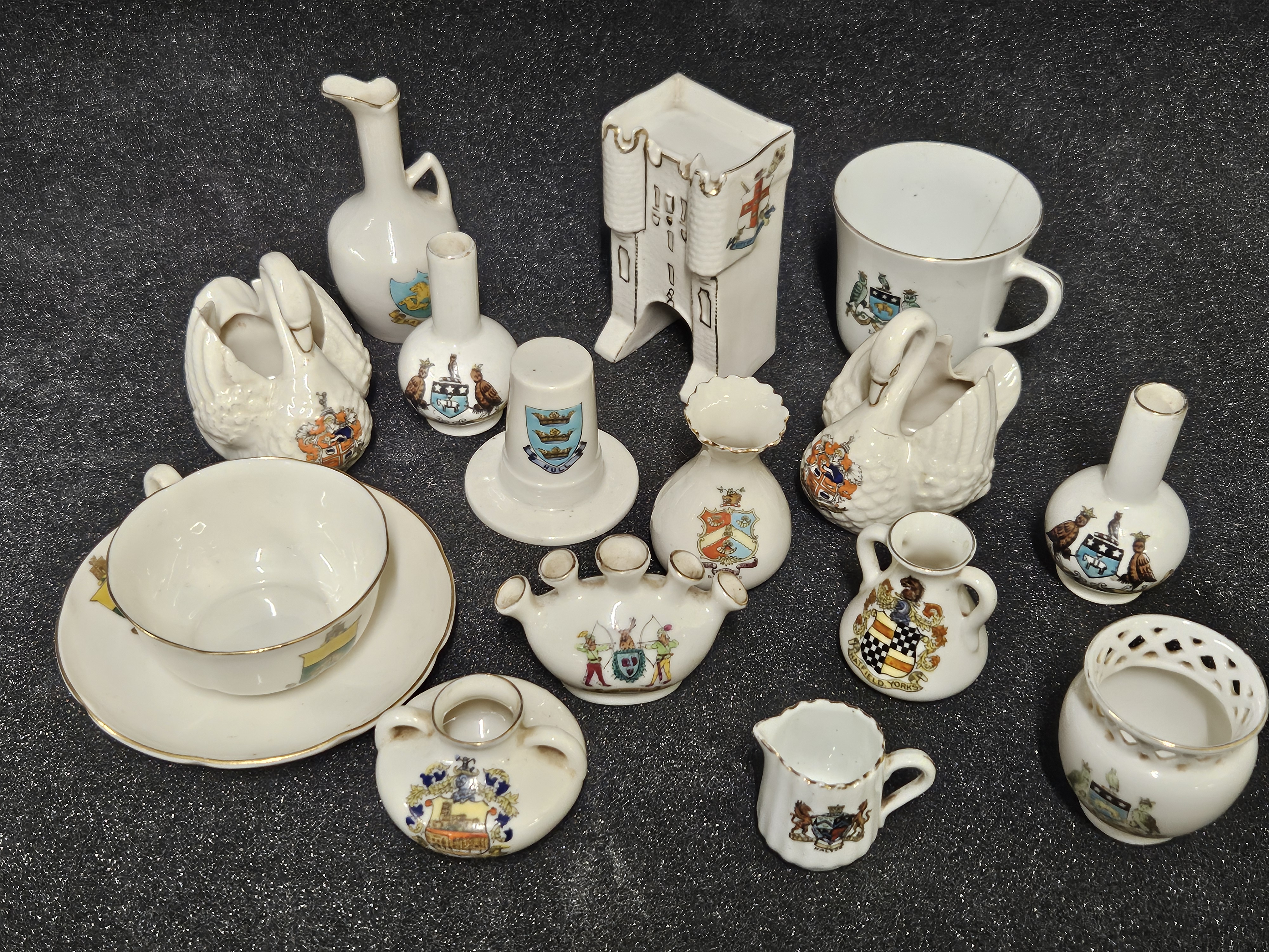 A selection of crested ware, Harrogate swans, York toll, Leeds vase, Skipton tea cup, Hull topper, etc, (af)