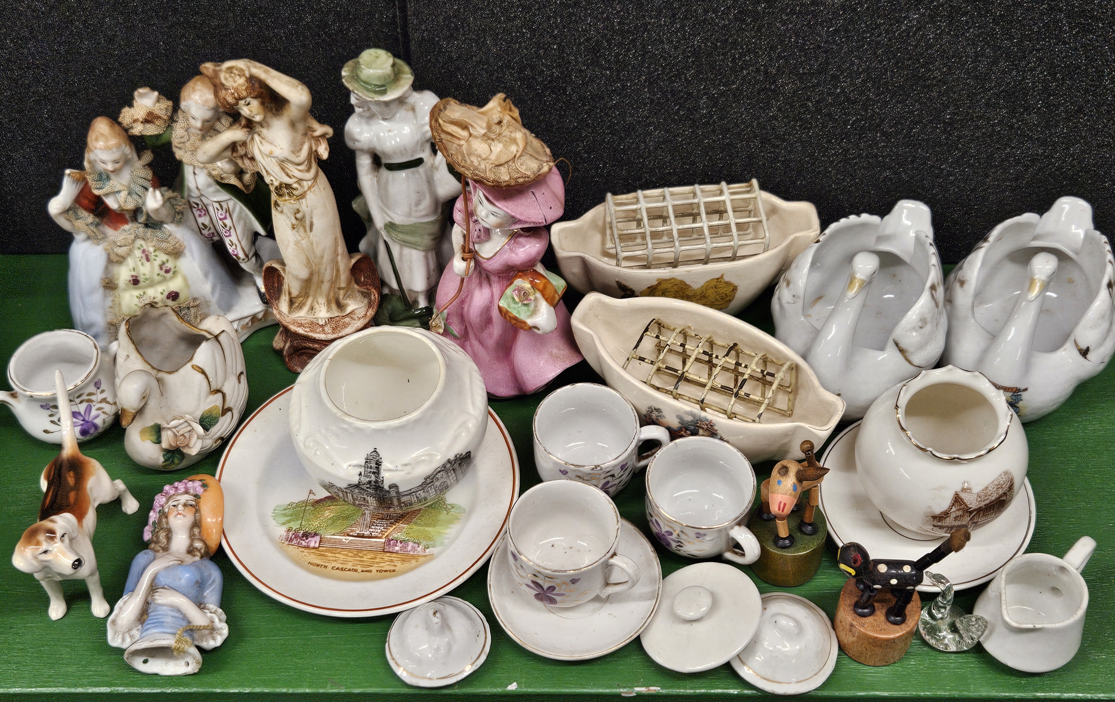 A selection of ceramics and misc, including Beswick foxhound, crested ware Lowestoft swans, pin head doll etc, (af)