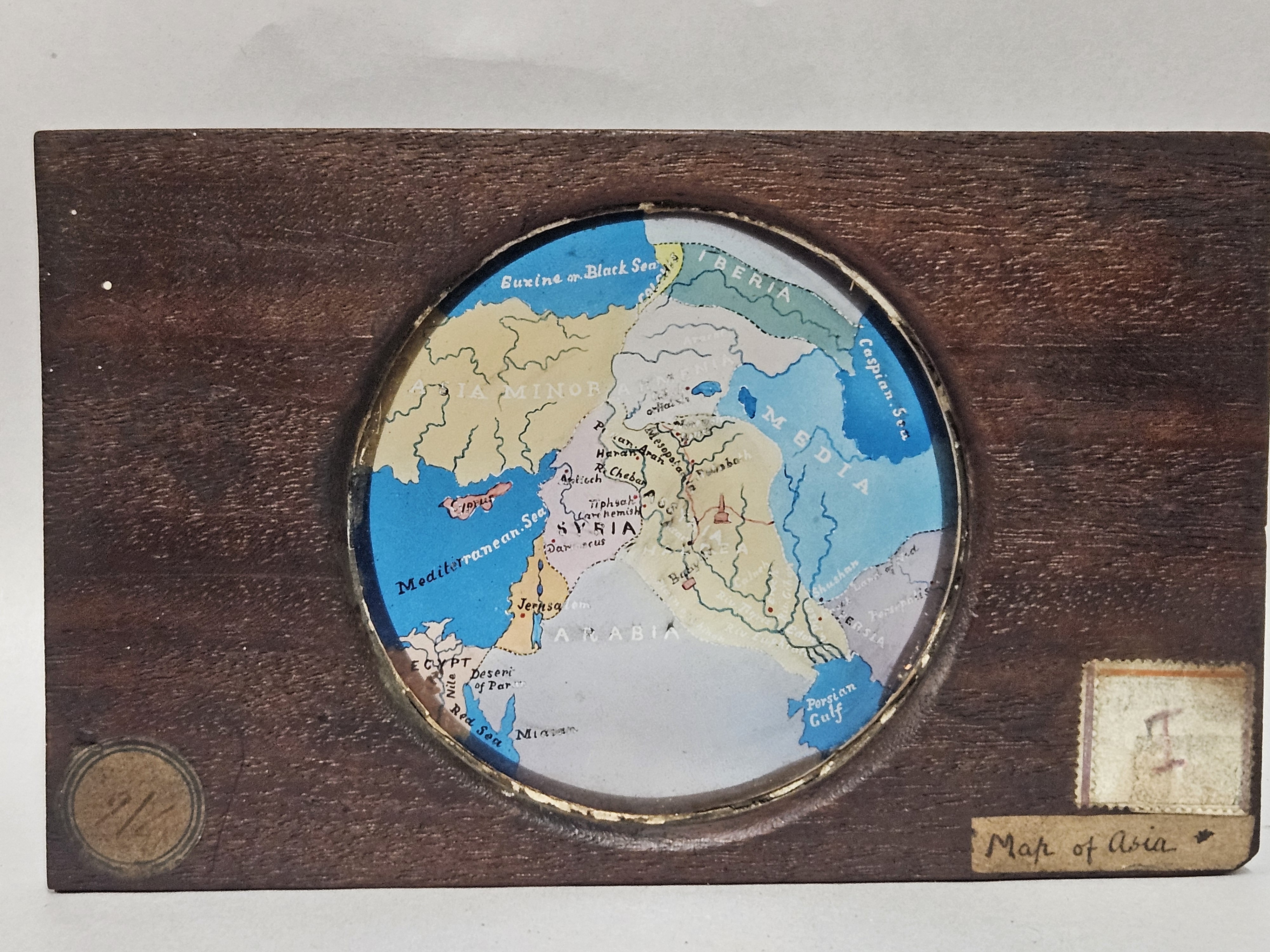 A set of fourteen 19th century, lantern slide, in wood mounts, various, including map of Asia, Solomon’s temple etc, by Newton London