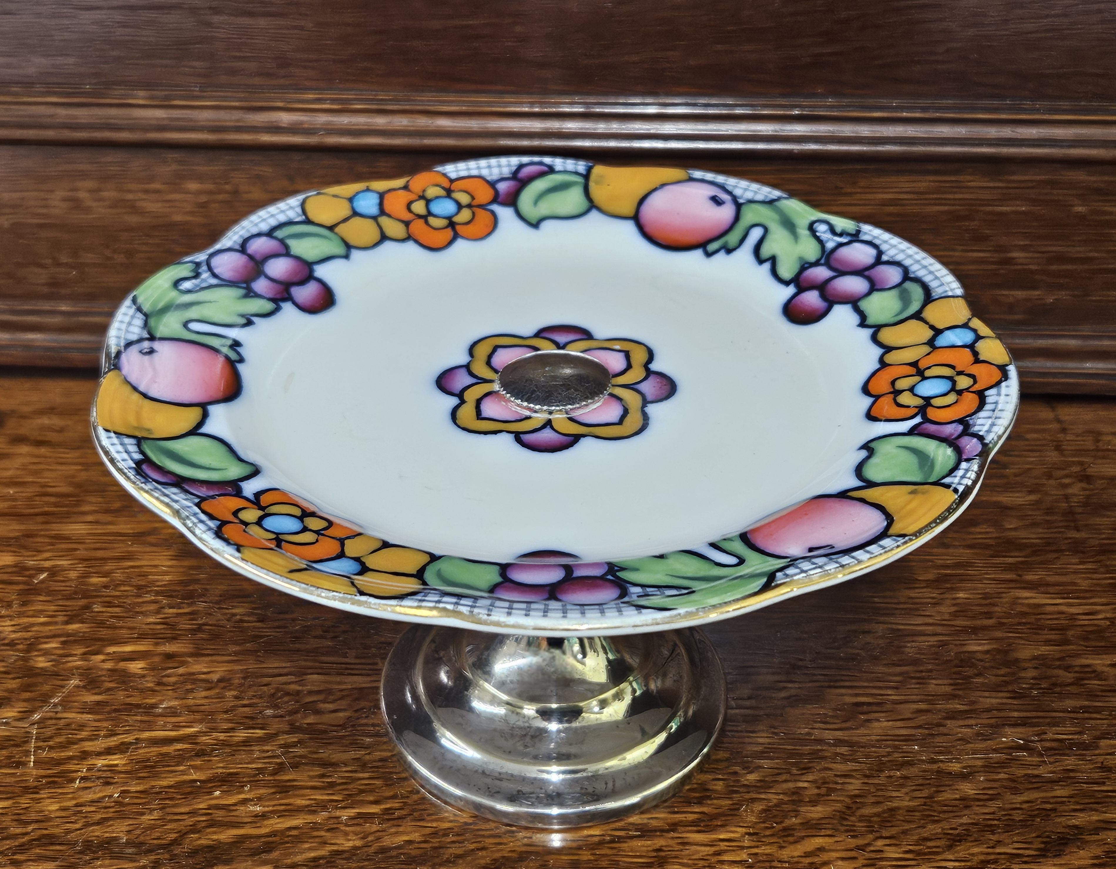 A Losolware cake stand in the Suntrae pattern, on plated support, Dia 22cm