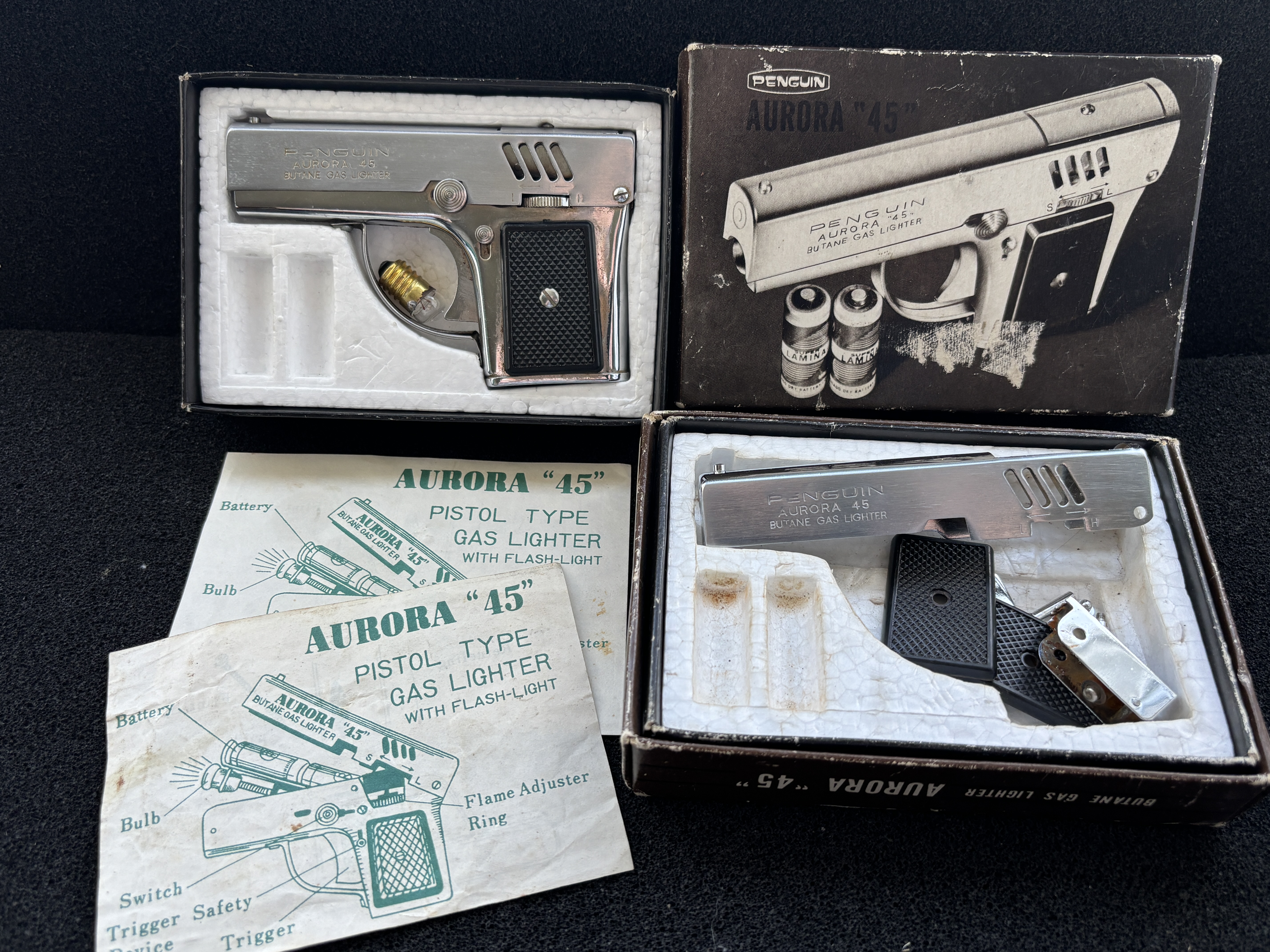 A second novelty lighter modelled as a pistol in box together with some spare parts