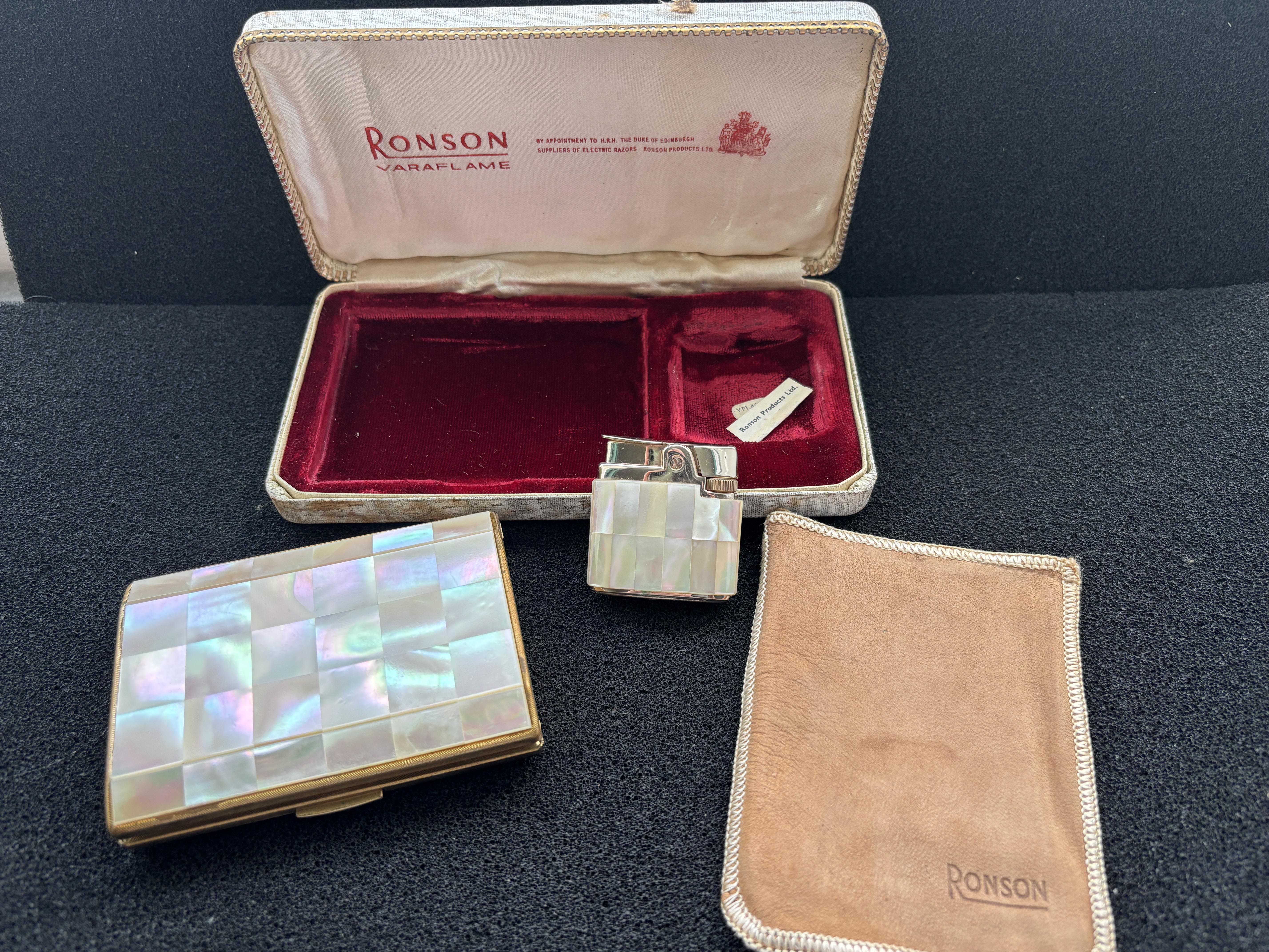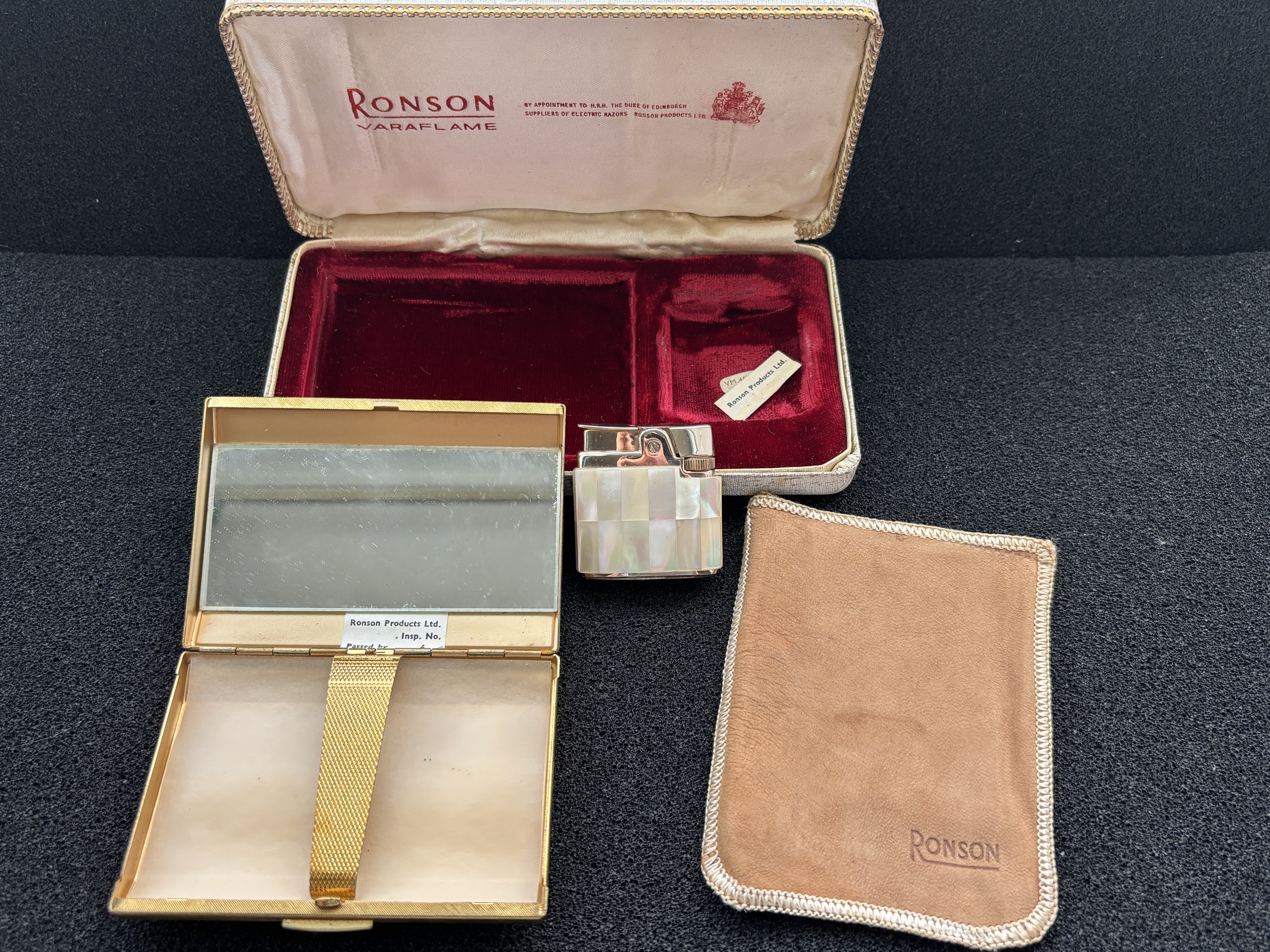 A Ladies Ronson Varaflame Mother of Pearl cigarette case and matching lighter in original box
