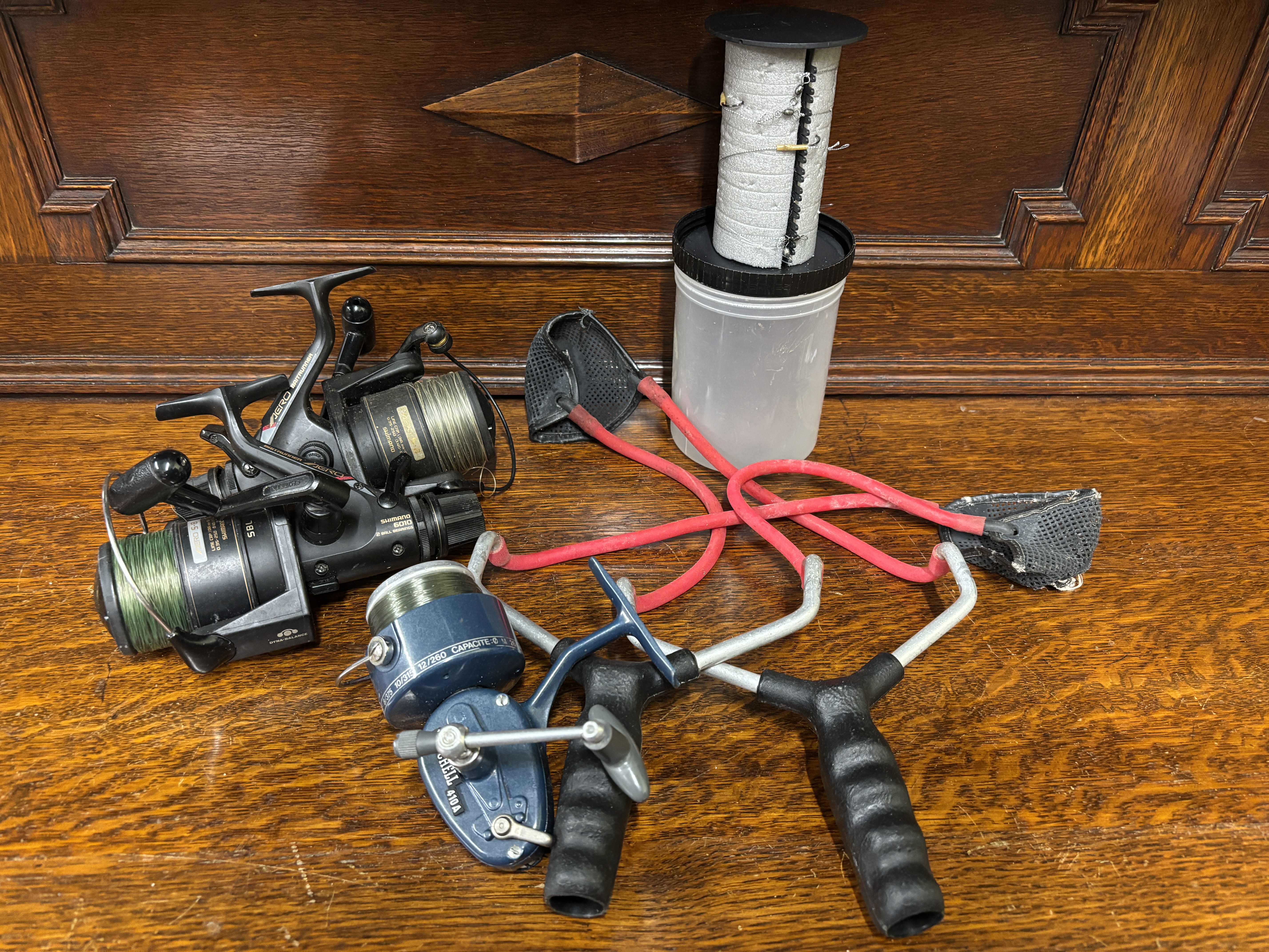 Fishing equipment, three reels, two catapults and a hook box