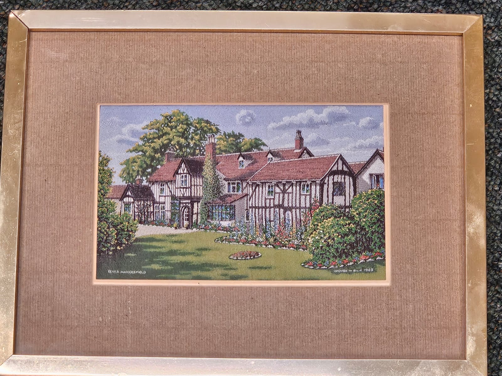 Four Brocklehurst Whiston (Macclesfield) Woven Silk Pictures featuring Gawsworth Old Rectory (1963), ‘Old Macclesfield’ (1961), The Wizard, Nether Alderley, Cheshire (1967) and ‘Prestbury Village with Austin Mini’, (c.1962) in matching frames measuring 25×31 cm